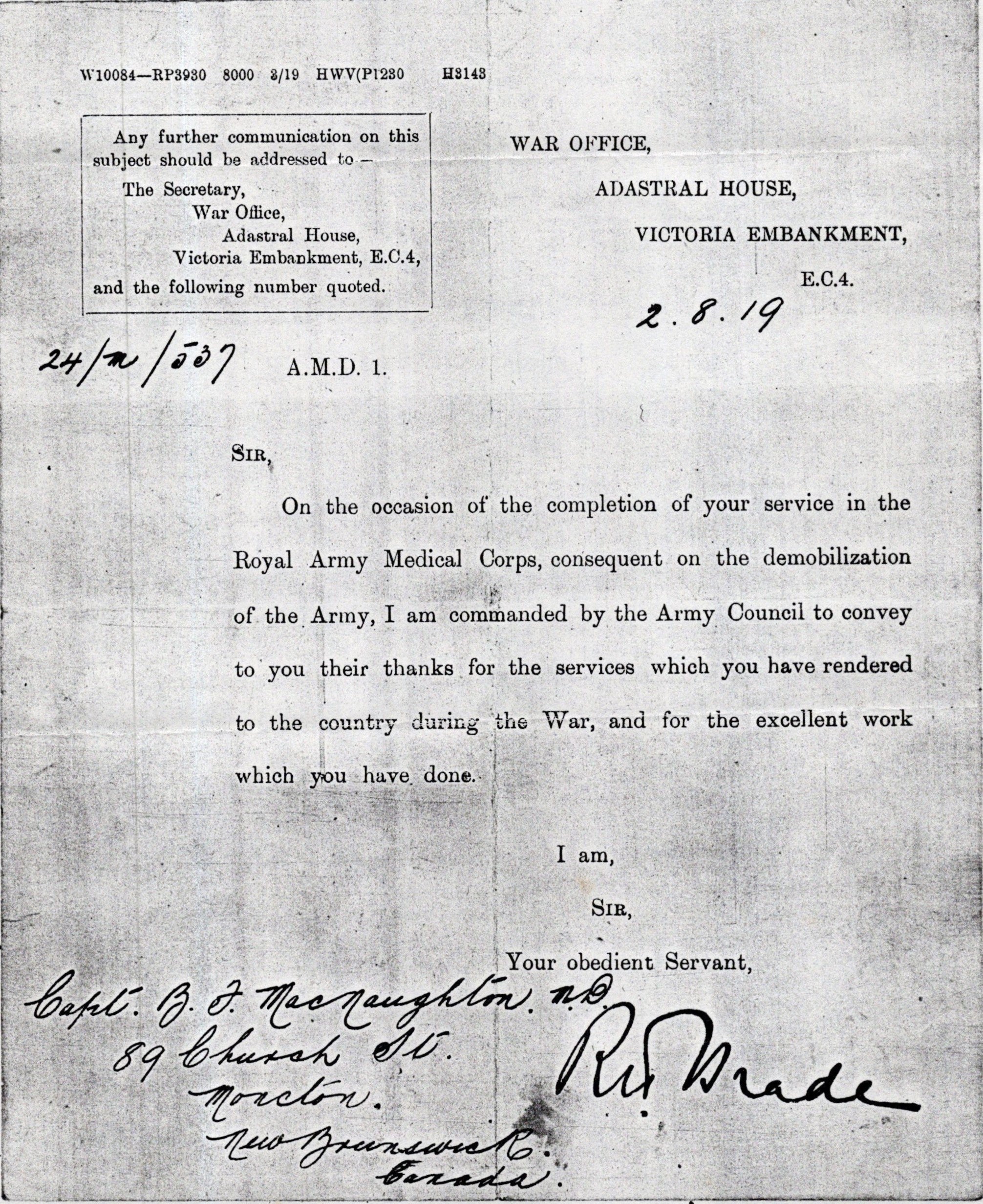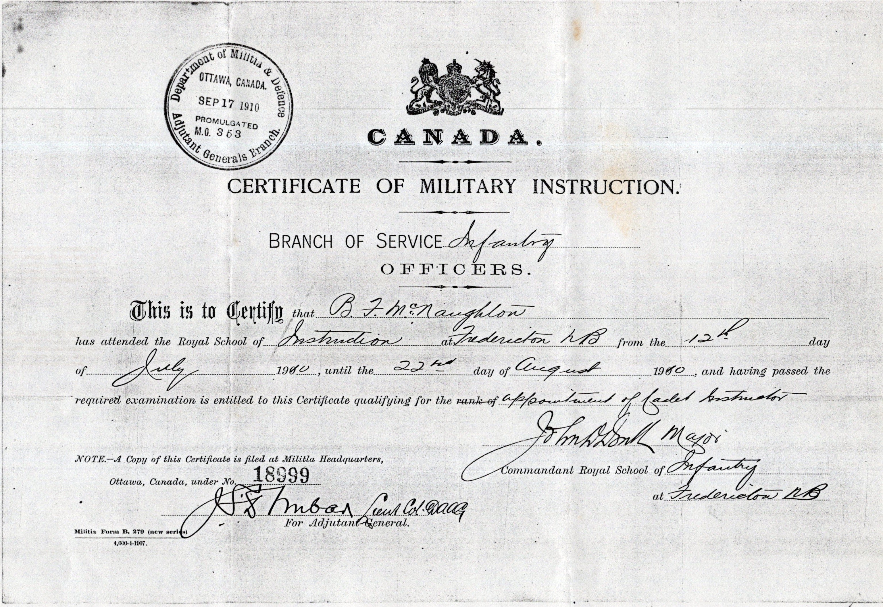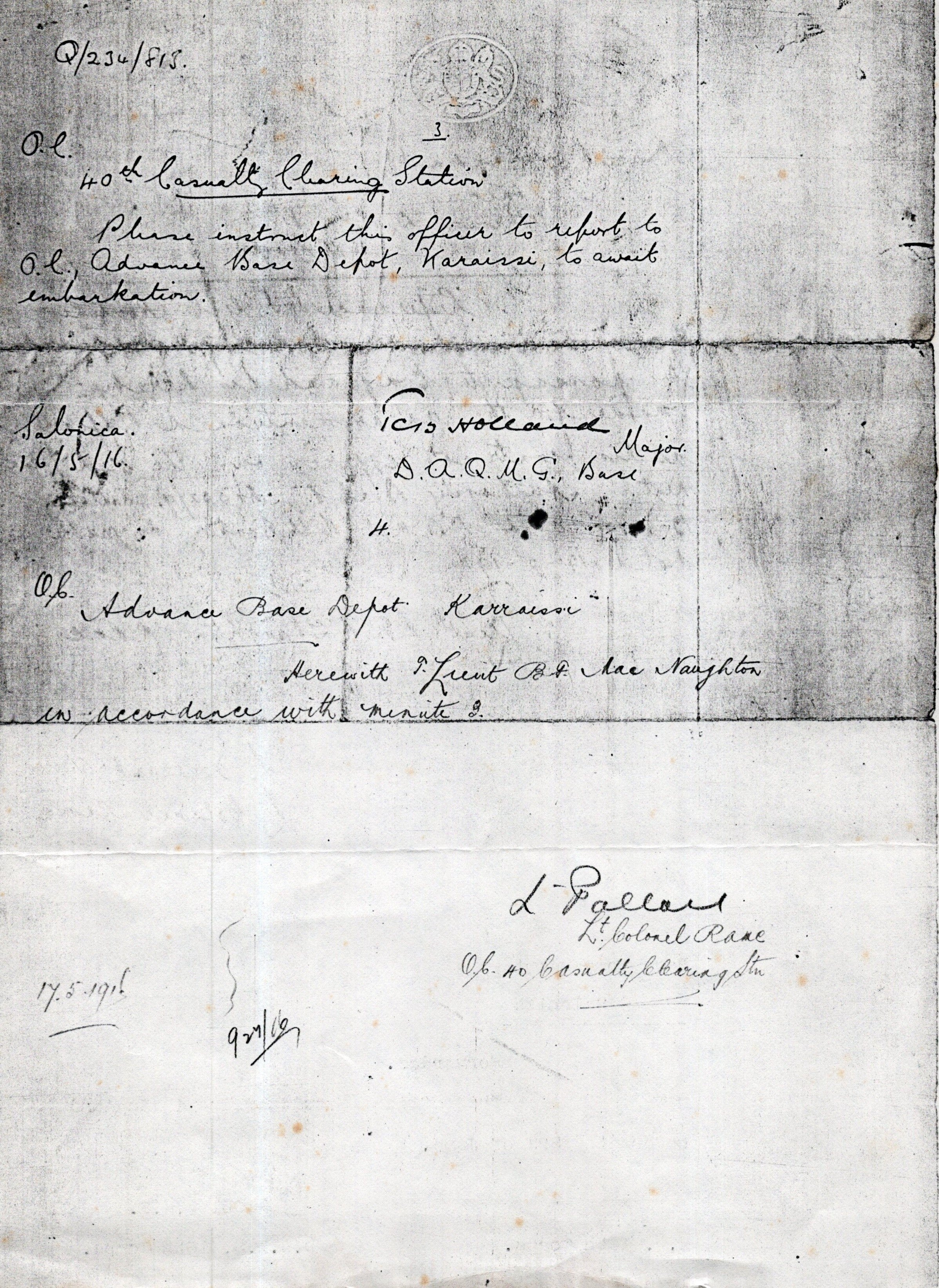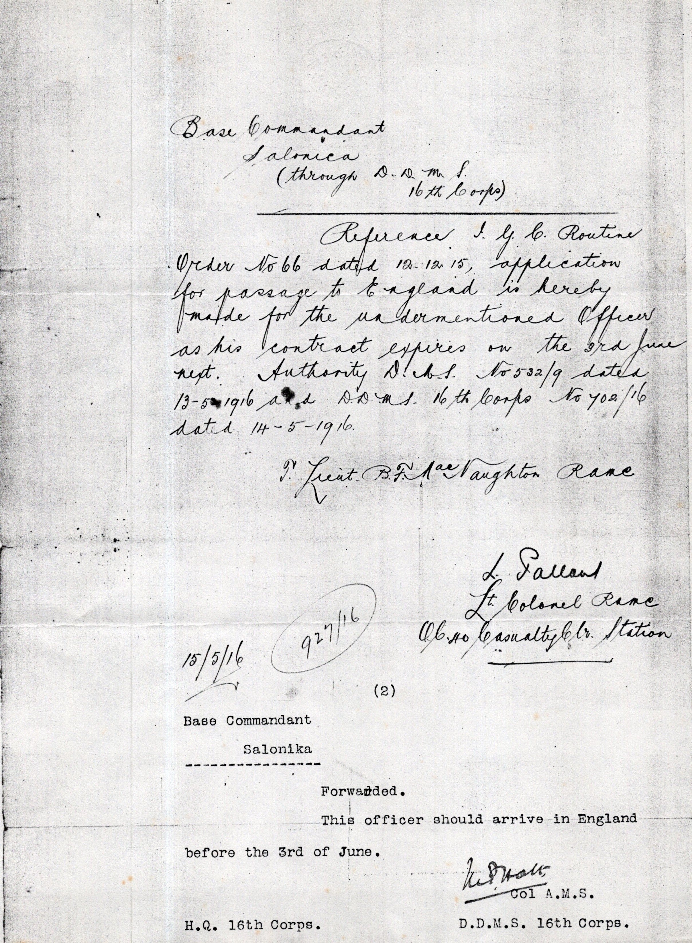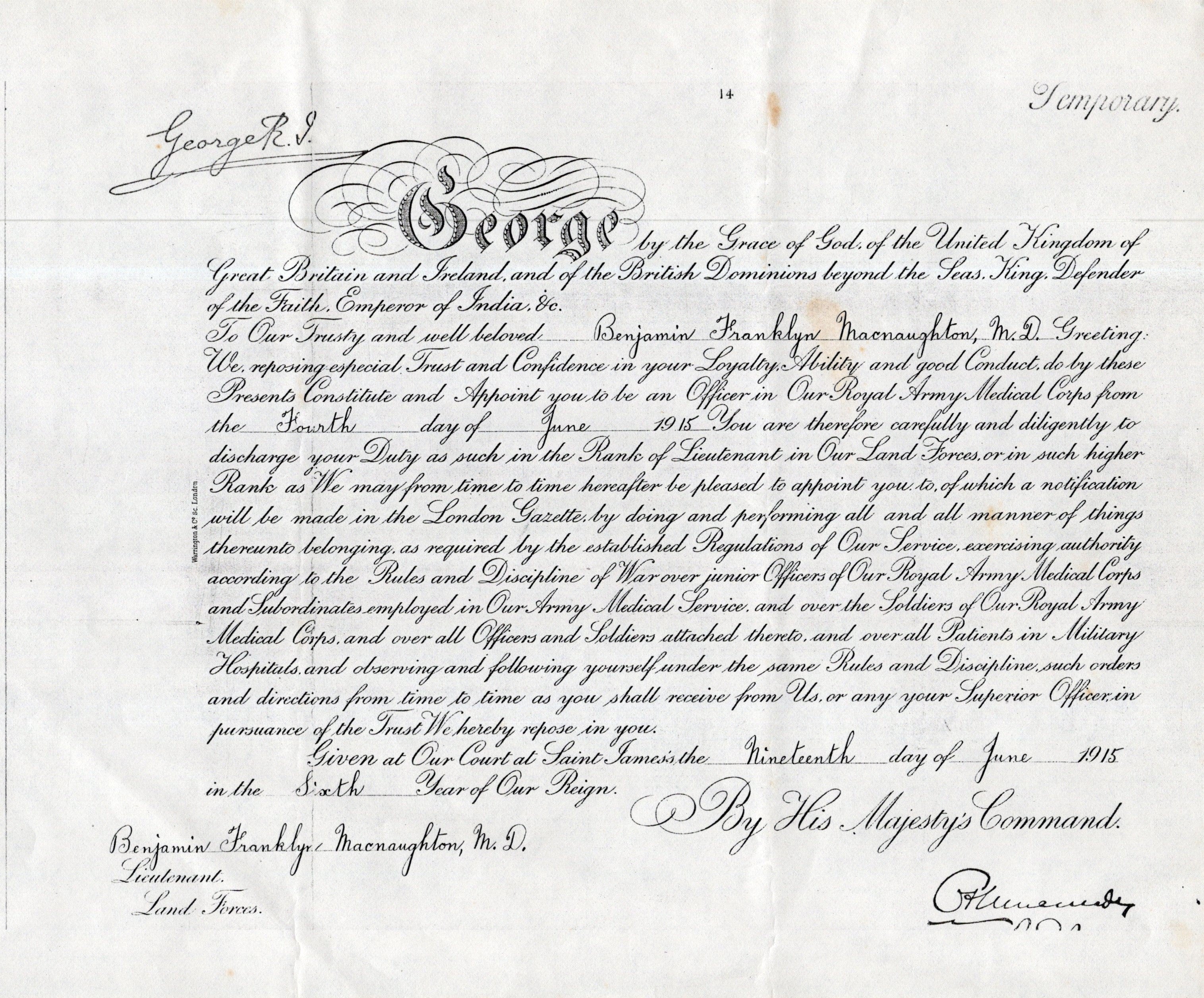 Accompanying the grouping is a file of copies of some of MacNaughton’s paperwork, which includes his Comission, Demobilization Certificate, Certificate of Insctruction as an Infantry Officer dated 1910, Liquor Permit, two orders from the 40th Clearing Station, Salonika, and his entrance Certificate with the St John’s Ambulance Corps.