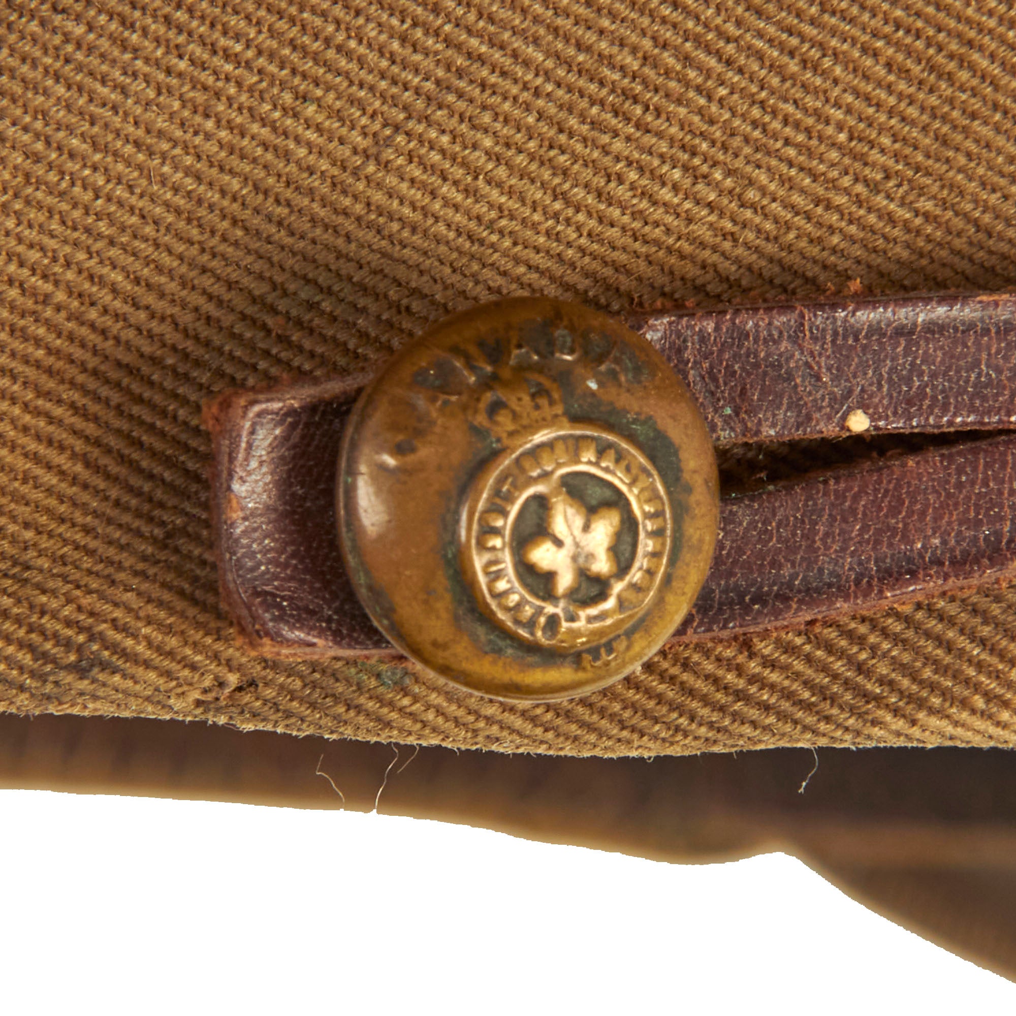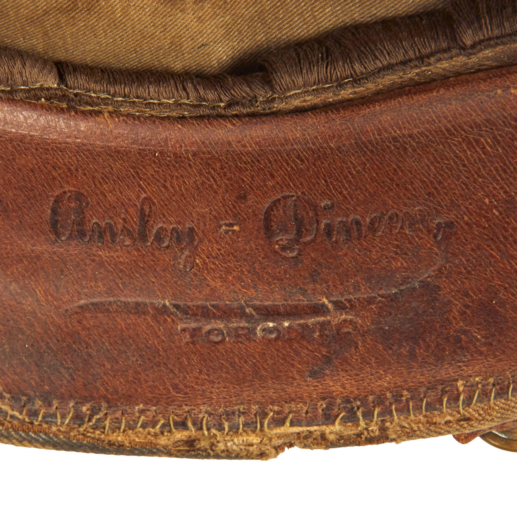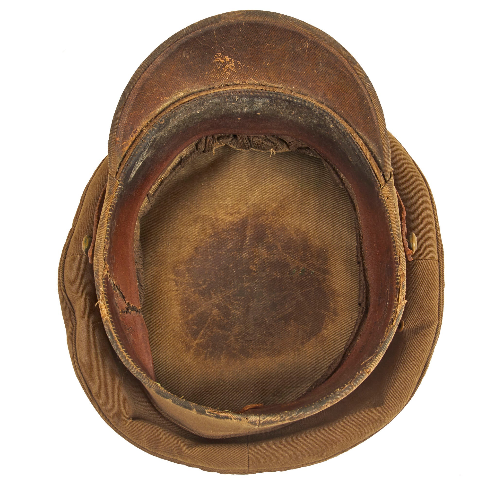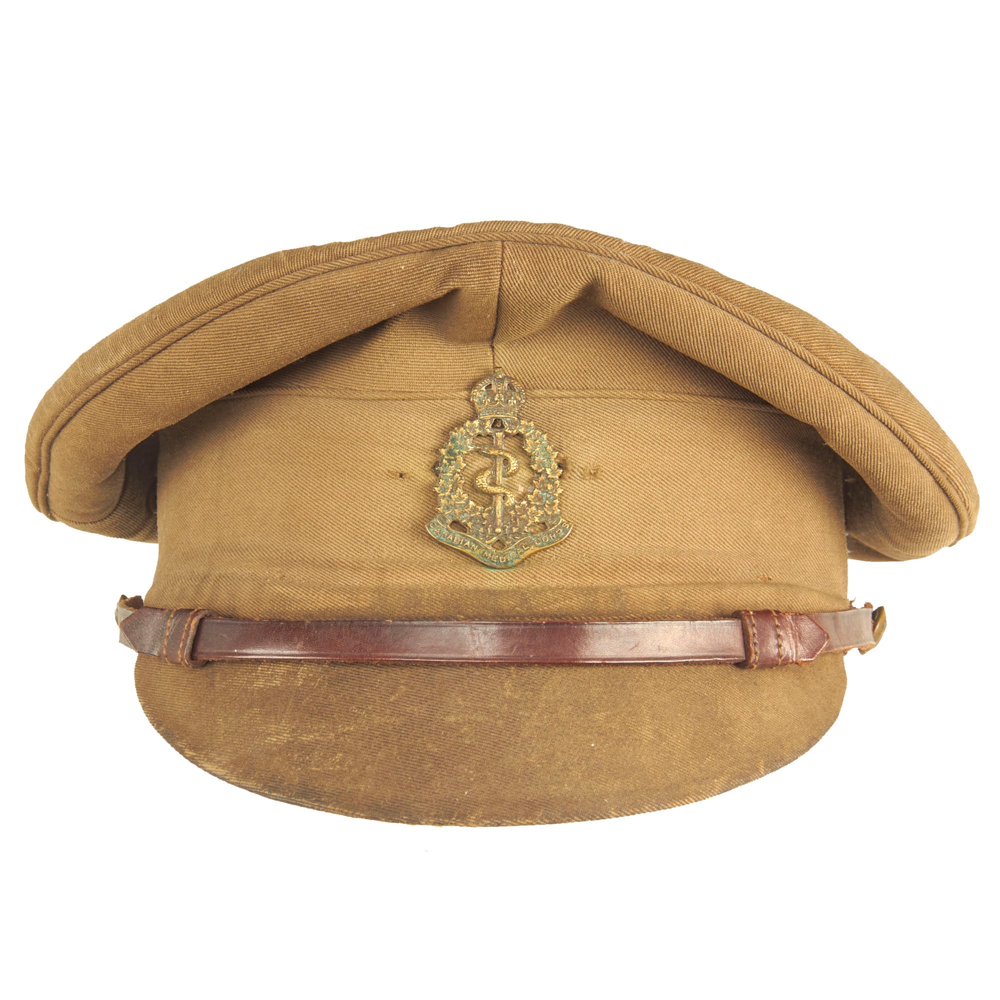 The Cap shows signs of heavy honest use. The cap retains its original unbroken leather chinstrap, and maker marked sweatband which is marked “Red English Leather” on one side, and the retailer’s information on the opposite “Ansley=Dineen/ Toronto”. The front of the cap features a Canadian Medical Corps Cap Badge which appears to have been affixed in place for well over 100 years. The cap shows evidence of being sweated in, and expose to the grime of a WWI Battlefield.