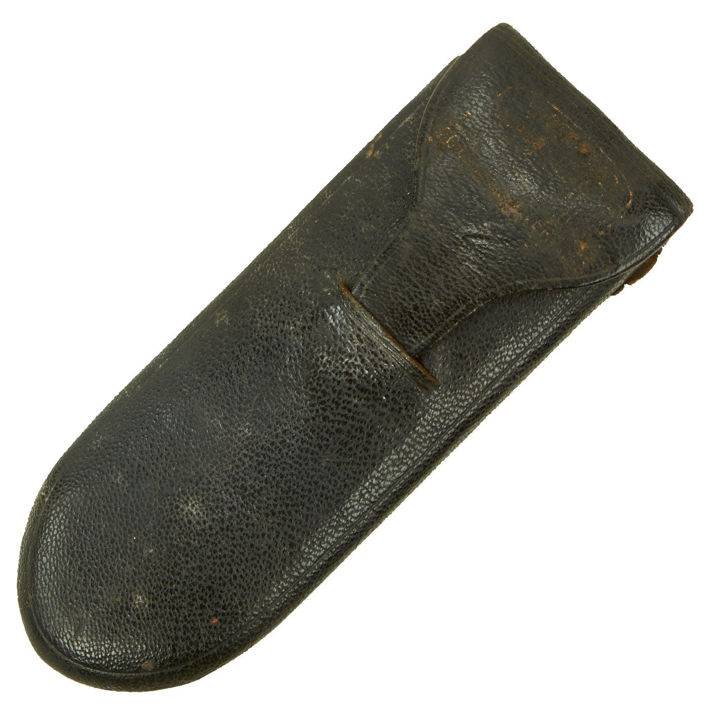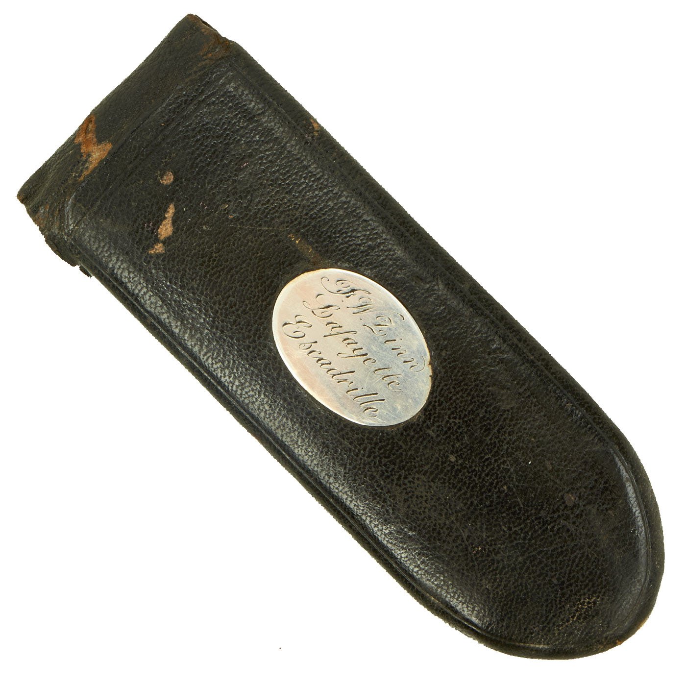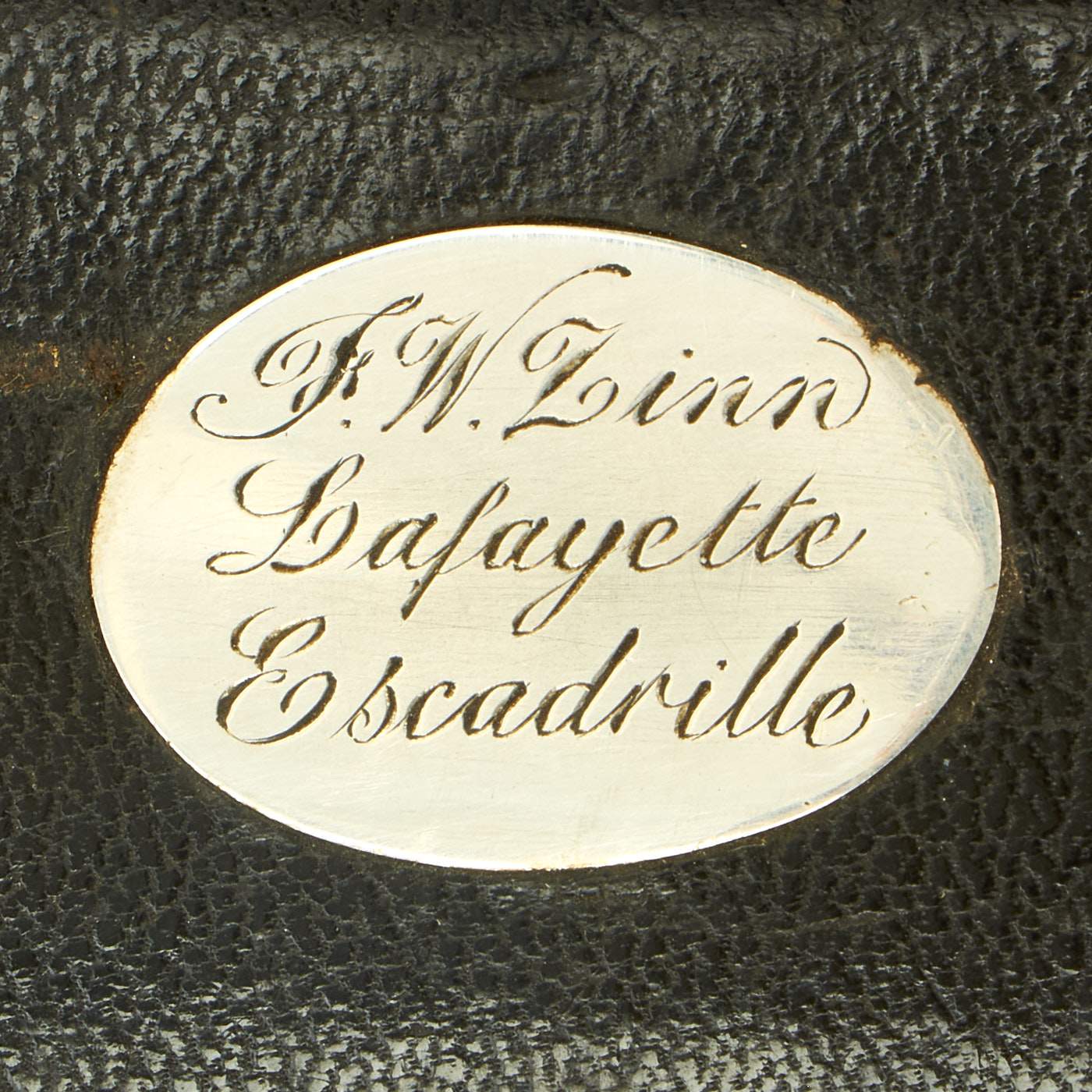 The case measures 5" x 1 ¾”, and has a faded maker mark on the closure flap. On the body there is an engraved oval Silver plaque, marked to Fred Zinn: