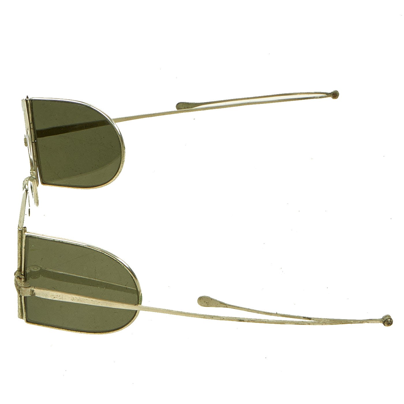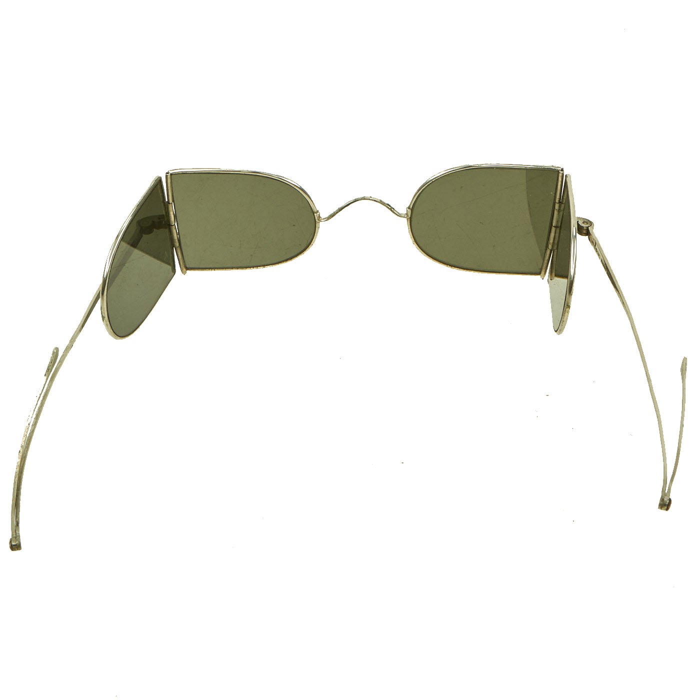 Original Item: One of a Kind. Here is a very interesting pair of aviator sunglasses with side windows, which fold away and come with a stiff leather pocket carrier. The design covers a wide field of view, making them perfect for early aviation. they measure 4 ½” inches across closed, and do not have any markings on them that we can see.