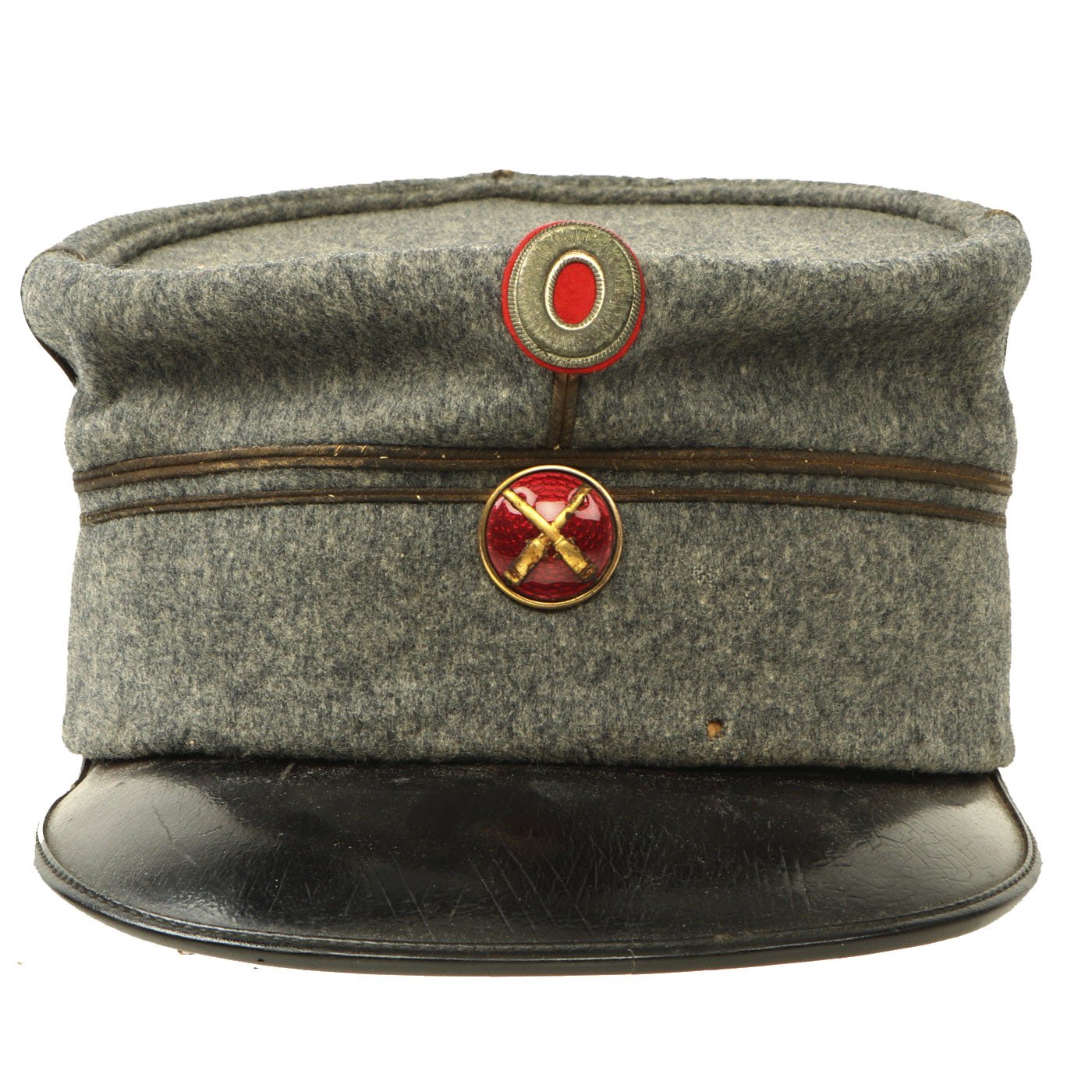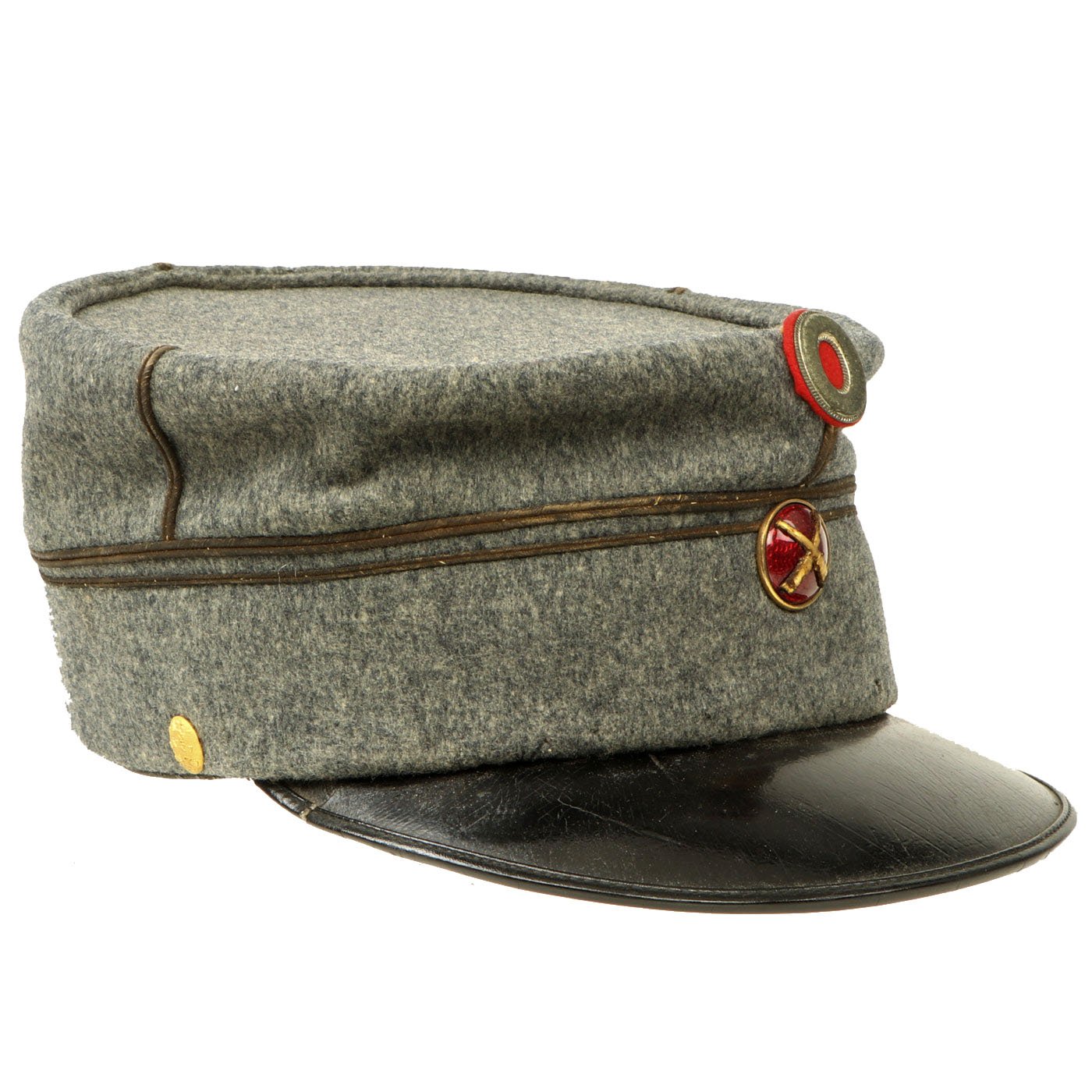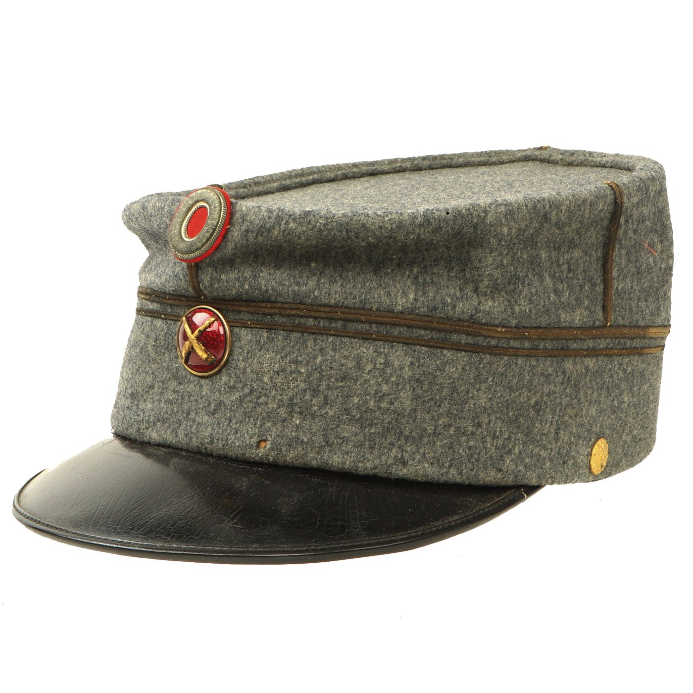 Original Item: Only One Available. A very nice and rare example of a World War One era Danish Army Artillery officer's kepi (M15). With WWI underway to the south of neutral Denmark, the Army decided to introduce a better-camouflaged uniform in 1915. The light gray was, in fact, a poorly-chosen color and was quickly deemed a temporary measure. Nevertheless, the gray uniform continued to be used up until 1939, although it was officially supplanted by the olive-green 1923 uniform. This cap features a very nice red enameled cross cannon pin and fine gold bullion piping. Size is approximately a US 7 (56cm) and the interior crown red silk fabric is torn, otherwise offered in near excellent condition.