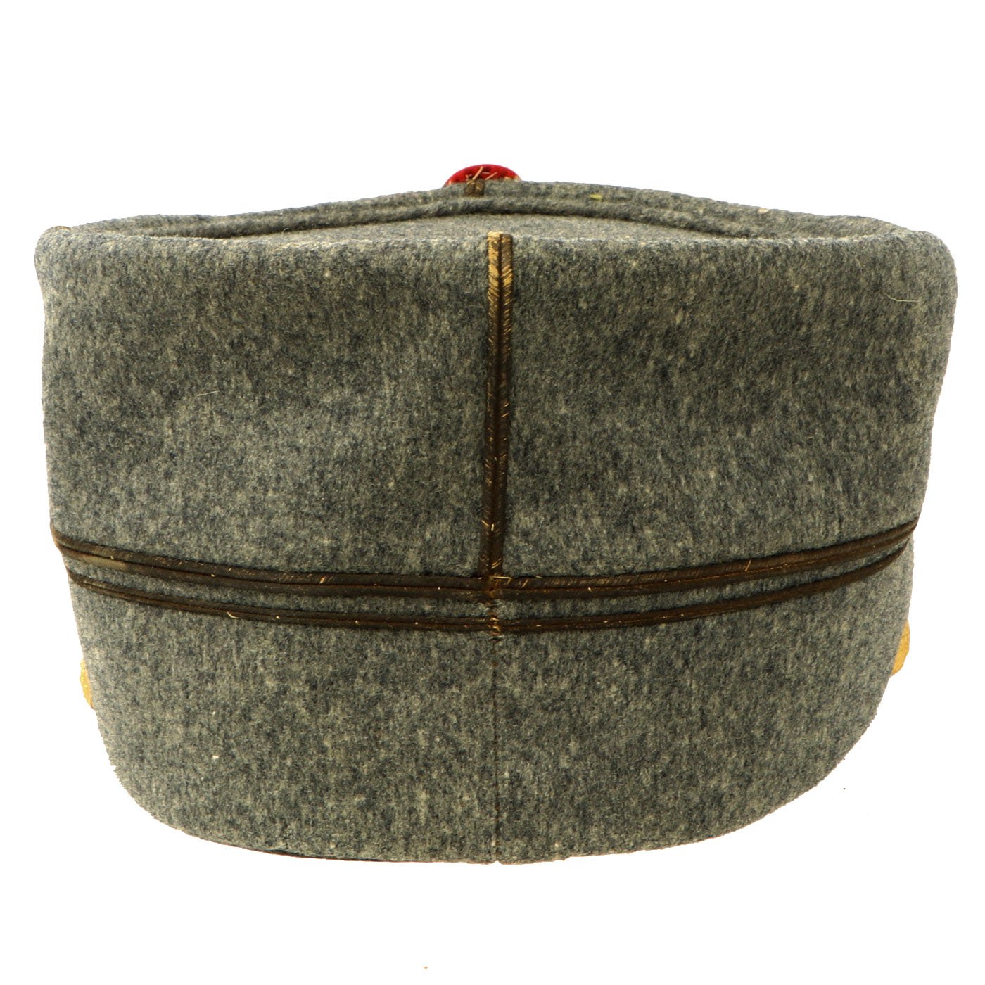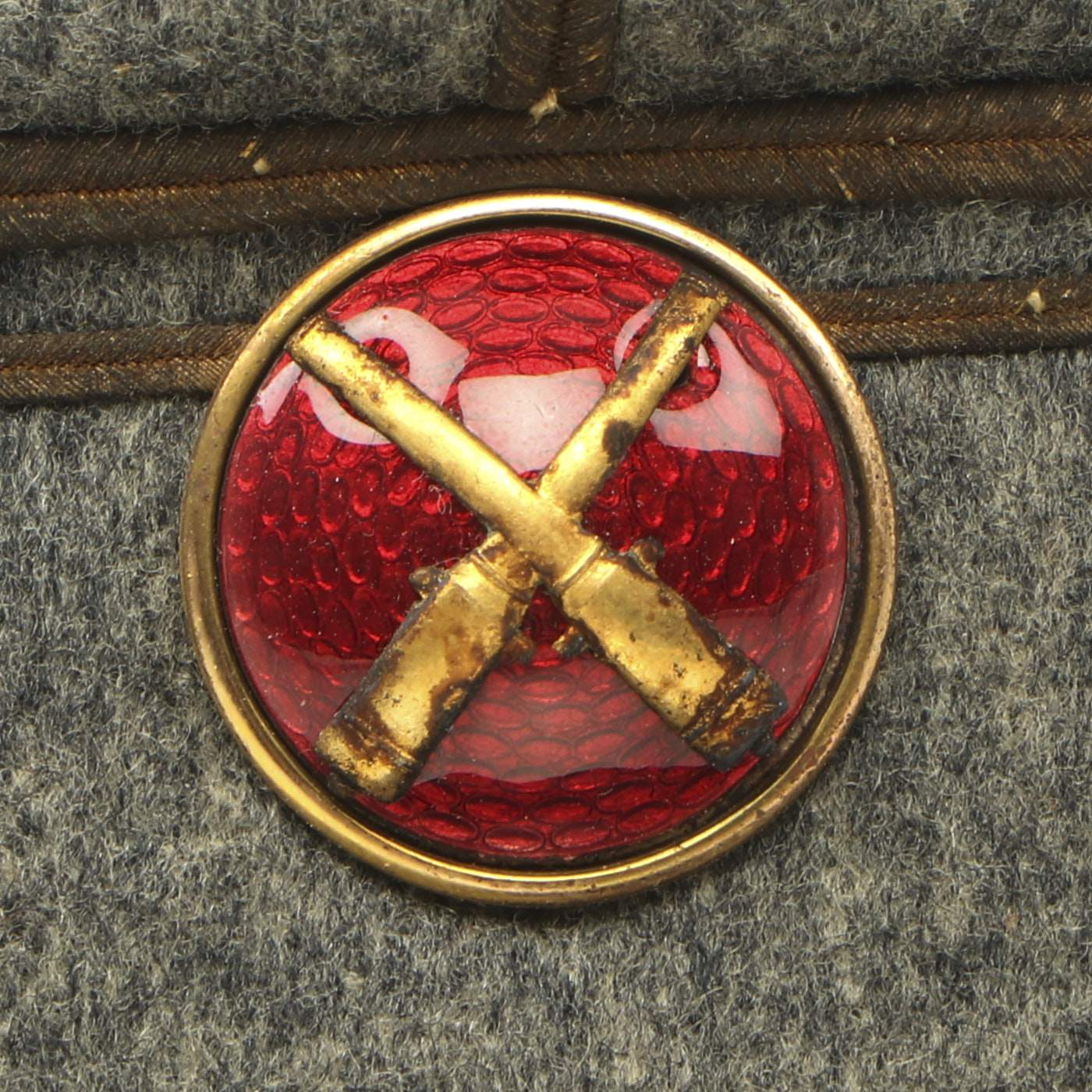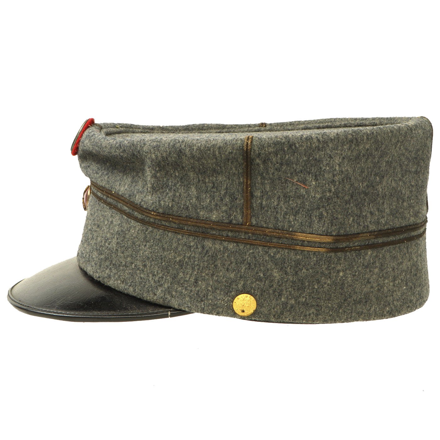 Original Item: Only One Available. A very nice and rare example of a World War One era Danish Army Artillery officer's kepi (M15). With WWI underway to the south of neutral Denmark, the Army decided to introduce a better-camouflaged uniform in 1915. The light gray was, in fact, a poorly-chosen color and was quickly deemed a temporary measure. Nevertheless, the gray uniform continued to be used up until 1939, although it was officially supplanted by the olive-green 1923 uniform. This cap features a very nice red enameled cross cannon pin and fine gold bullion piping. Size is approximately a US 7 (56cm) and the interior crown red silk fabric is torn, otherwise offered in near excellent condition.