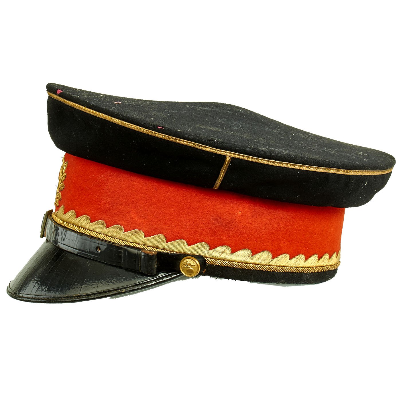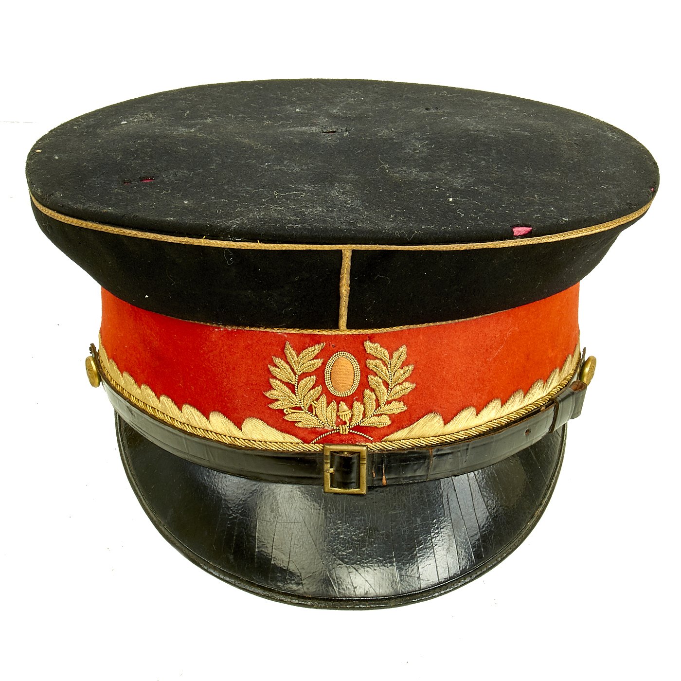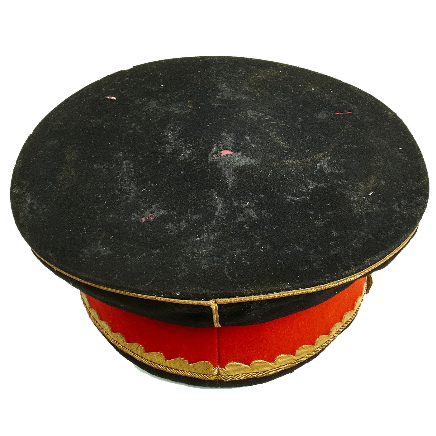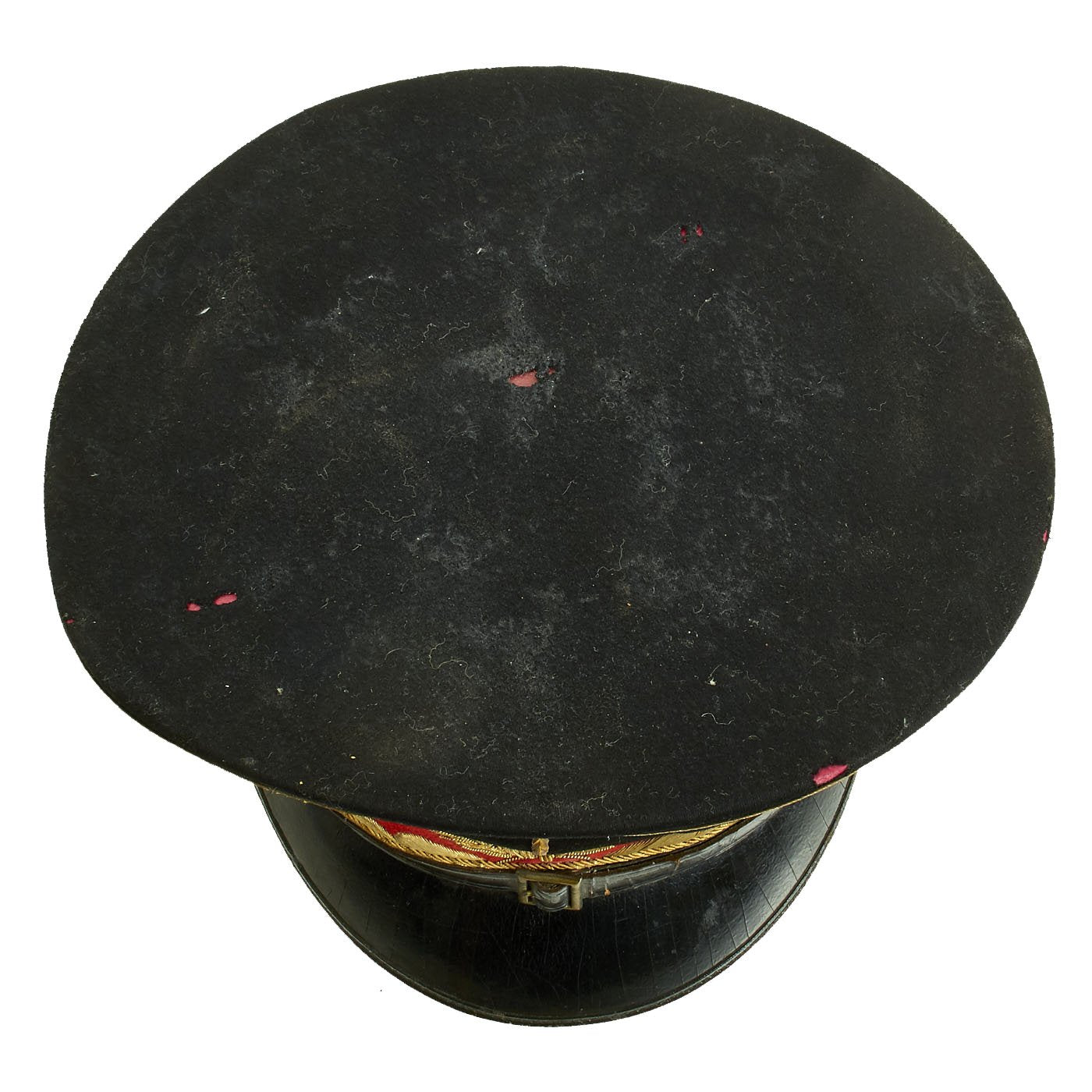 The leather sweatband is separating in areas from the cap, primarily on the reverse side. Red cloth liner is in fine condition with minimal sweat a=stains. There is a gilt maker mark on the lining, but it has worn away and it is therefore hard to determine the manufacturer and origin.