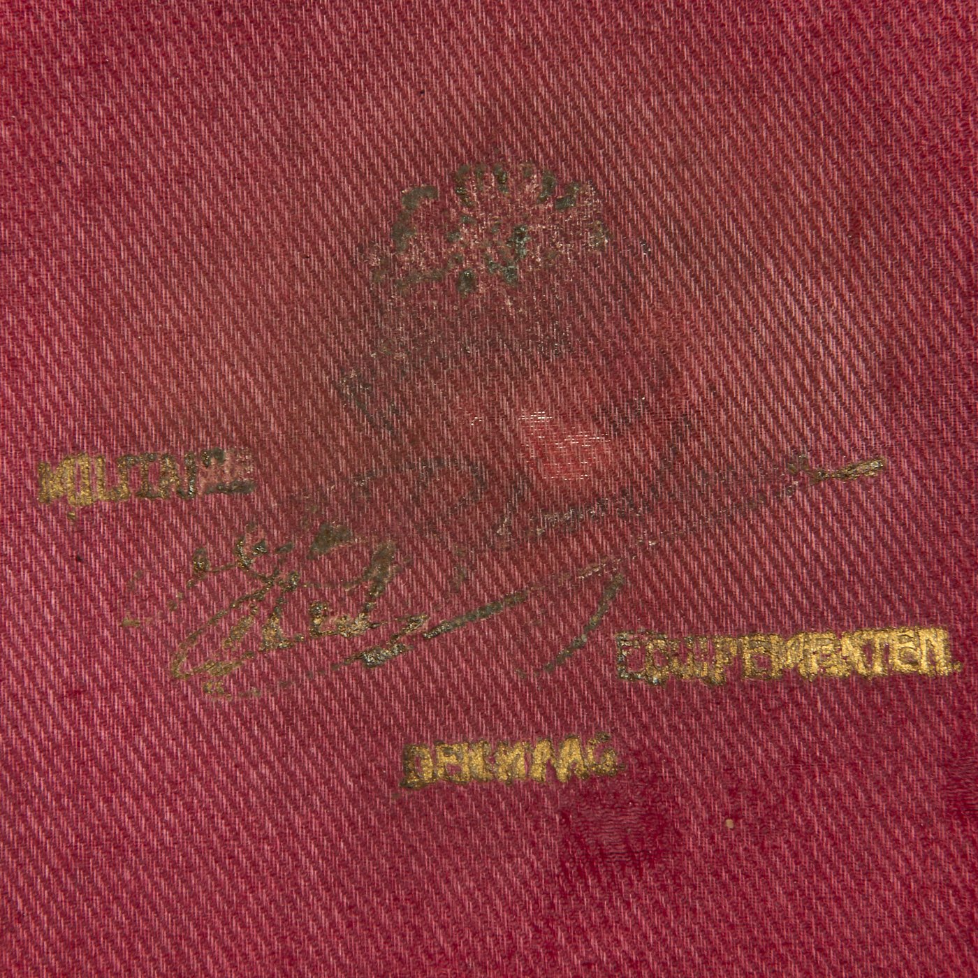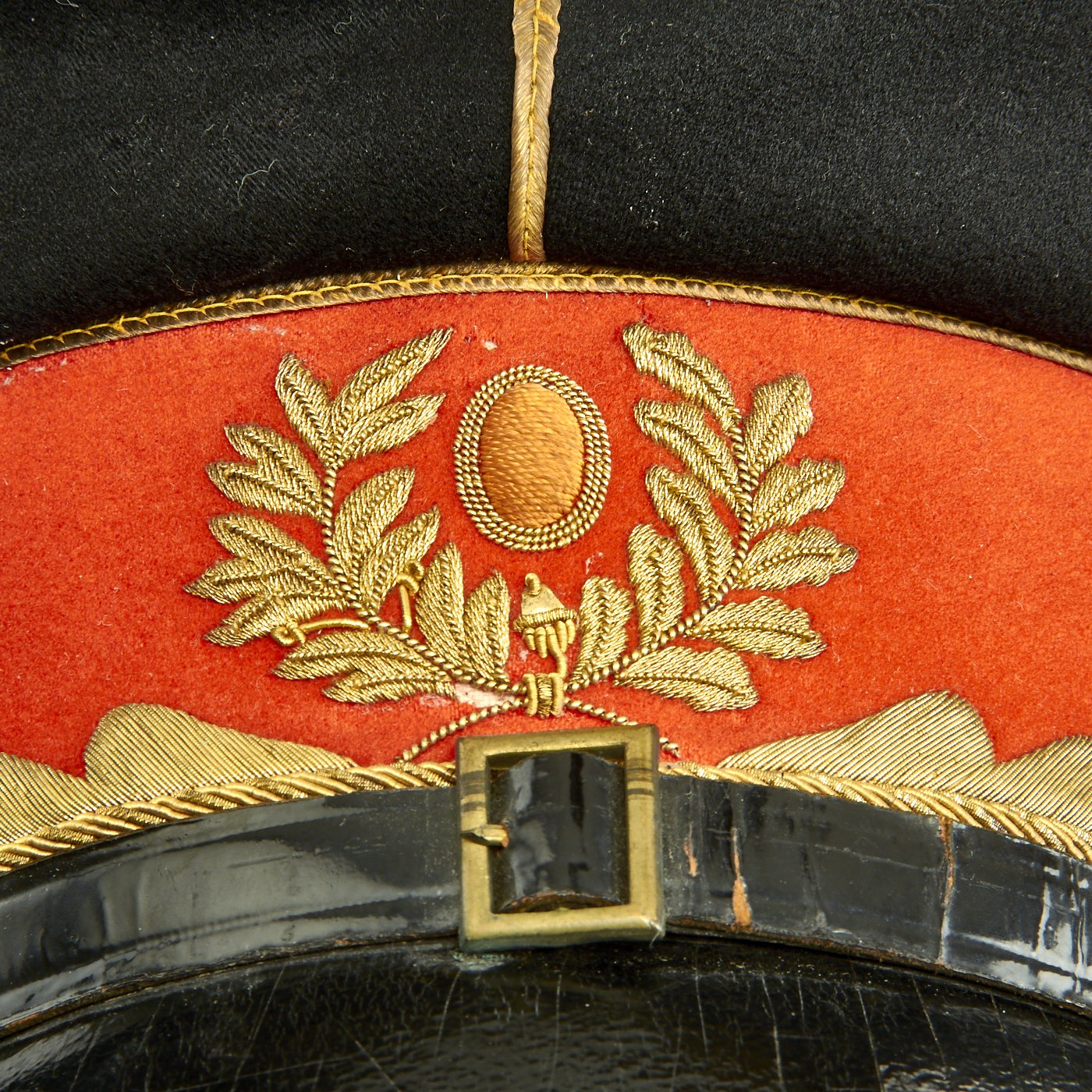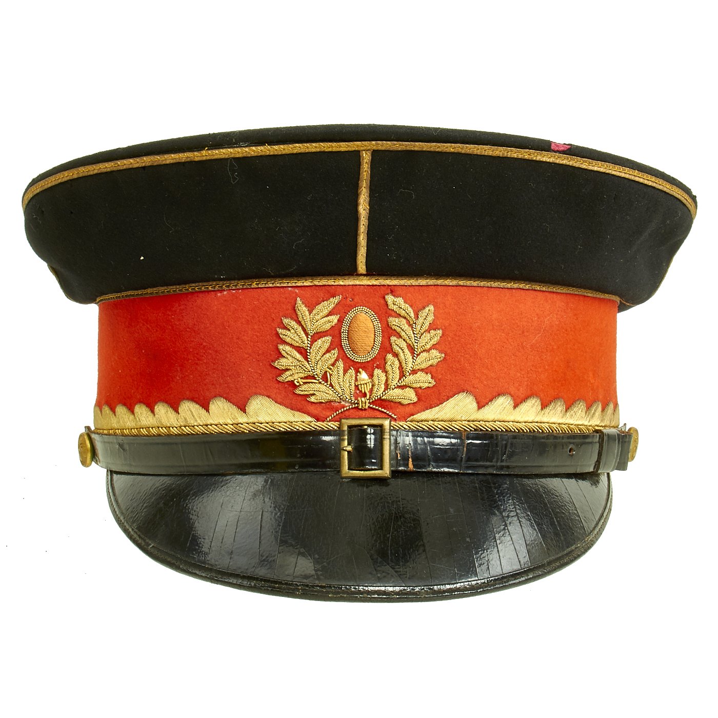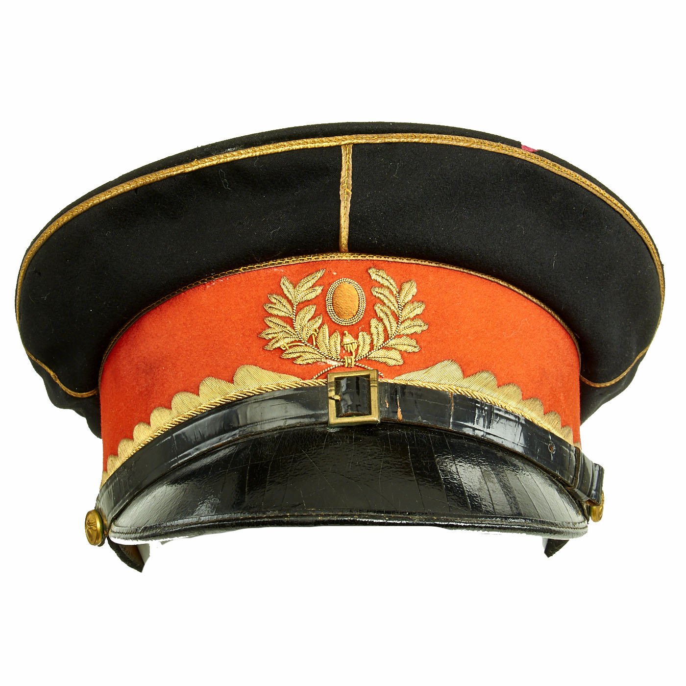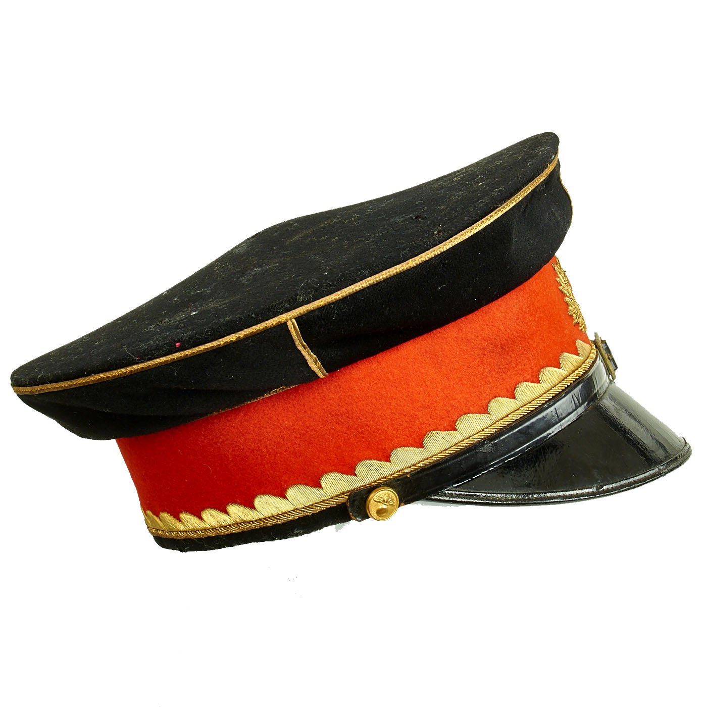 The leather sweatband is separating in areas from the cap, primarily on the reverse side. Red cloth liner is in fine condition with minimal sweat a=stains. There is a gilt maker mark on the lining, but it has worn away and it is therefore hard to determine the manufacturer and origin.