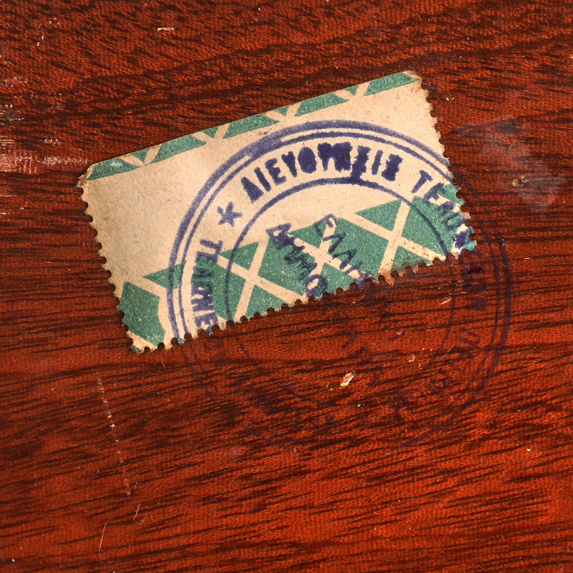 The inside of the case shows all of the original calibration information for the sextant, which would be factored in while using it. There are Dutch inspection markings as well, however we can also see some Greek cartouches, indicating that the Sextant and most likely the ship she was on was sold to a Greek concern in the 1930s.