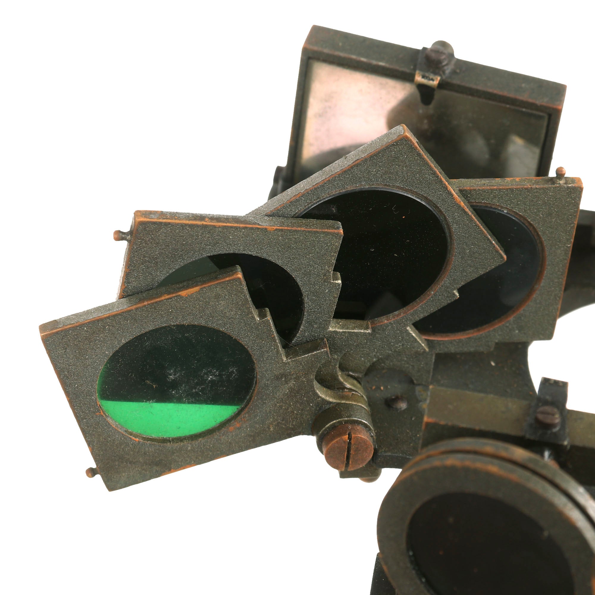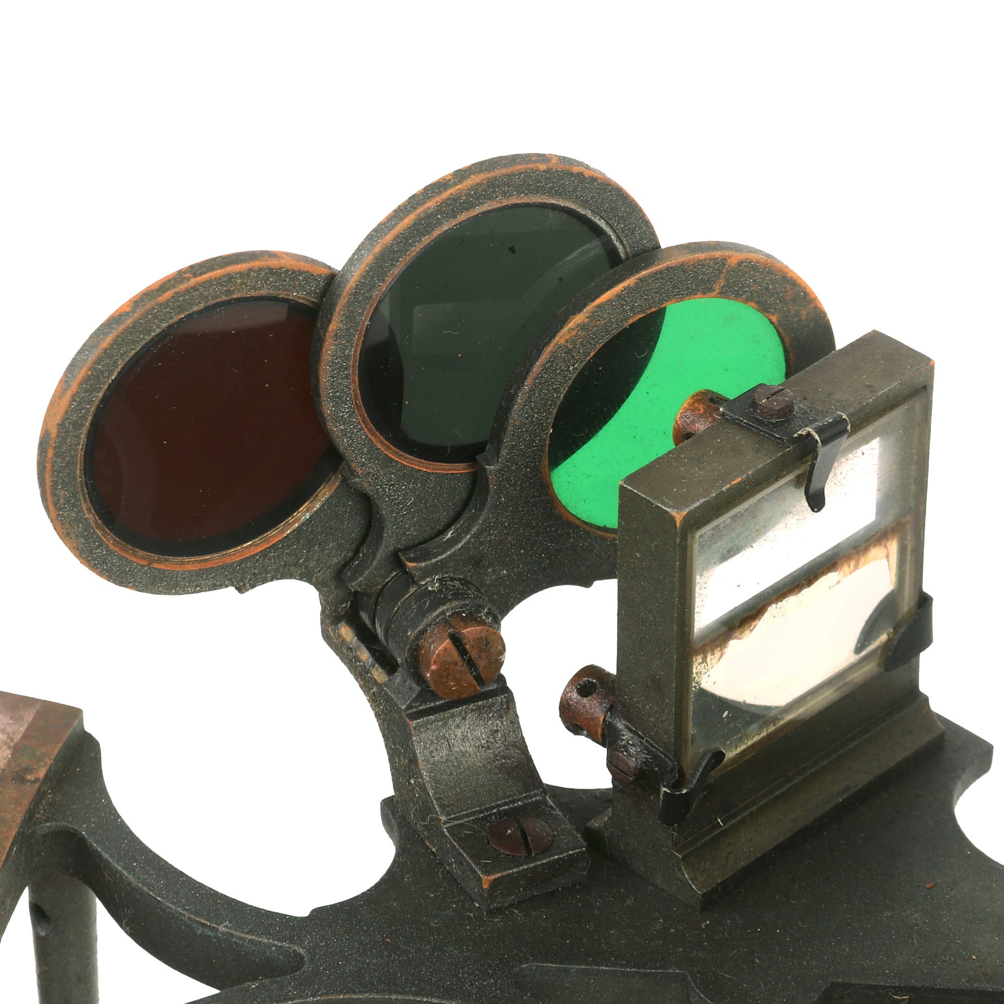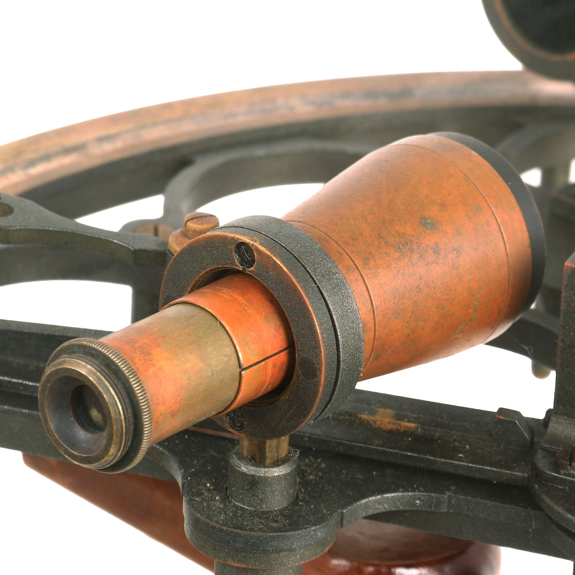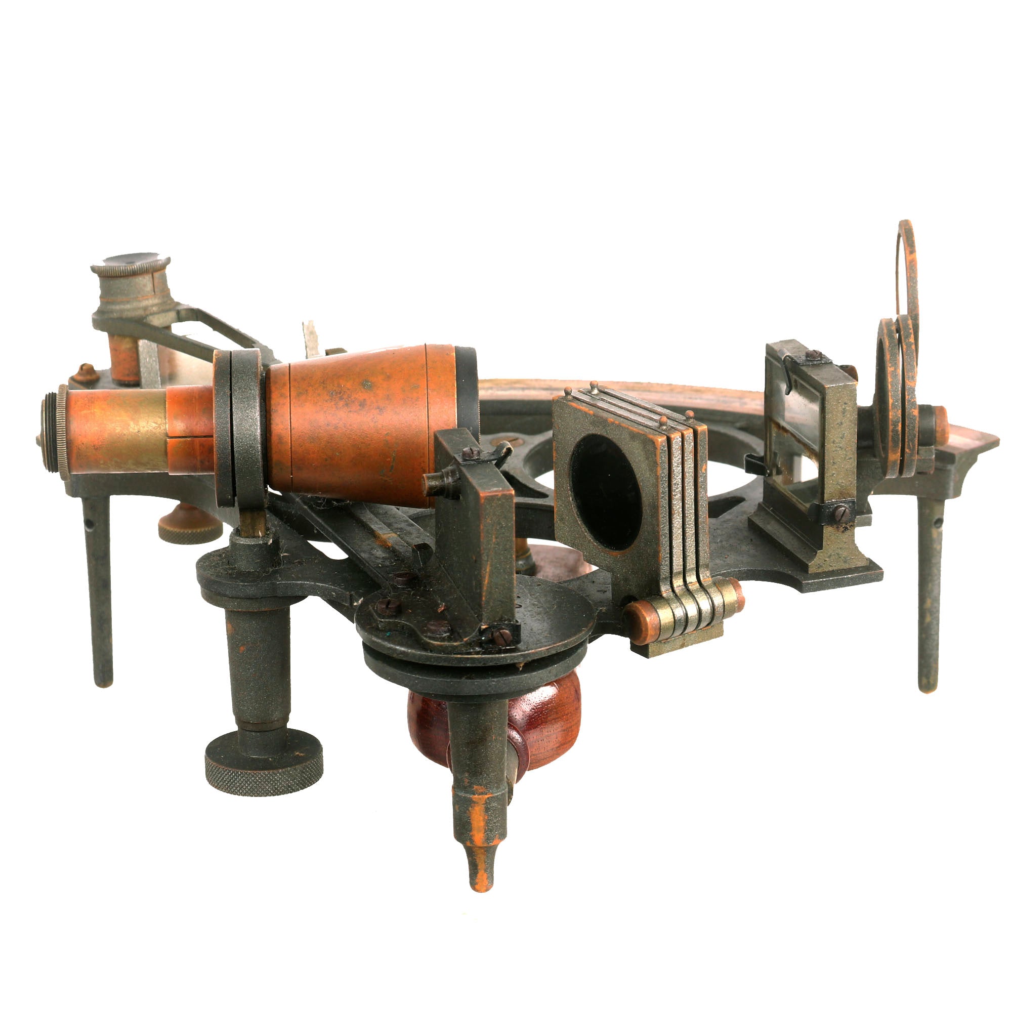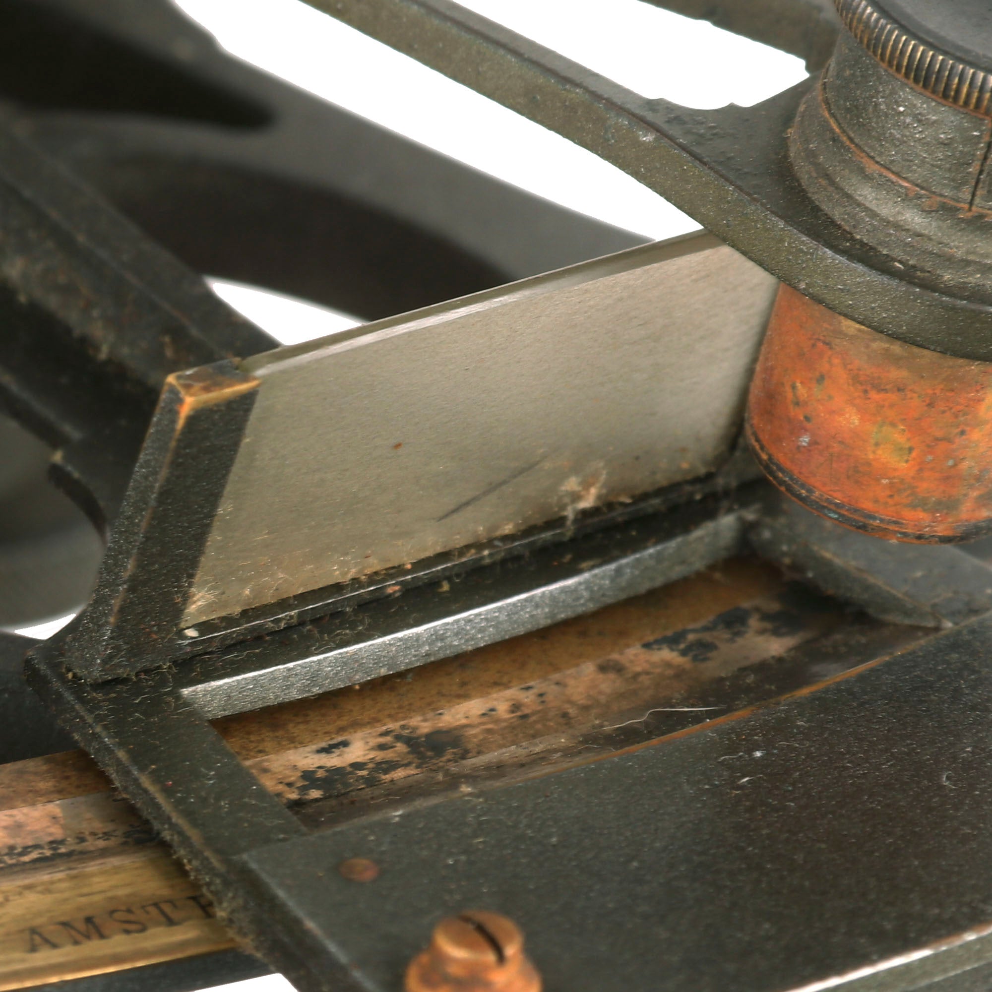 The sextant is almost entirely non-magnetic, and we believe it is made from painted or tin plated brass, which shows wear through along many of the sharp edges. The raw brass areas now have a lovely reddish patina, caused when the zinc in the brass leaches out of the alloy surface. The arc on the sextant looks to be 150 degrees, though it is hard to read due to the condition of the finish. As best we can tell, it should still work, but definitely needs cleaning and adjustment.
