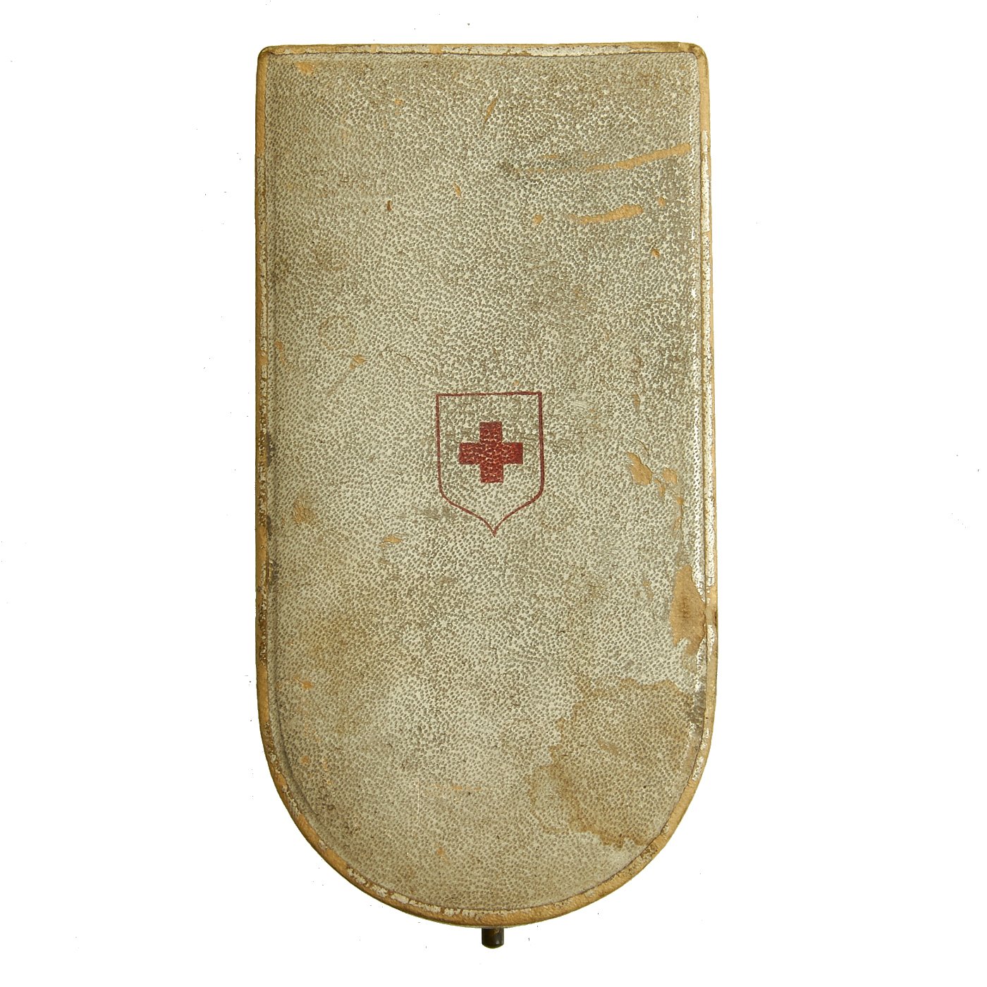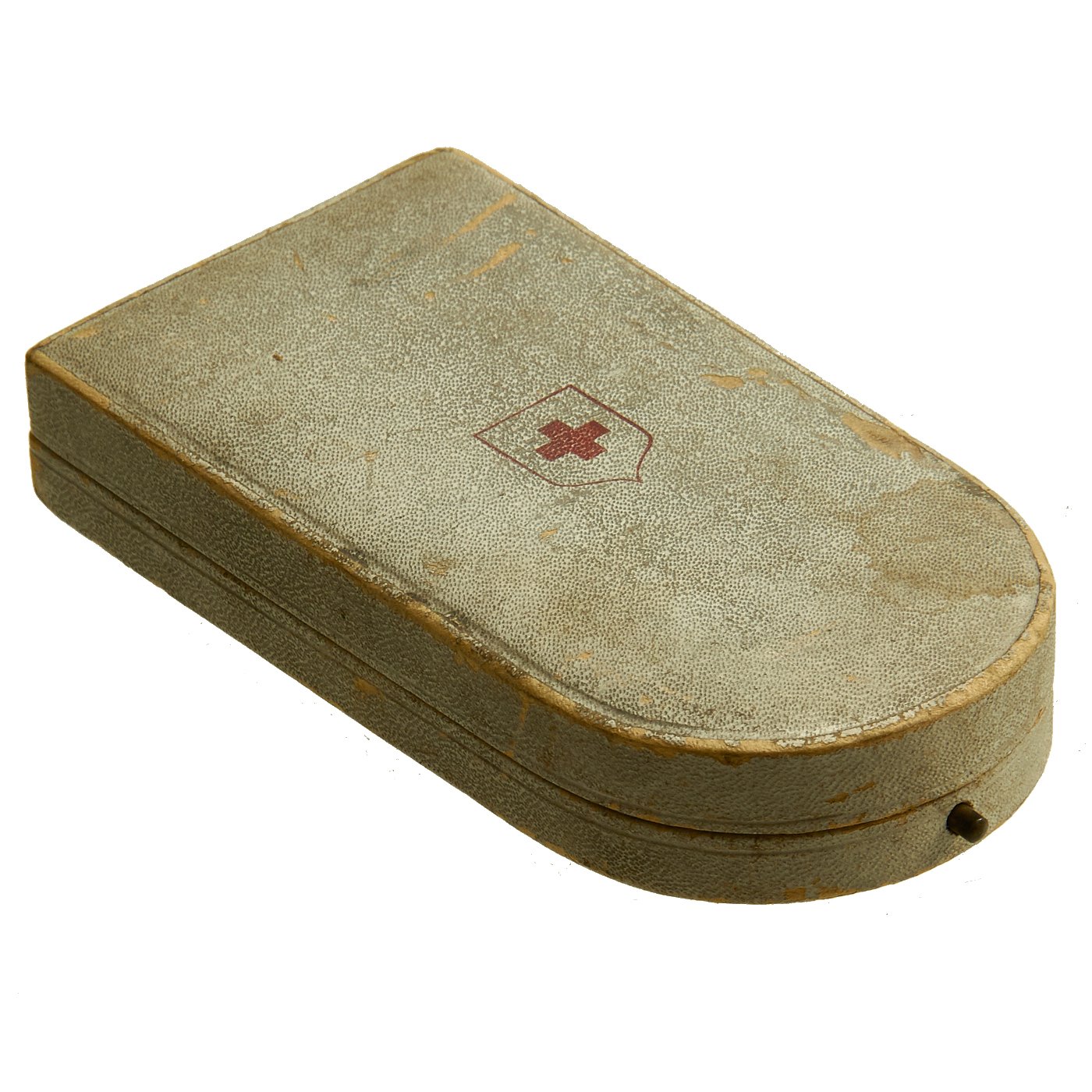 The original case has the correct "Order of the Red Cross" insignia on the top, and has an intact catch and hinge. The internal velvet inset bottom is intact, as is the satin lid lining, though the satin hinge cover has torn, as often seen.