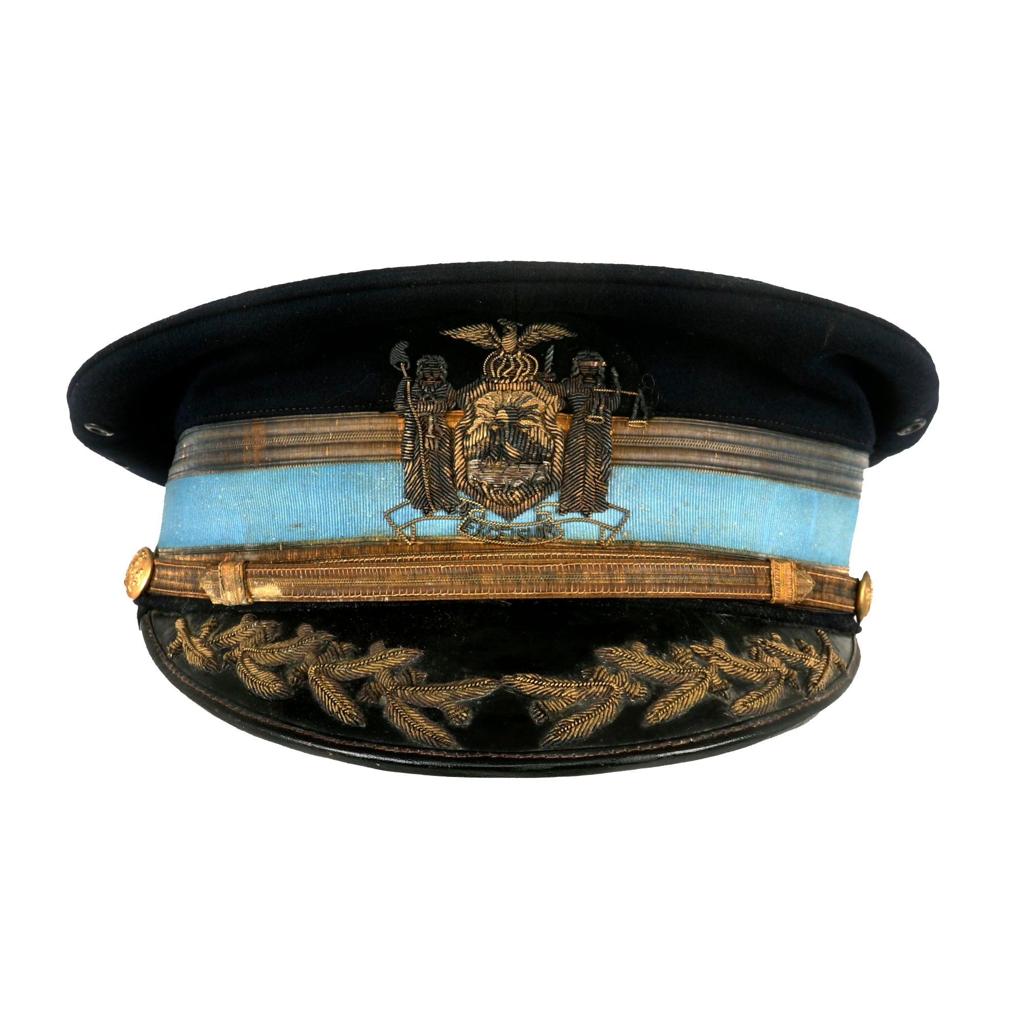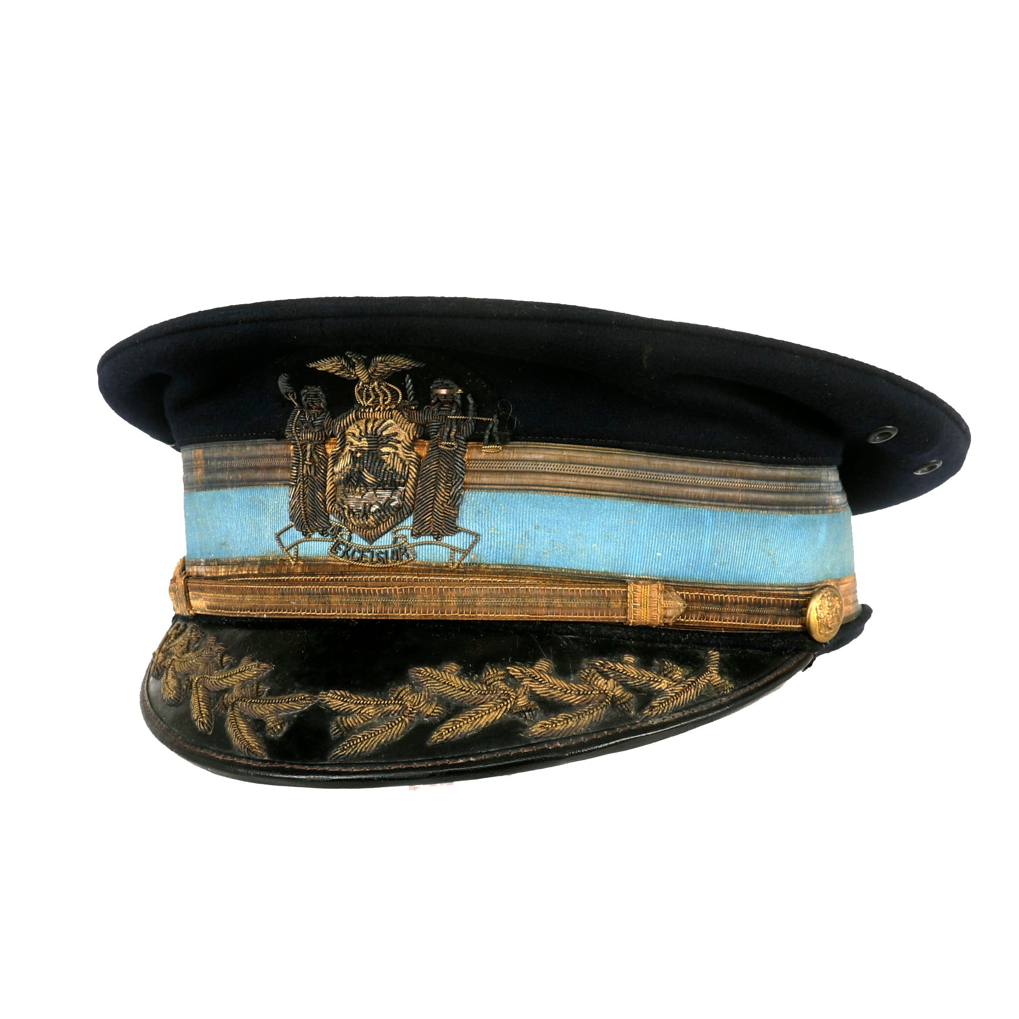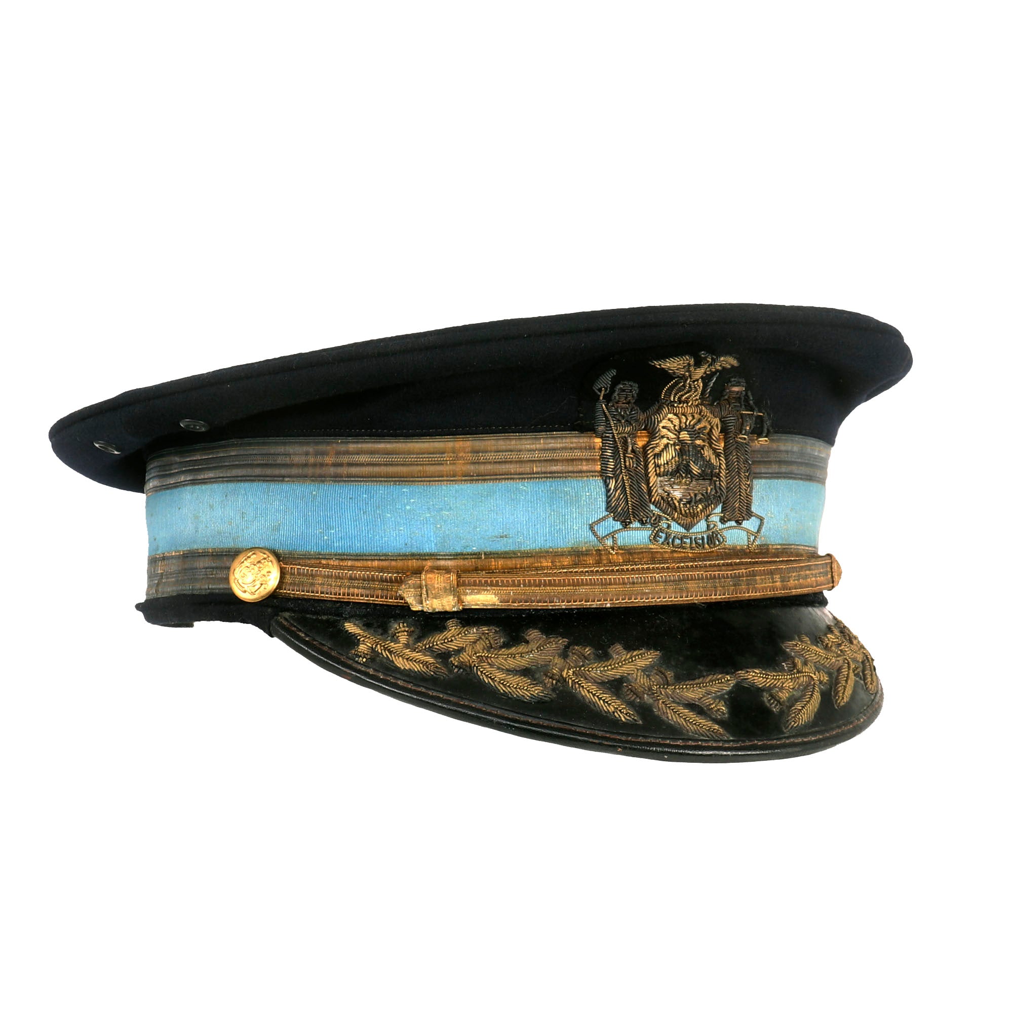 The markings are in gold paint, and have very little wear. The front of the cap bears the correct gold Seal of New York, with a gold bullion adjustable chinstrap with two New York National Guard side buttons. There is some light mothing on the crown but nothing too serious. The interior has some wear with the underside of the visor very stained.
