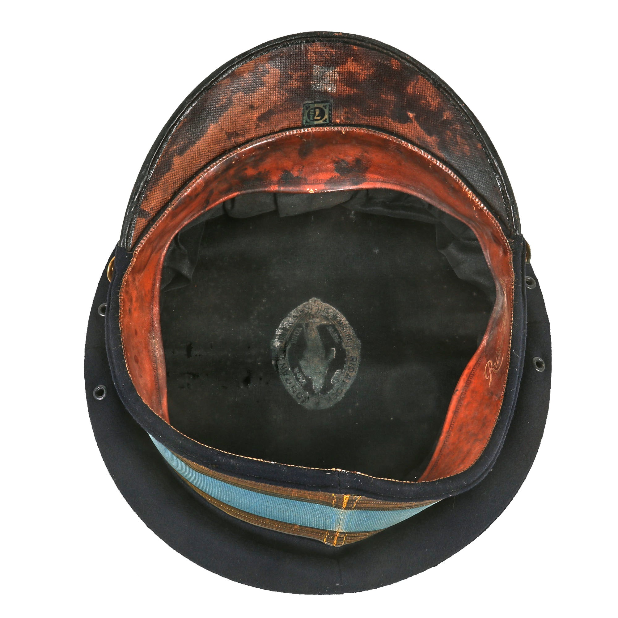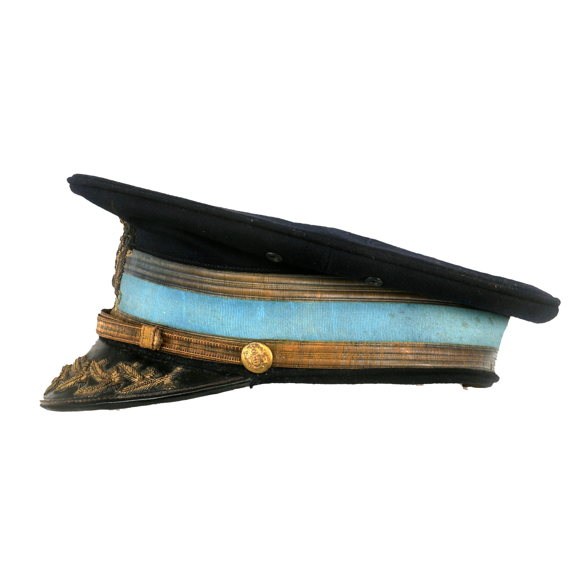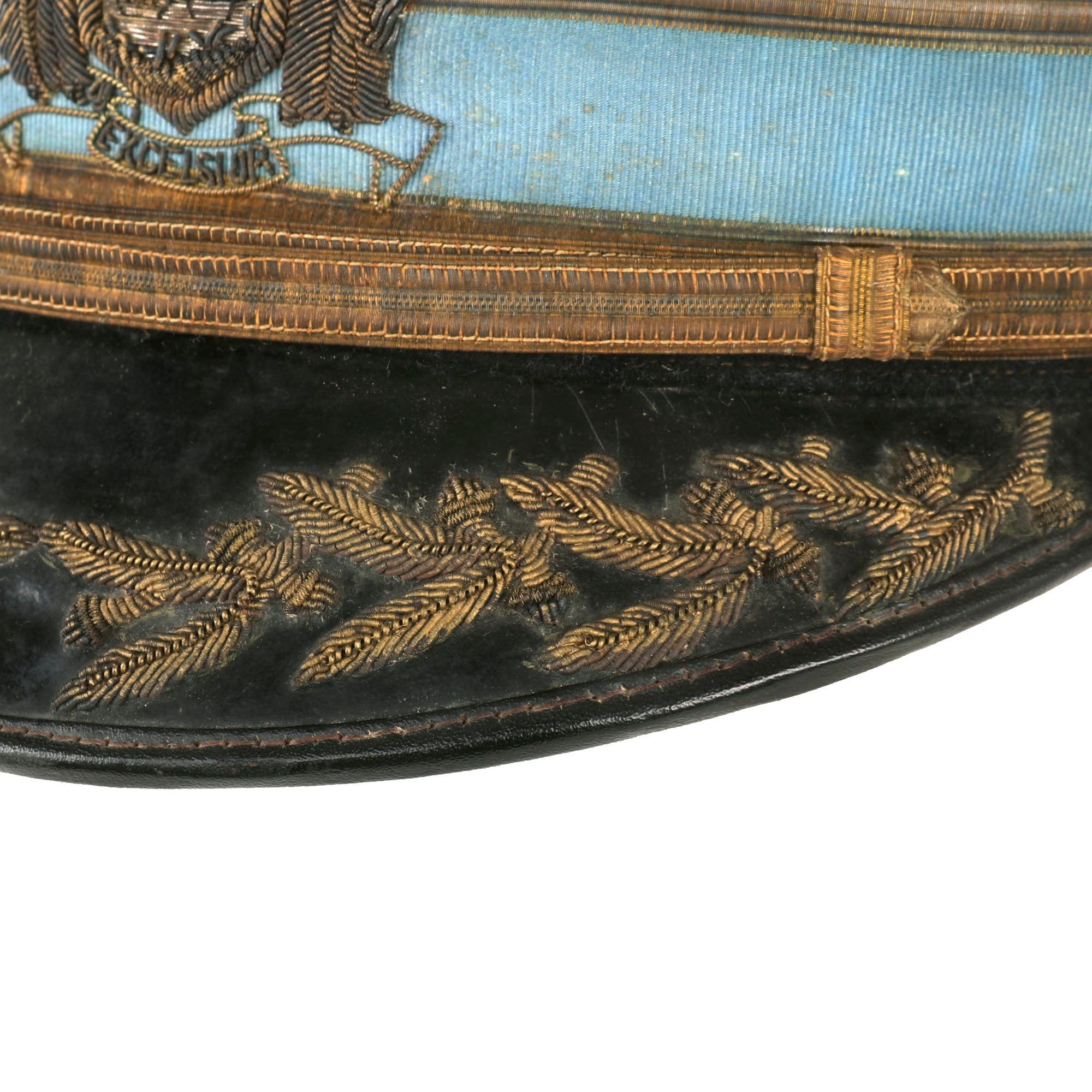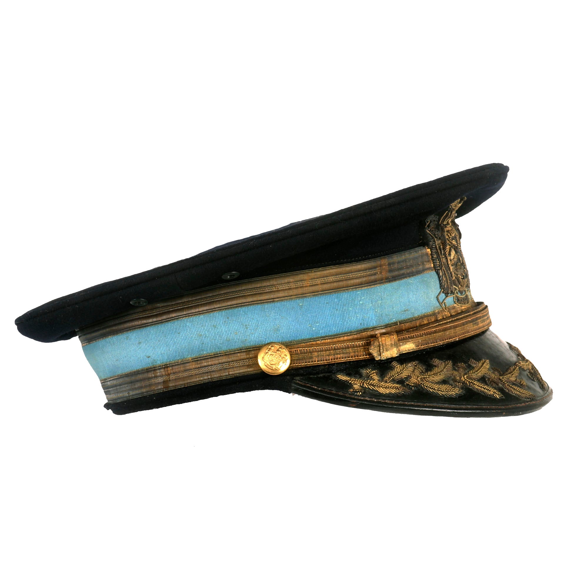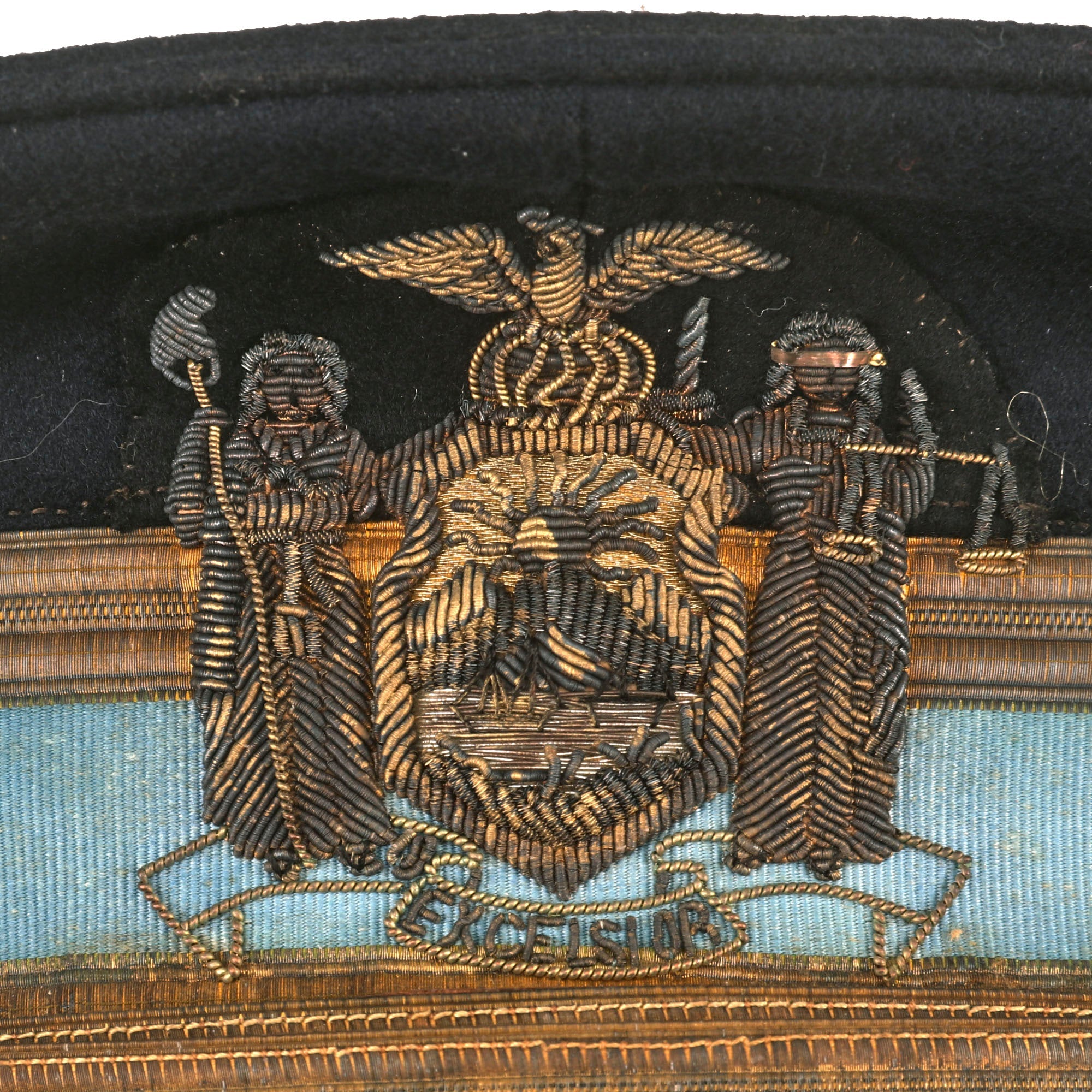 Original Item: Only One Available. This is a very nice condition U.S. Army Infantry Officer's M1902 visor cap in very dark blue, intended to be worn by Officers for dress and parade occasions. This example is particularly well made, with the New York officer's front insignia FULLY HAND EMBROIDERED in gold and silver bullion. There are also great General Officer’s oak leaves and acorns of bullion embroidered on the visor. Some amazing detailing! Officer's caps were usually privately purchased, and this officer apparently had a lot to spend.