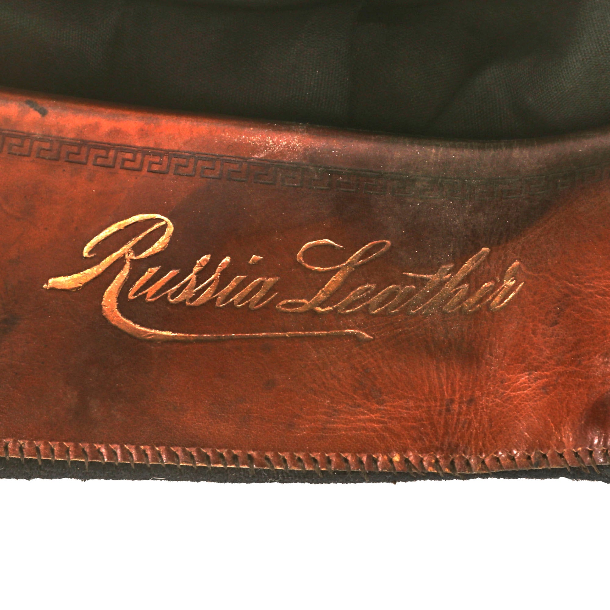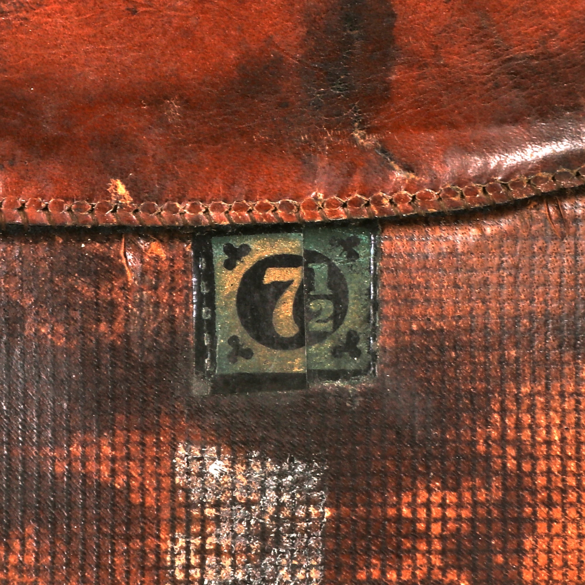 The cap features a patent leather covered visor, probably supported by pressed paper or fabric. The brown leather sweatband is stitched to the body of the hat, and is in excellent condition, with a size stamp reading 7½, a large size. The crown of the cap is lined with black satin fabric, and is marked as follows: