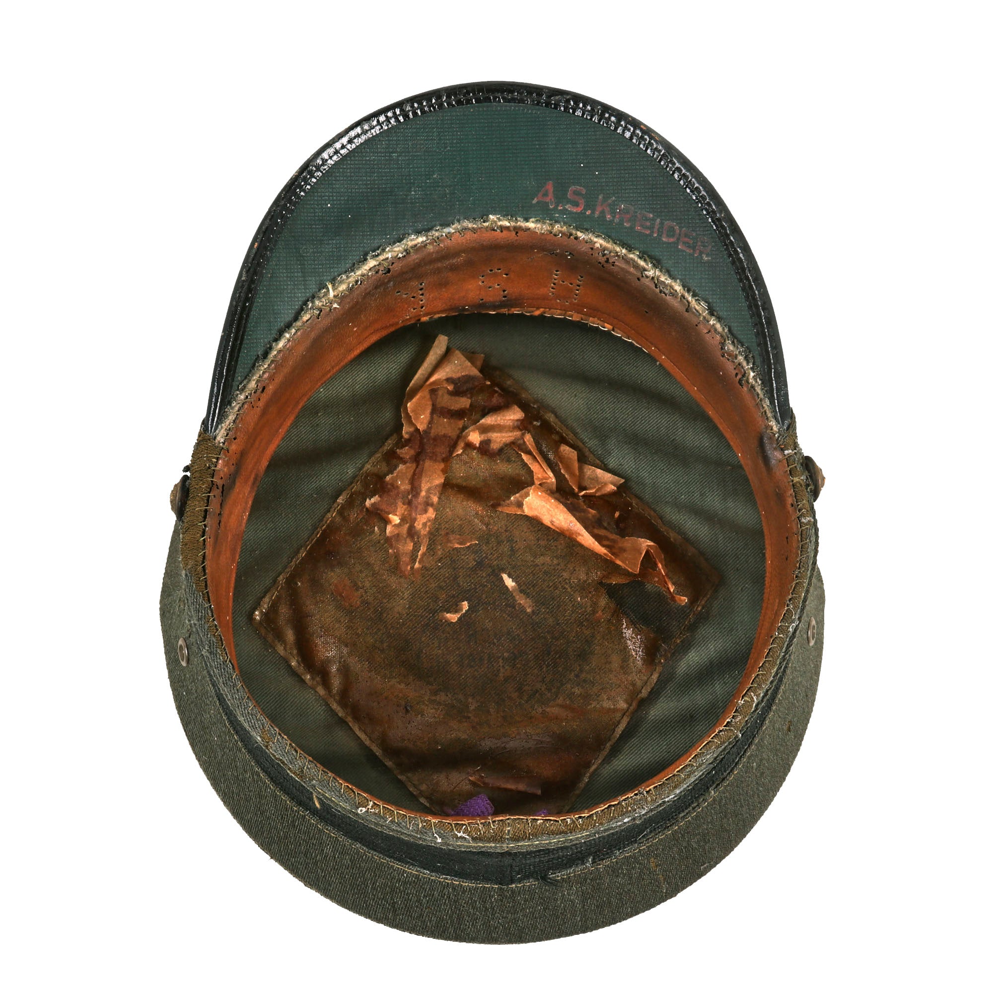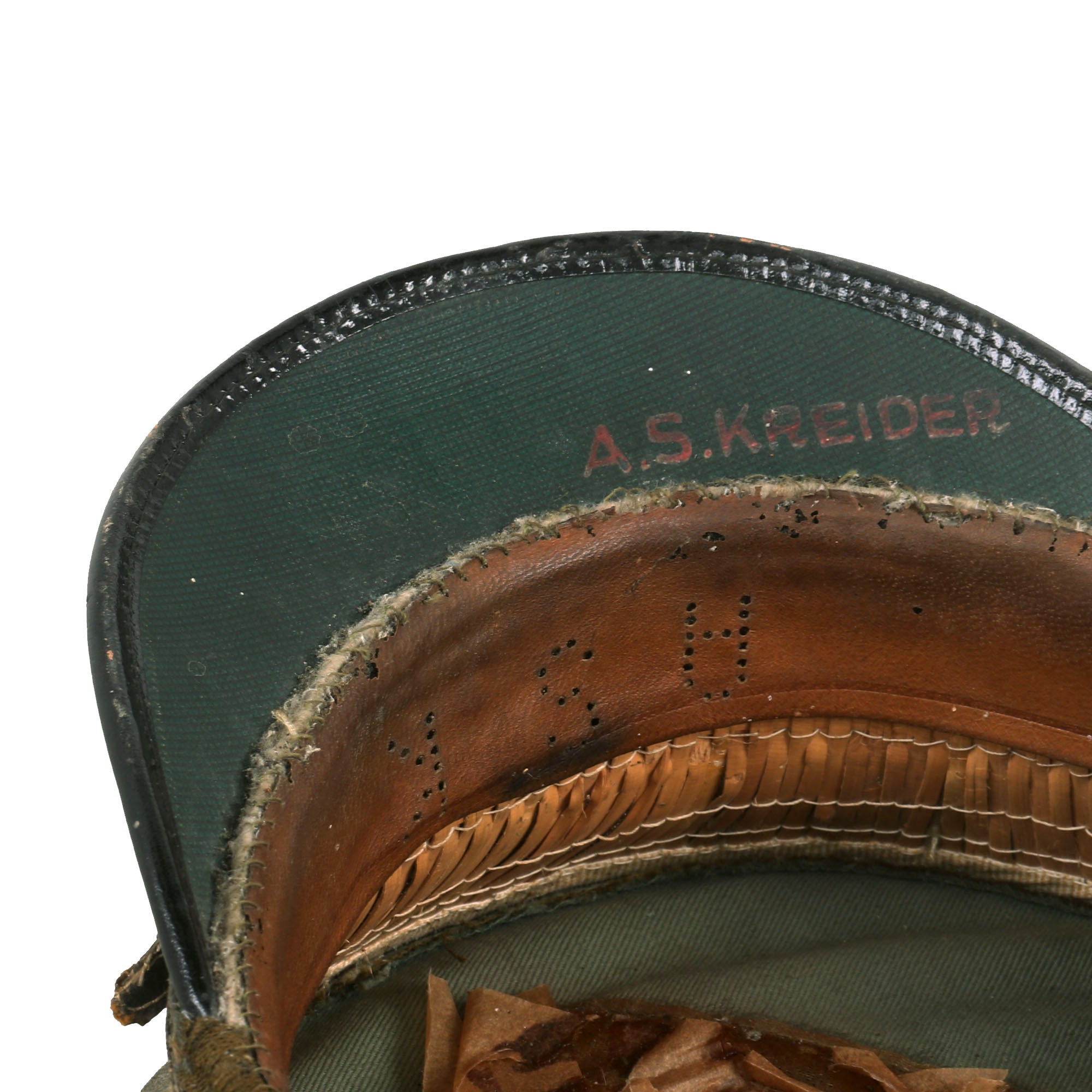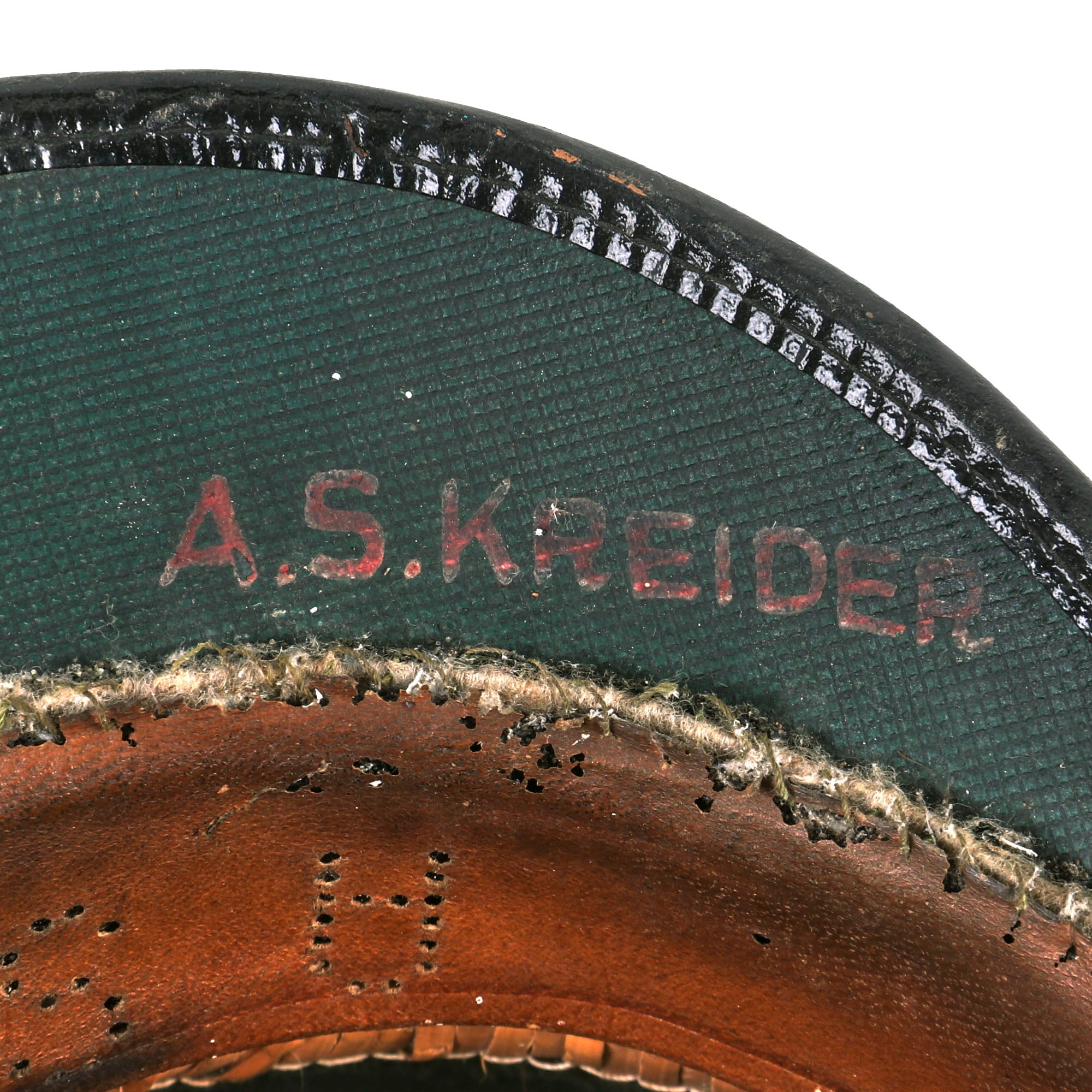 Original Item: Only One Available. This is a very nice U.S. Navy "Bell Crown" visor cap, intended to be work by Enlisted Men for dress and parade occasions. The name comes from the pronounced flare out towards the top of the cap. This cap is winter weight, and is constructed of wool fabric stretched over a wicker inner frame. The cap is named on the visor to Arthur S. Kreider, with his initials, A.S.K. perforated into the leather sweatband.