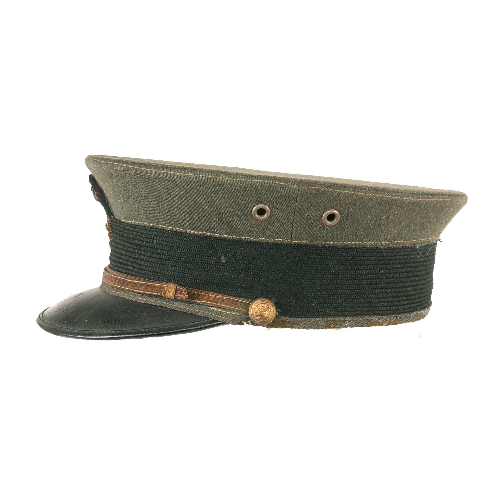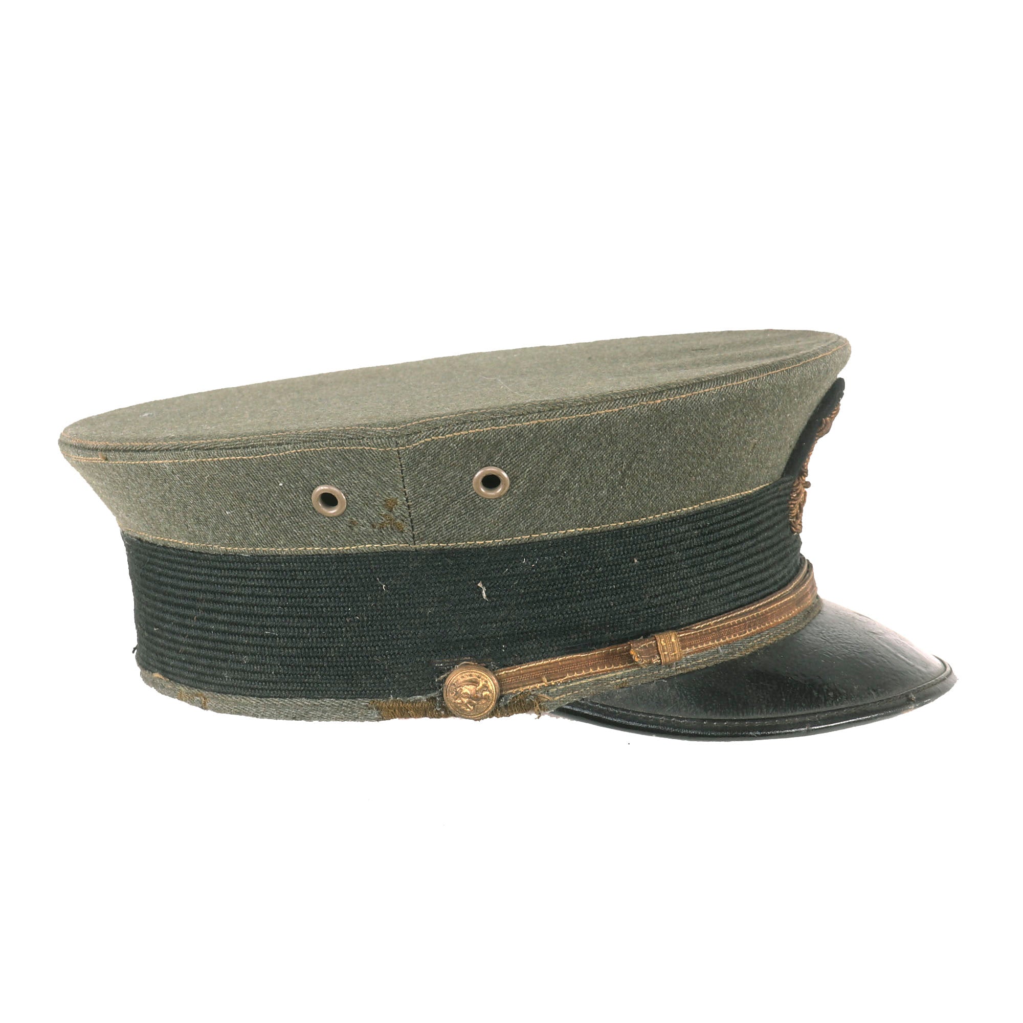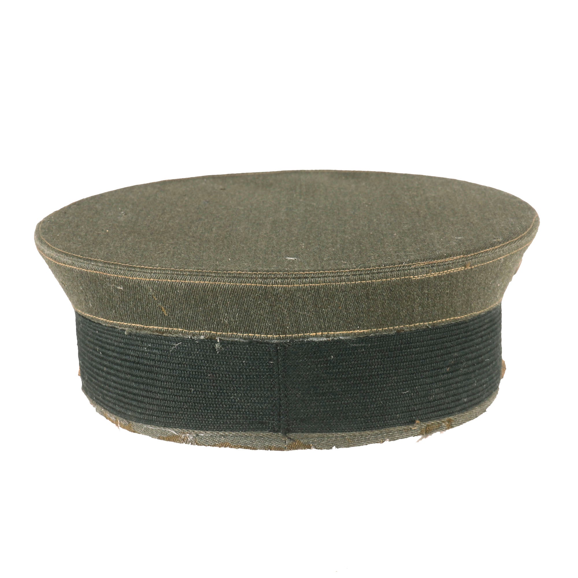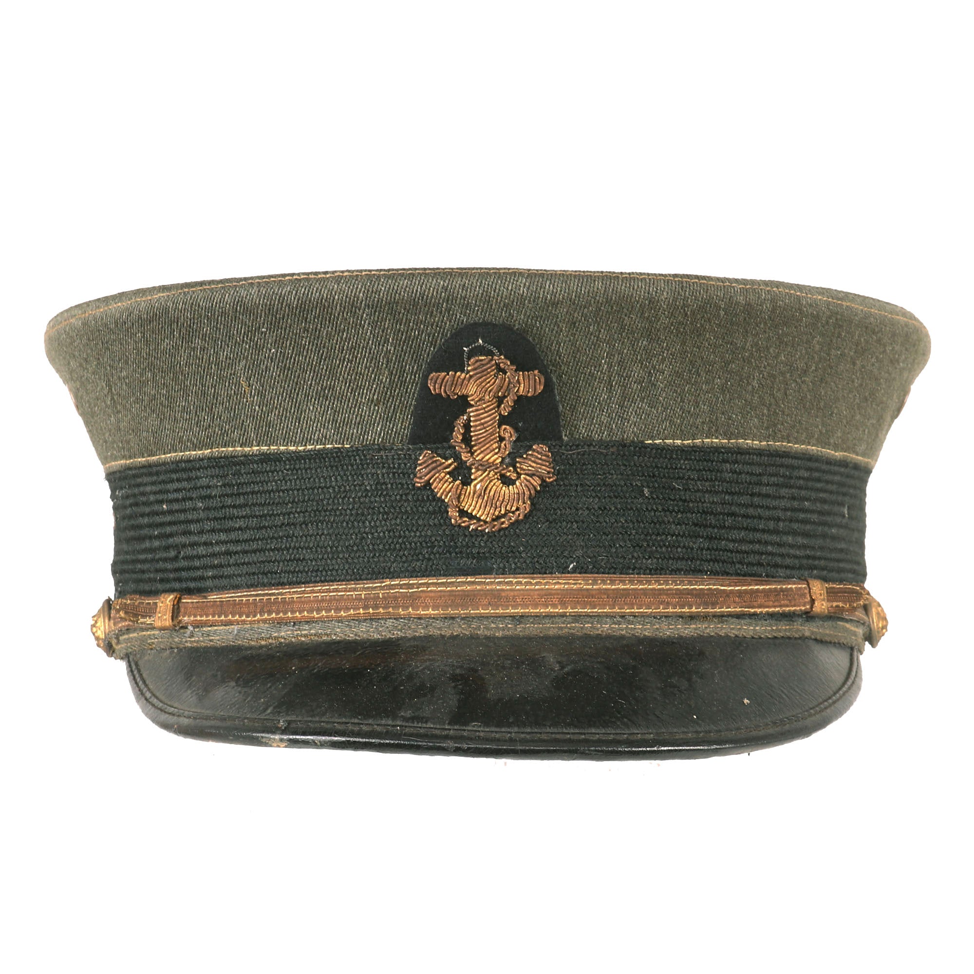 Original Item: Only One Available. This is a very nice U.S. Navy "Bell Crown" visor cap, intended to be work by Enlisted Men for dress and parade occasions. The name comes from the pronounced flare out towards the top of the cap. This cap is winter weight, and is constructed of wool fabric stretched over a wicker inner frame. The cap is named on the visor to Arthur S. Kreider, with his initials, A.S.K. perforated into the leather sweatband.