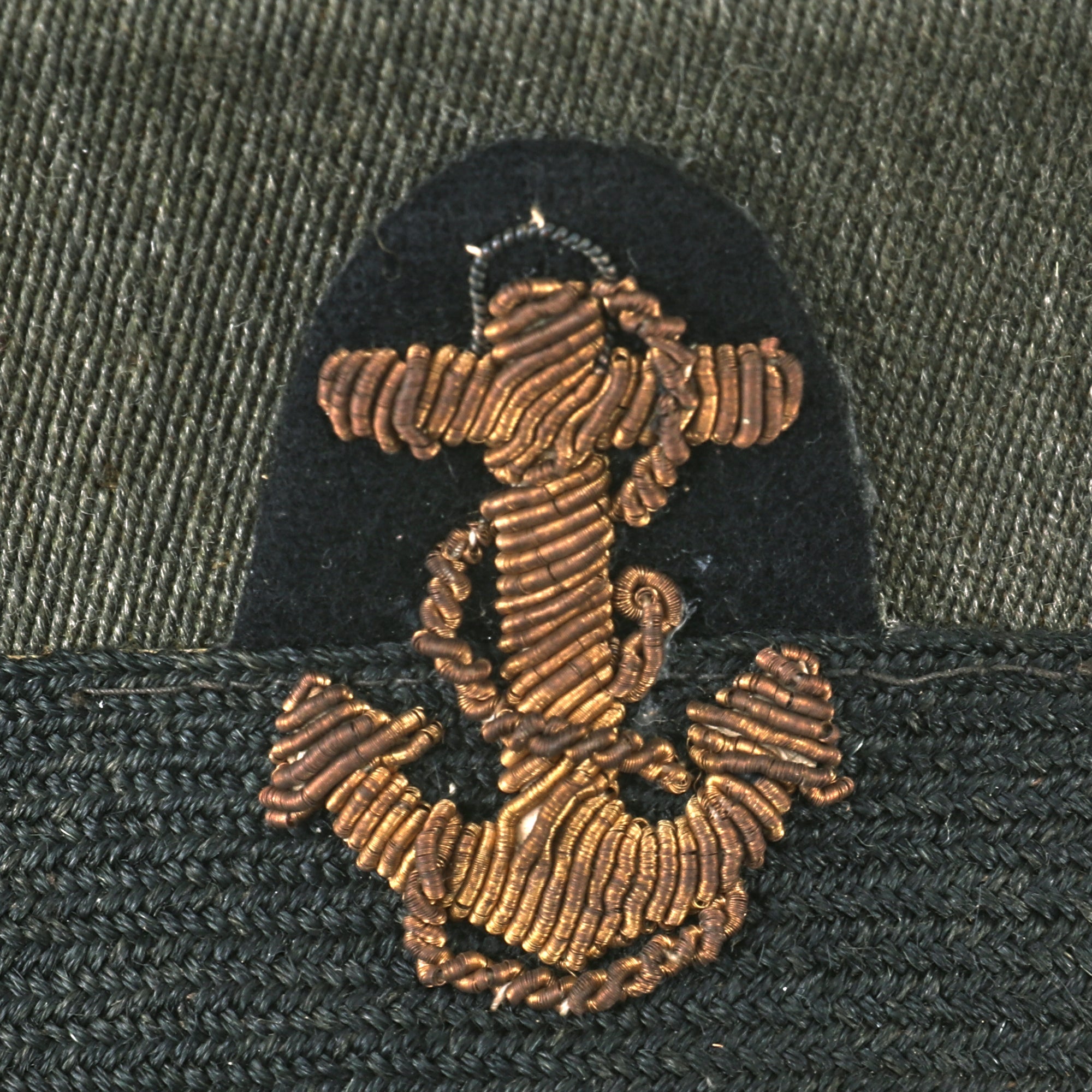 There is a great gold-tape chinstrap held by two gilt Navy buttons, with a gorgeous bullion Naval insignia with a rope wrapped around an anchor.