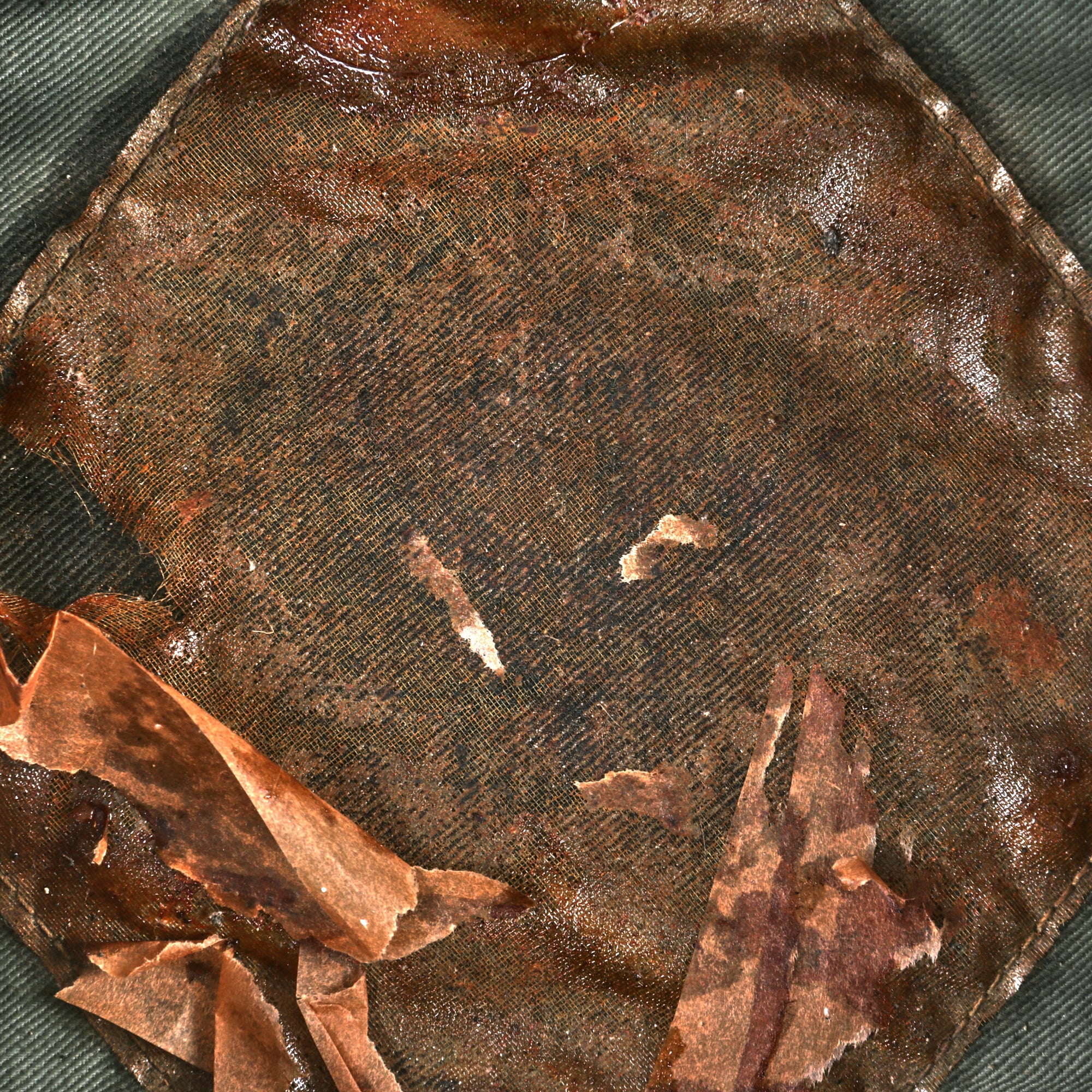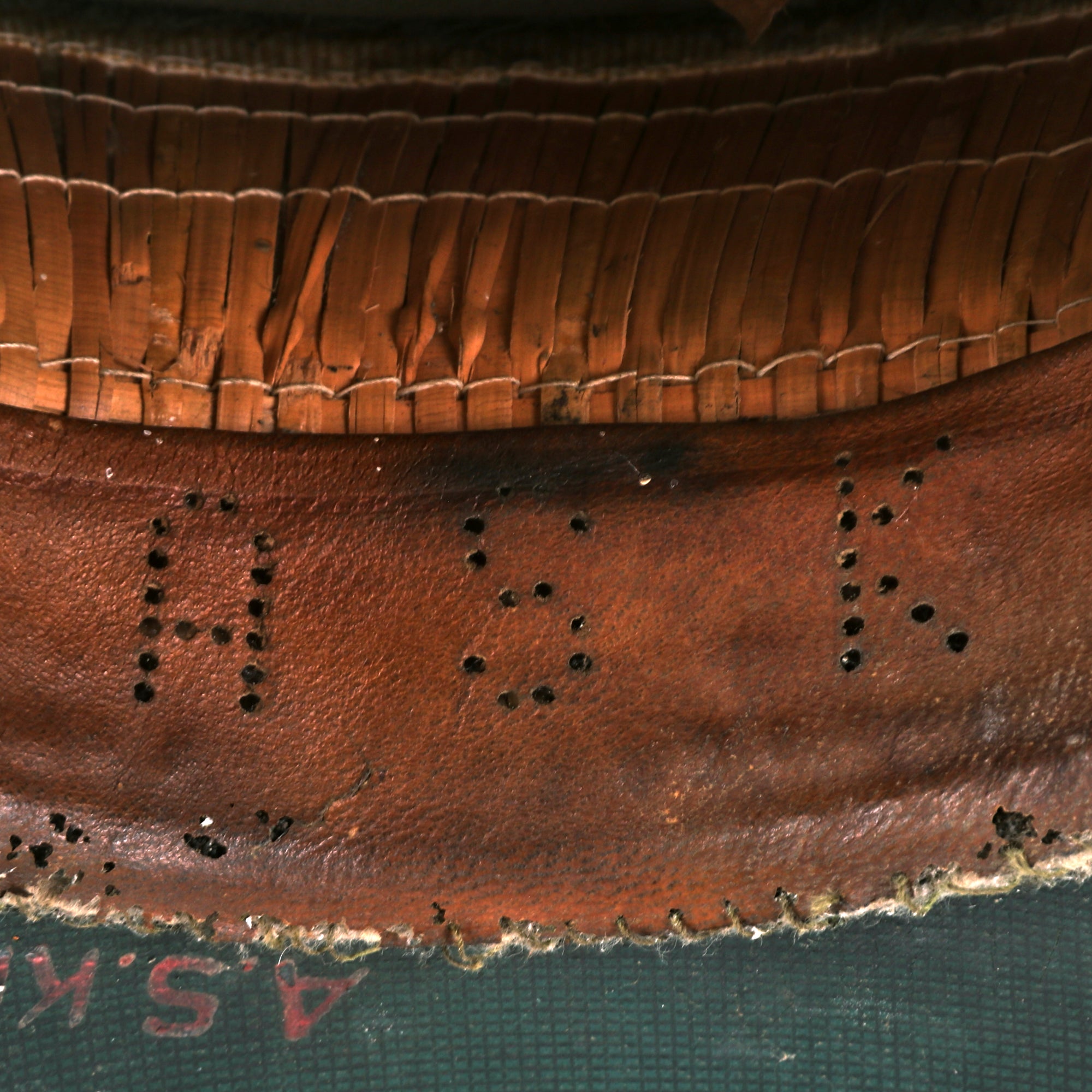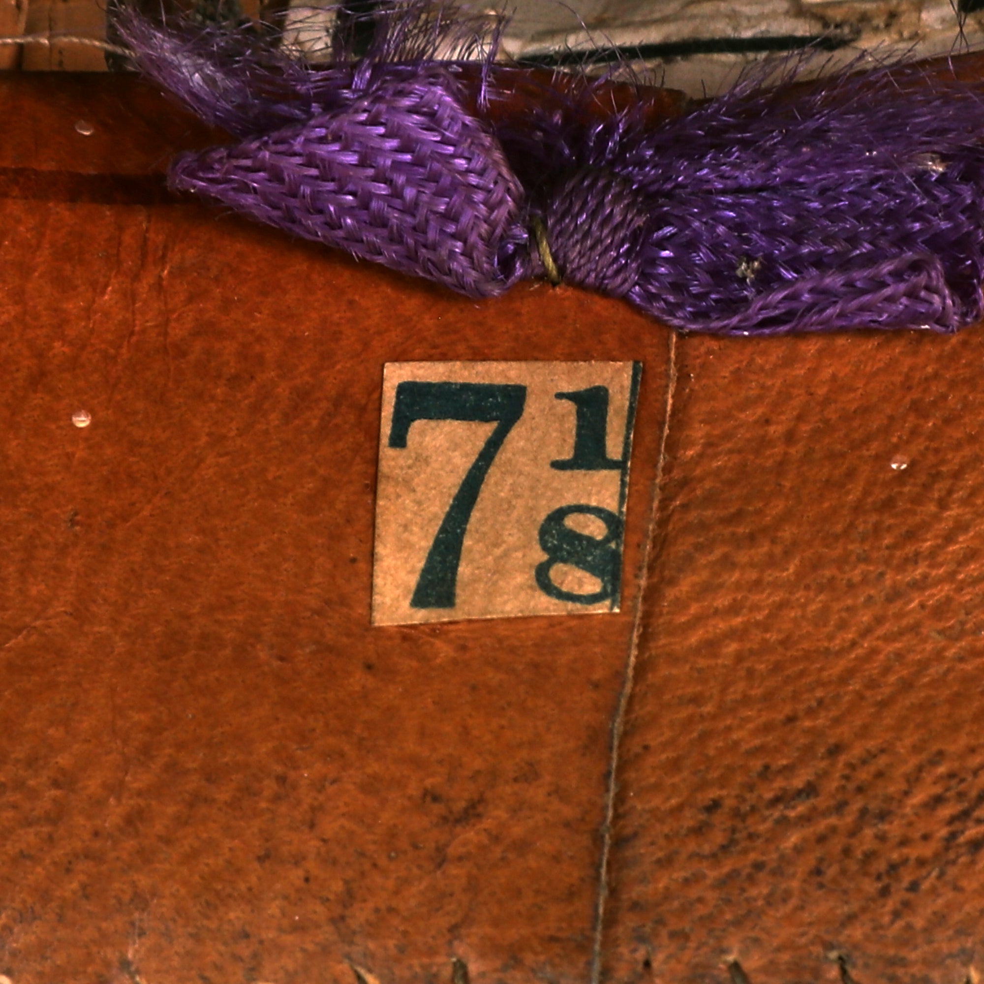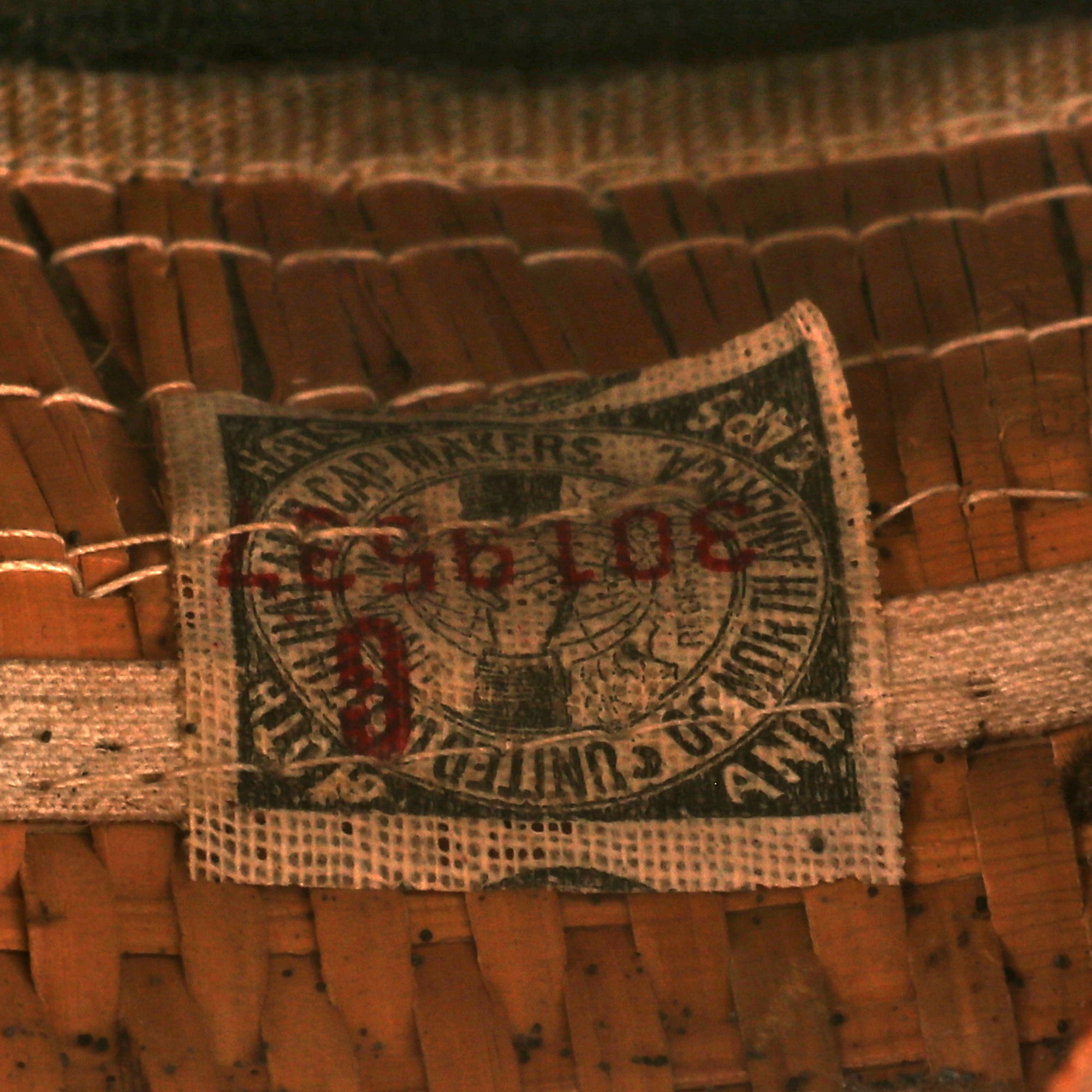 The cap features a patent leather visor with, probably supported by pressed paper or fabric. The brown faux leather sweatband is stitched to the body of the hat, and is in fair shape but much of the stitching has worn away. There is still a size stamp on the sweatband, for Size 7⅛. There is a large tag in the back behind the sweatband with a patent date of January 7th, 1913. Next to this is a tag for the United Cloth Hat & Cap Makers of North America. There is a maker’s mark in the center of the crown but it has unfortunately worn away from use.