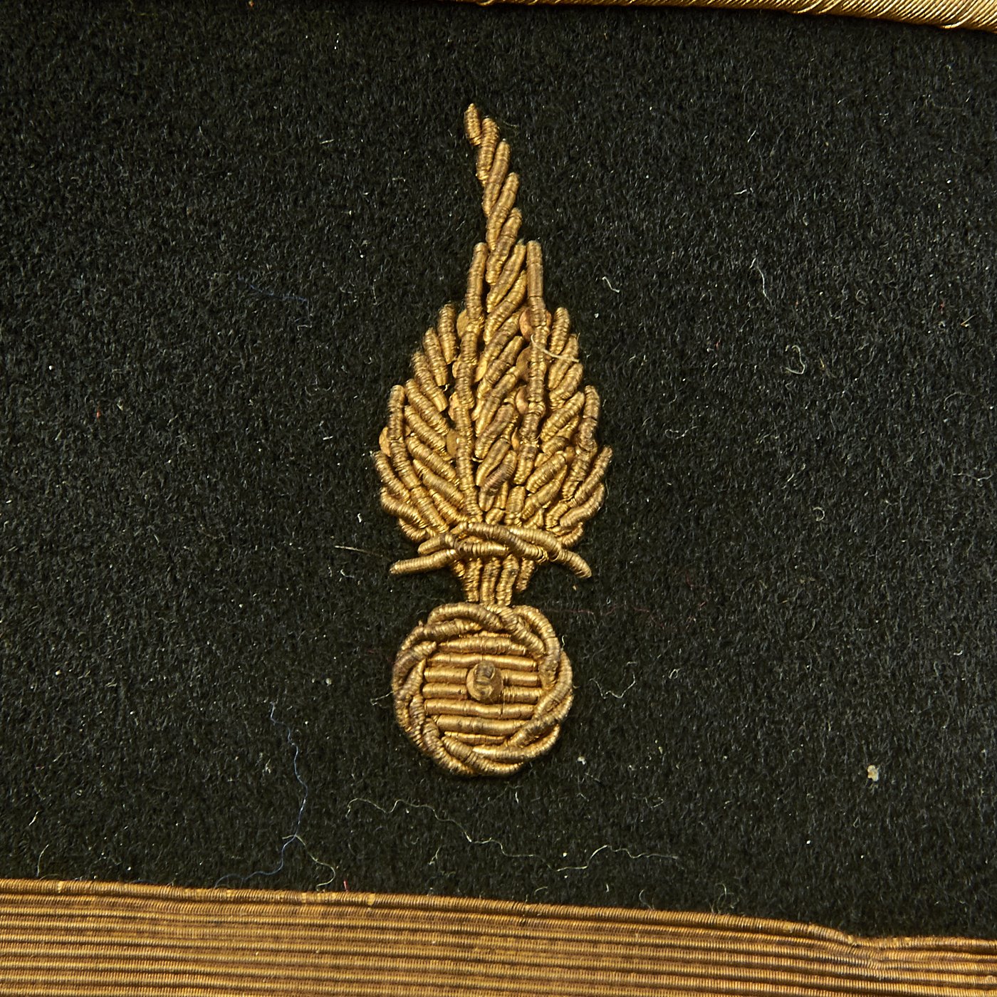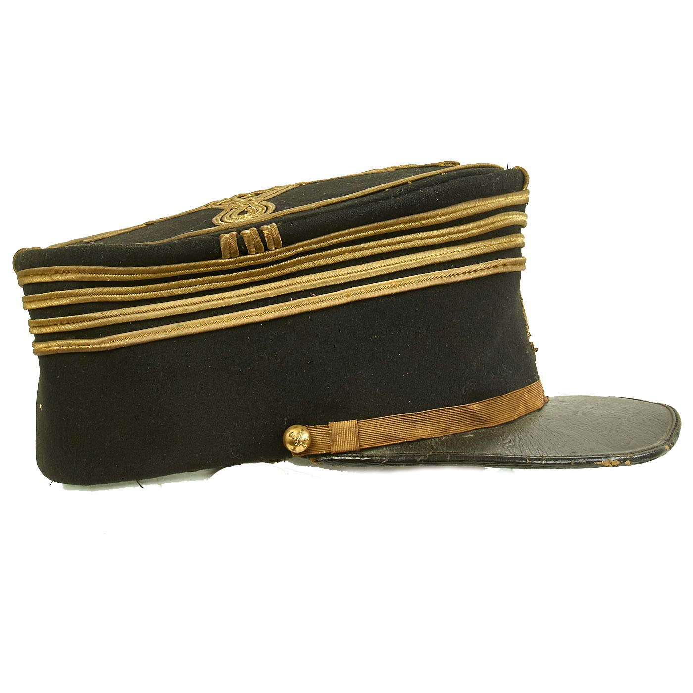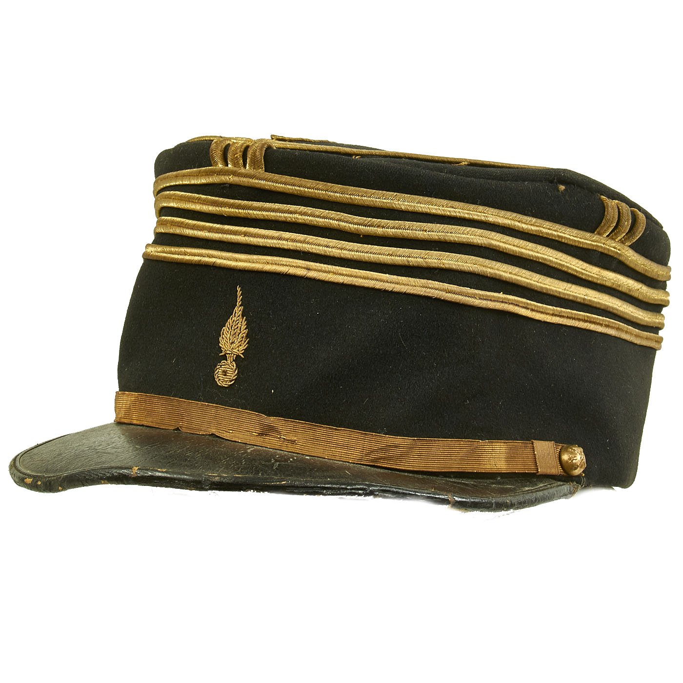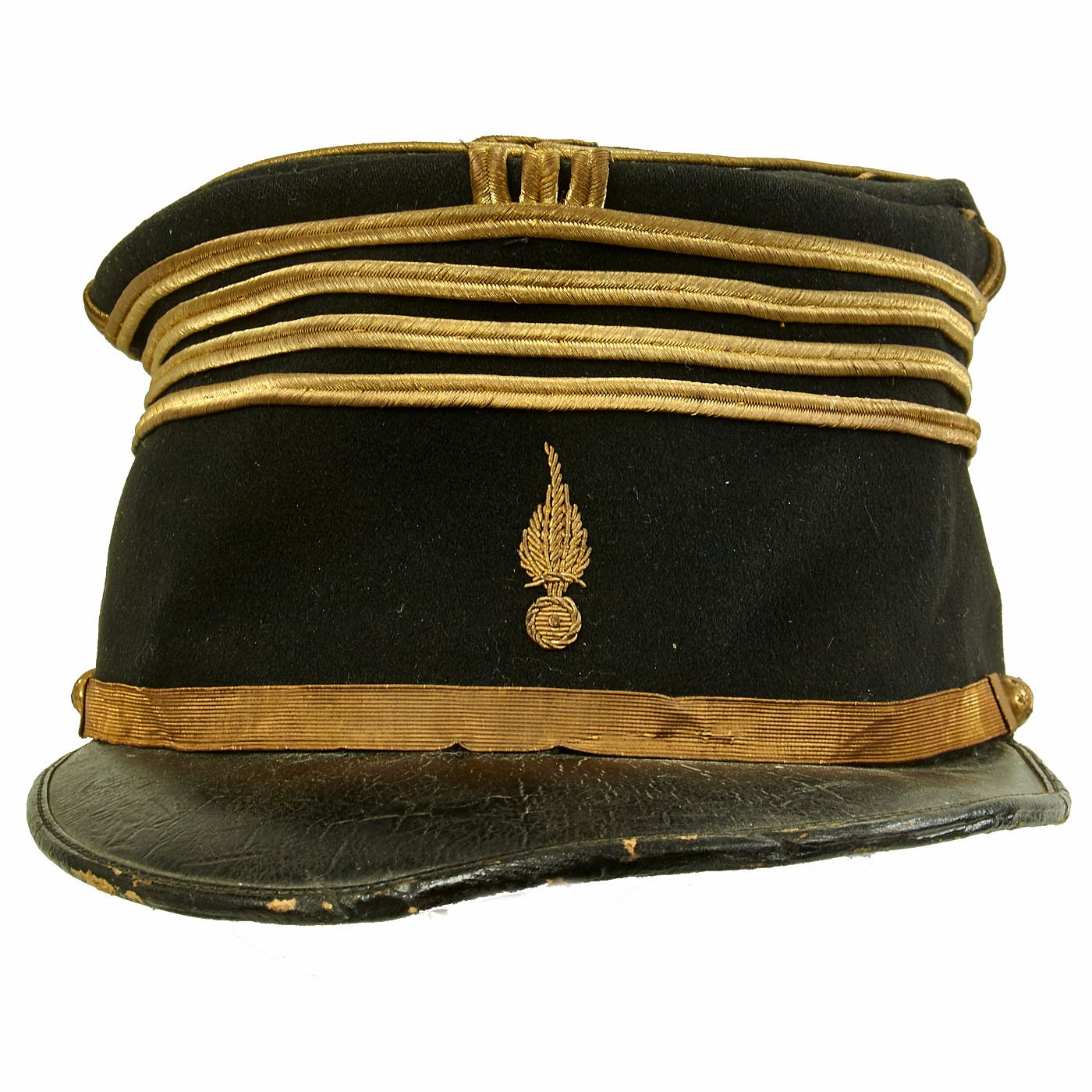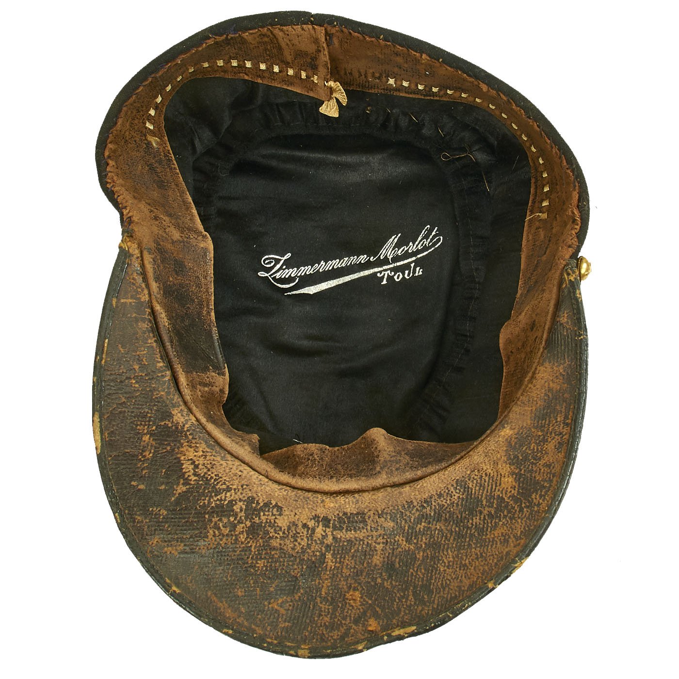 - Original Item: Only One Available. This is a very nice French WWI Kepi for an Artillery officer. This is a worn example with gilt bullion wire piping and caduceus, gold ribbon chinstrap and gilt artillery cross cannon buttons. The interior is worn with a leather sweatband and silk lining. The crown is embossed in silver Zimmermann Meorlot TOUL. The leather visor is sturdy but shows age and dryness. Size is approximately 6 3/4 US (54cm). Overall condition is worn but good for a 100+ year old wool and leather kepi.