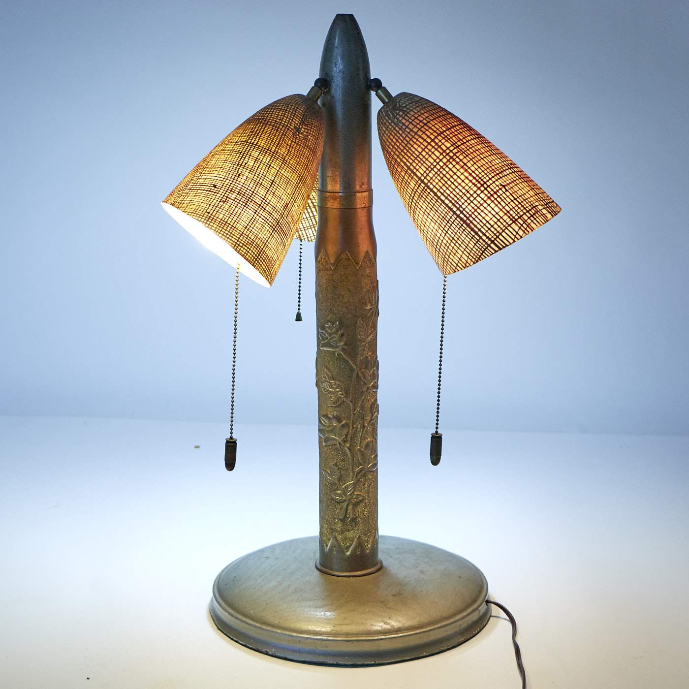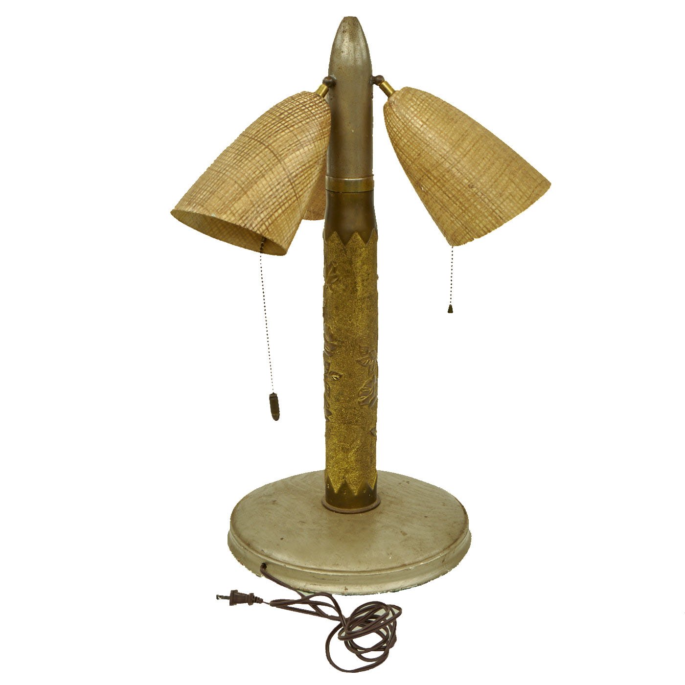 Original Item: One-of-a-kind. This lamp lights up! Great War Artillery Shell Casing that measures approximately 23" tall and 3" wide, the casing in brass. The projectile appears to have a nickel finish, the base is a wood. The entire piece was converted to be a lamp that still works! The outer surface has been fully decorated and features roses.