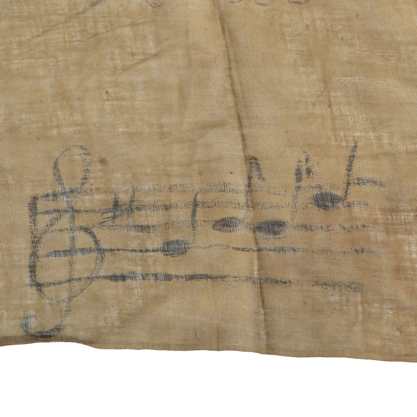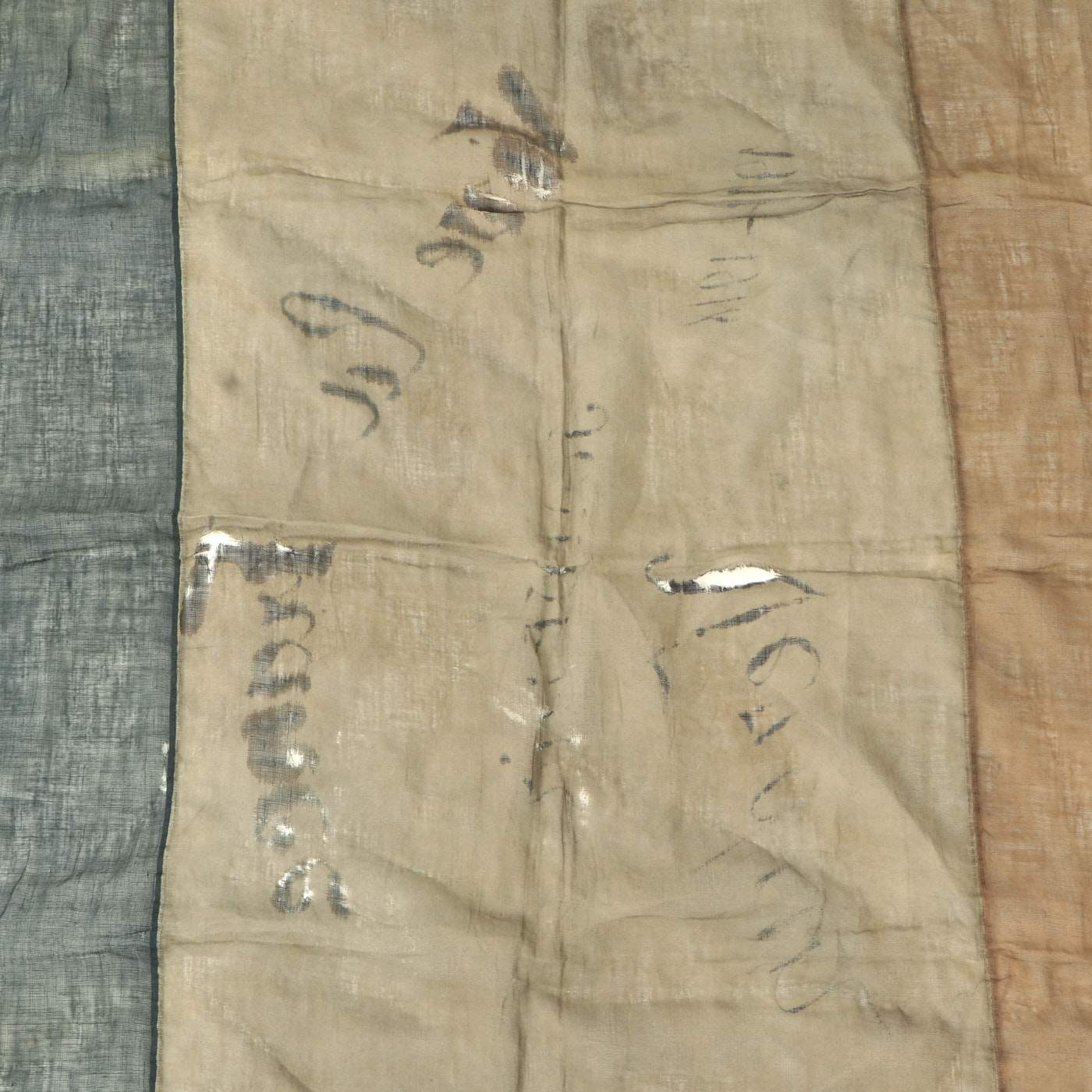 The flag is in good condition, but definitely shows age, use, and exposure to the elements. The colors are quite faded, as well as relatively age toned or stained overall. There are some tears in the fabric, as the paint used for the writing seems to have weakened it. Considering the original lightweight construction, it definitely has done quite well considering its history.
