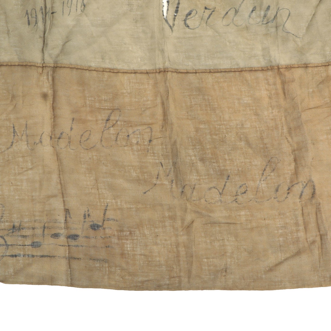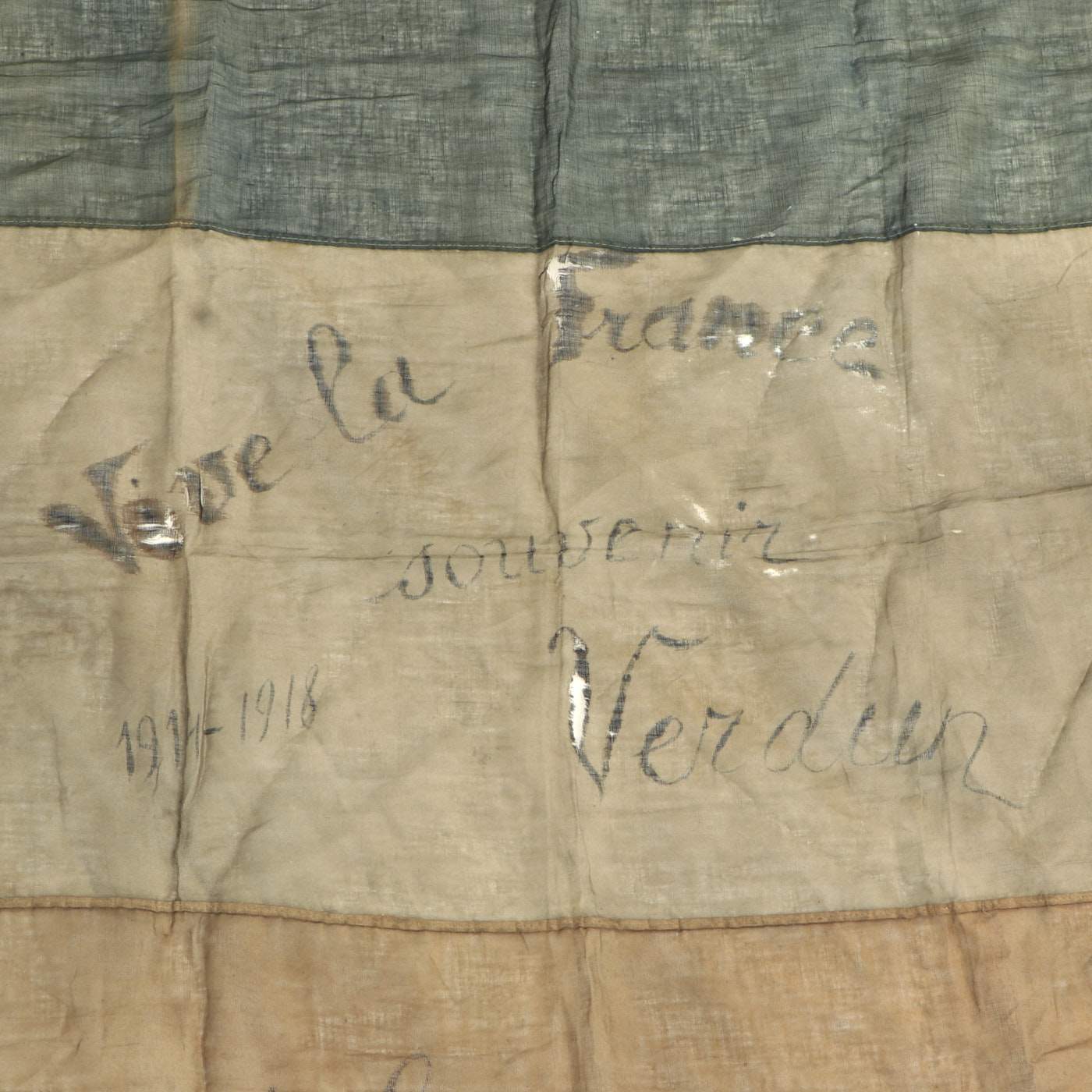 Original Item: Only One Available. During "The Great War", the area known as the Fortified Region of Verdun (RFV, Région Fortifiée de Verdun) was one of the most blood soaked of the entire war. Some estimate that as many as 1,250,000 lost their lives in the area during the war, especially during the 302 long Battle of Verdun. This flag is a souvenir from the battle area, and looks to have been recovered after the fighting had ceased.