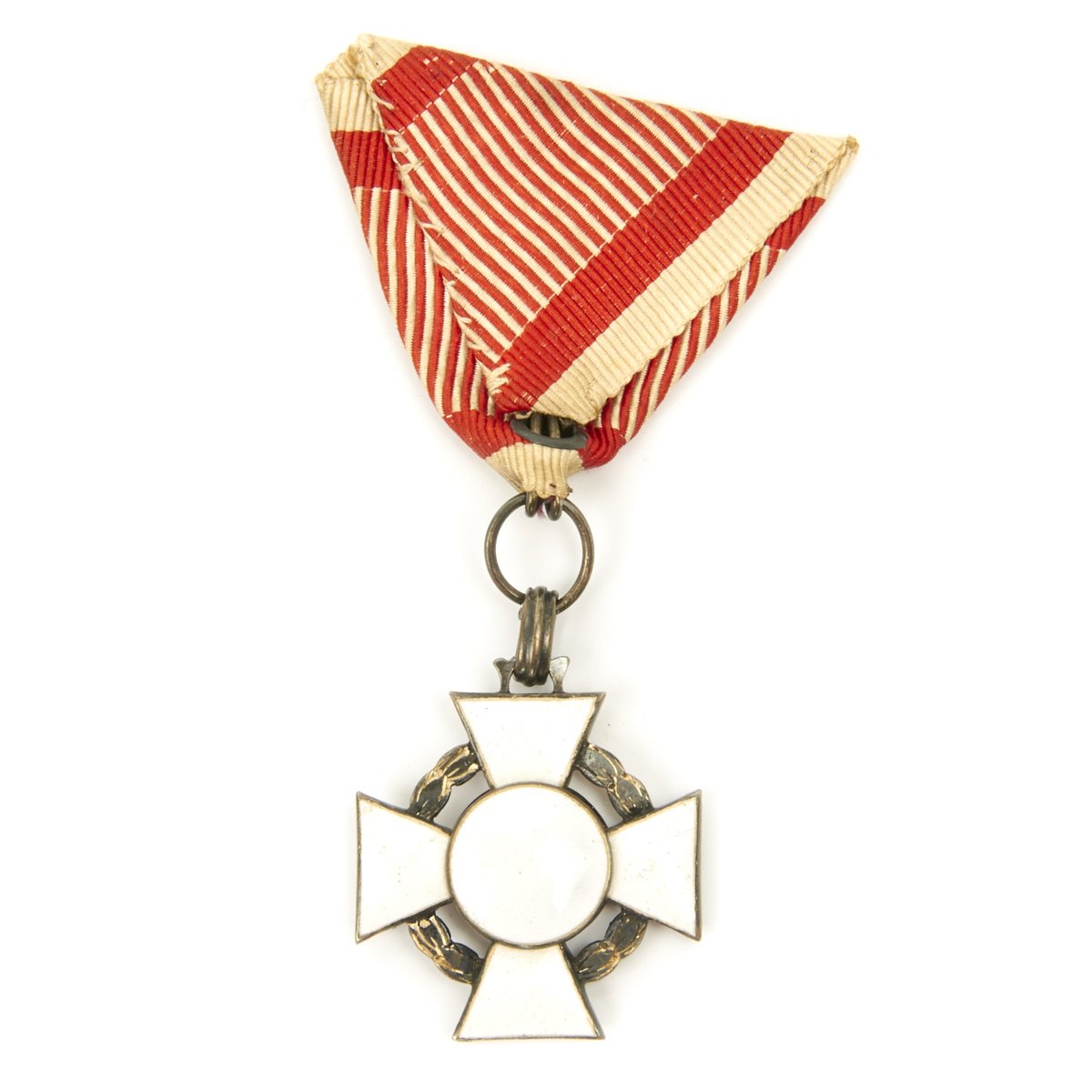 The 3rd Class is suspended from a trifold ribbon. The ribbon is that of the Austrian Bravery Medal, a "laddered" pattern of red stripes with white between the "rungs" and a white border (this ribbon was also used for wartime awards of a number of other Austro-Hungarian decorations). The cross is approximately 30-mm in width, with the arms broadening to a width of 15-mm. The center medallion is approximately 13-mm in diameter. The War Decoration wreath, which during World War I was more likely gilt rather than green, is 3-mm wide.