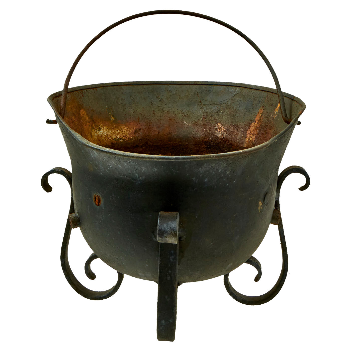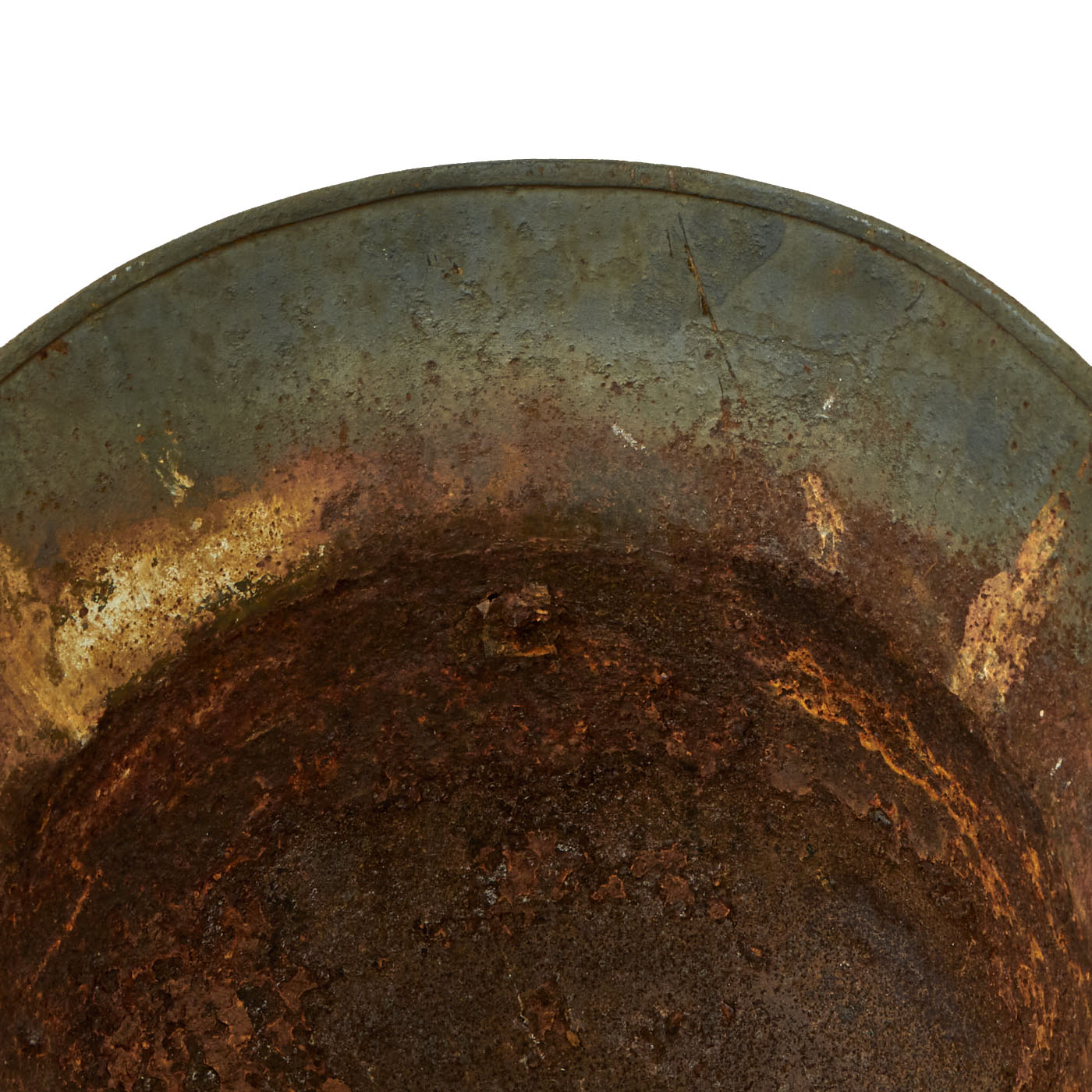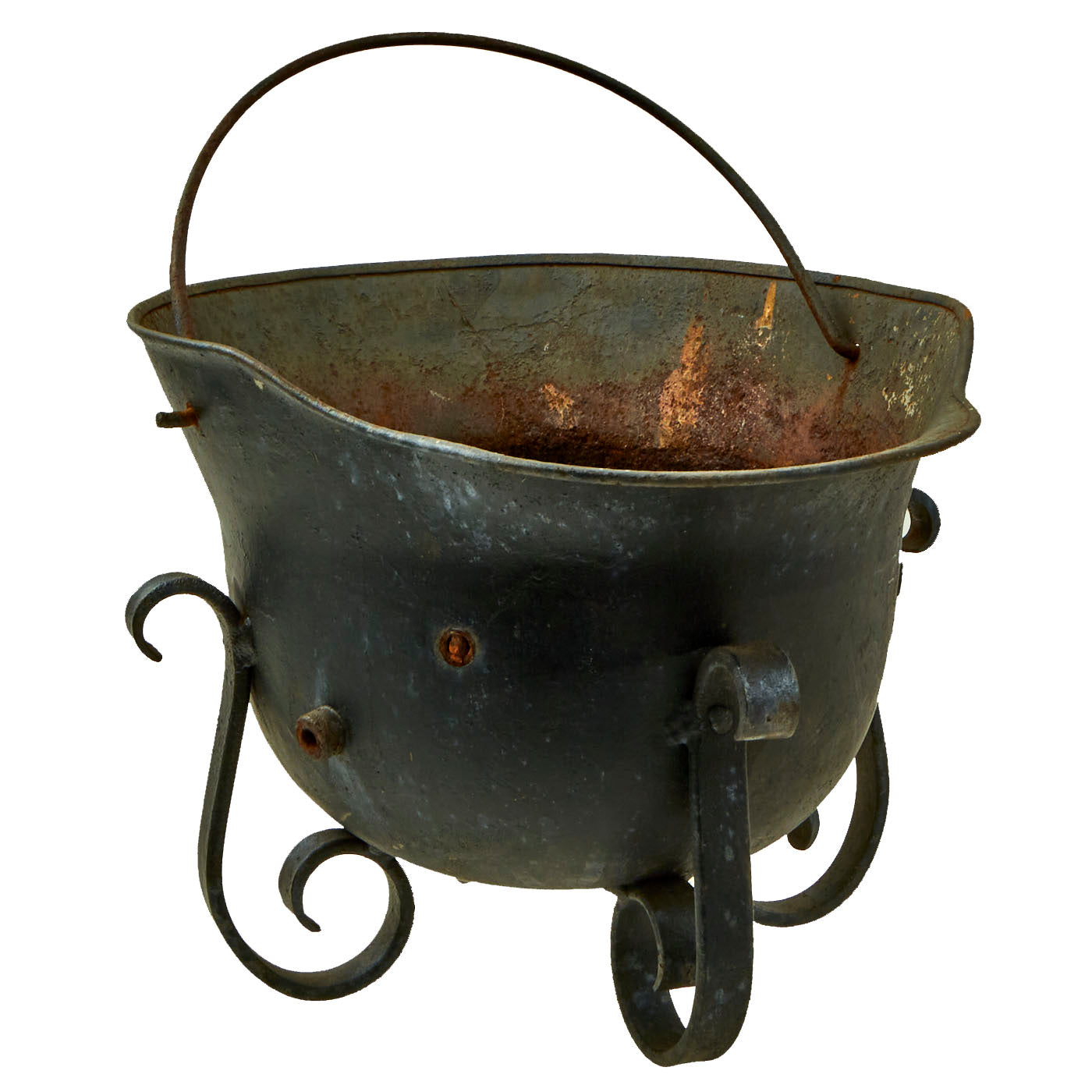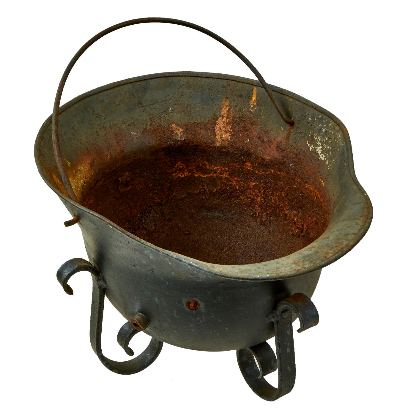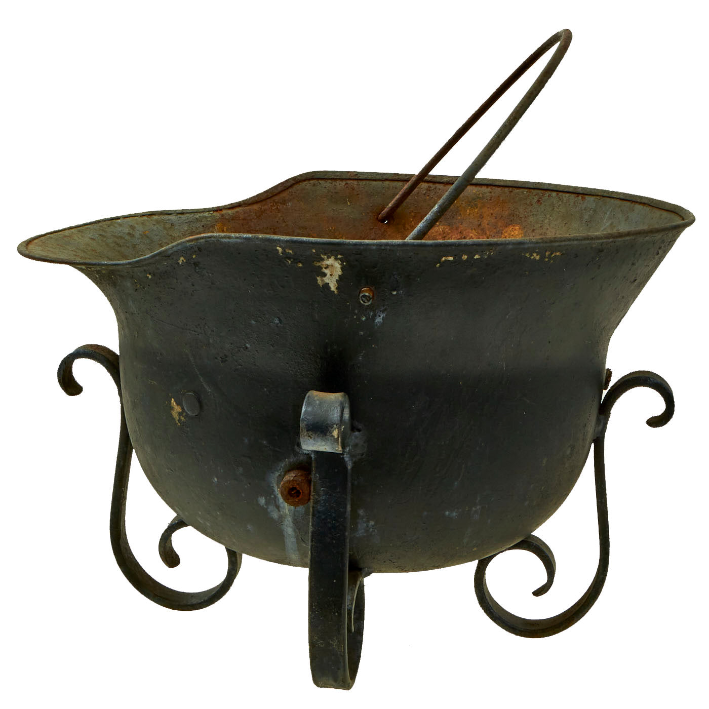 The helmet, which originally started life as an M-16 Stahlhelm of a larger size (66 or 68…unfortunately the markings are unreadible), then had a handle added to the helmet through the holes were the chinstrap log attachment points were placed. The helmet then had added four curved iron feet welded to the base and sides of the helmet. This repurposed the helmet into a Coal Scuttle, which was a common household item in the 19th Century into the early portion of the 20th Century.