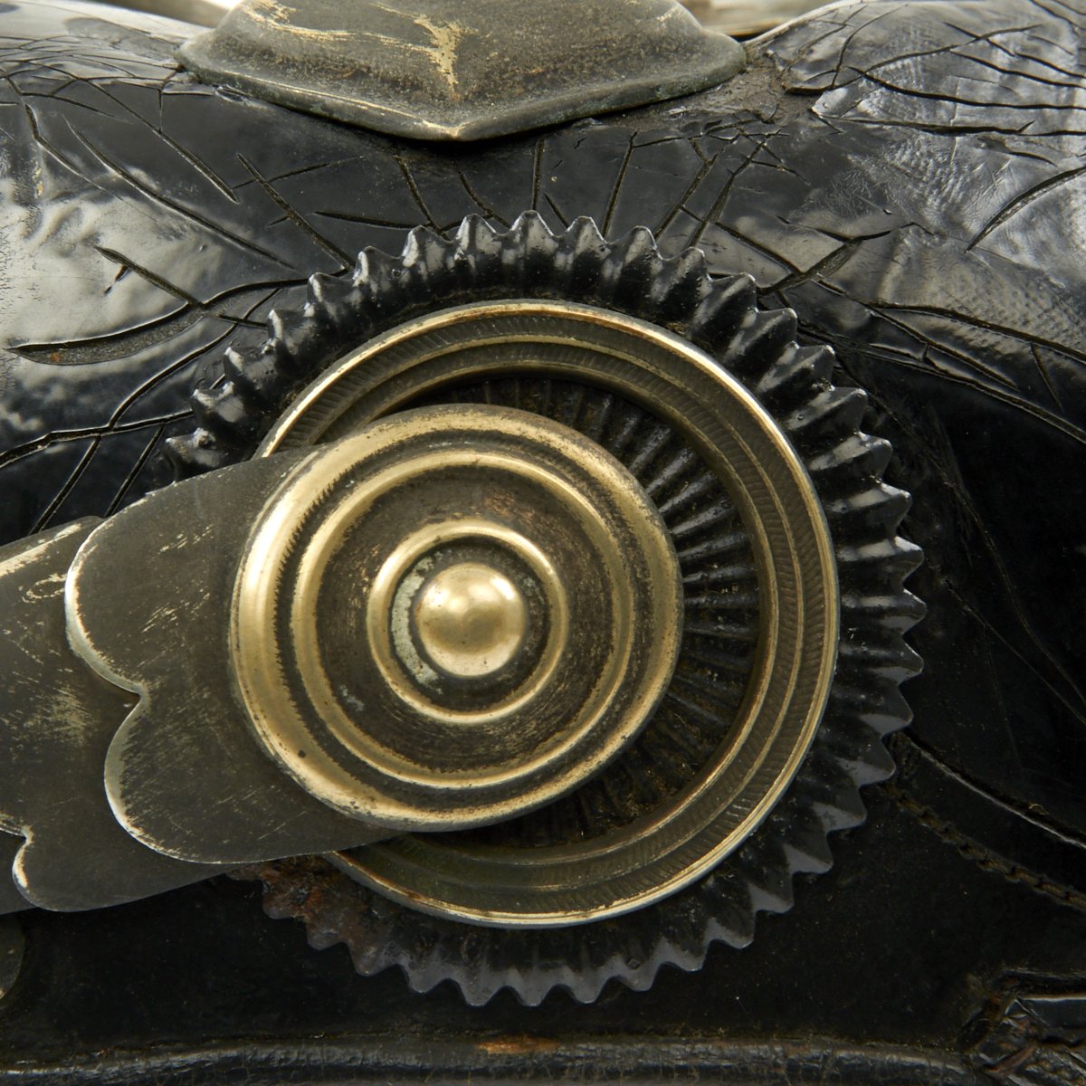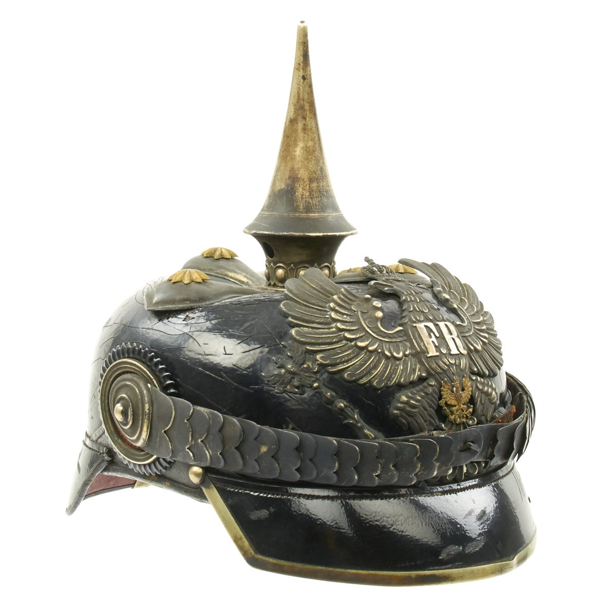 The overall condition of this officer's pickelhaube is very good. Almost all of the helmet's furniture is highly-detailed "German Silver" nickel alloy, though over the years it has oxidized to an almost black color, and the brass has taken on a nice patina. The Prussian wappen (coat of arms) features a large Prussian Eagle holding a scepter in the right claw, and an orb in the right. Unlike the typical wappen, this does not have the King's motto, and there is in fact a smaller brass Eagle, most likely gilt, just below the F.R. on the wappen. This is quite interesting, and not something we have seen before, but with Officer's private purchase pickelhaubes, regulations did not matter as much. The Wappen is held in place by the correct bolts used on officer's models. The chin scales are also German Silver, and are complete, with the expected leather deterioration of age.