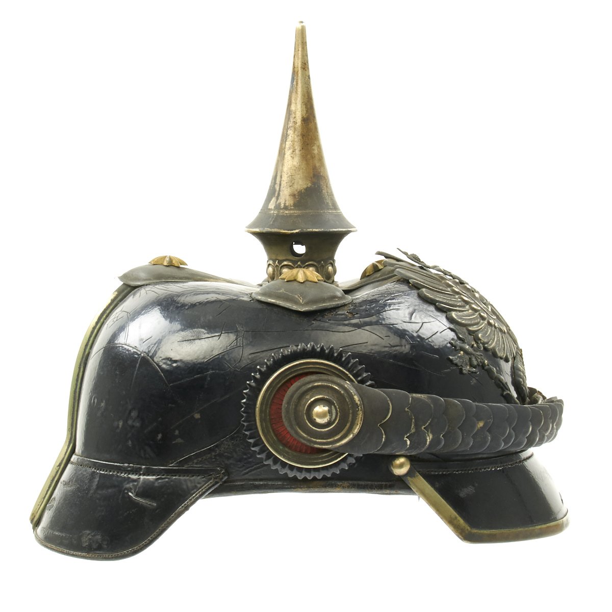Regardless of the unit, officer Pickelhaube share common features such as: the undersides of visors are lined, Officer Kokarden are carried, and the "egg & dart" Perlring was matched with star-pattern spike base brads, and chinscales were worn. The officer's Pickelhaube was basically unchanged from 1871 to 1899 when it had a more domed shape, and from 1899 to the end it had more of a skull shape. Otherwise, with the exception of the addition of the Reich's Kokarde in 1897, the officer's Haube was mostly the same from 1871 to 1918. As with most pickelhauben, they are made from boiled leather, which is then lacquered black.