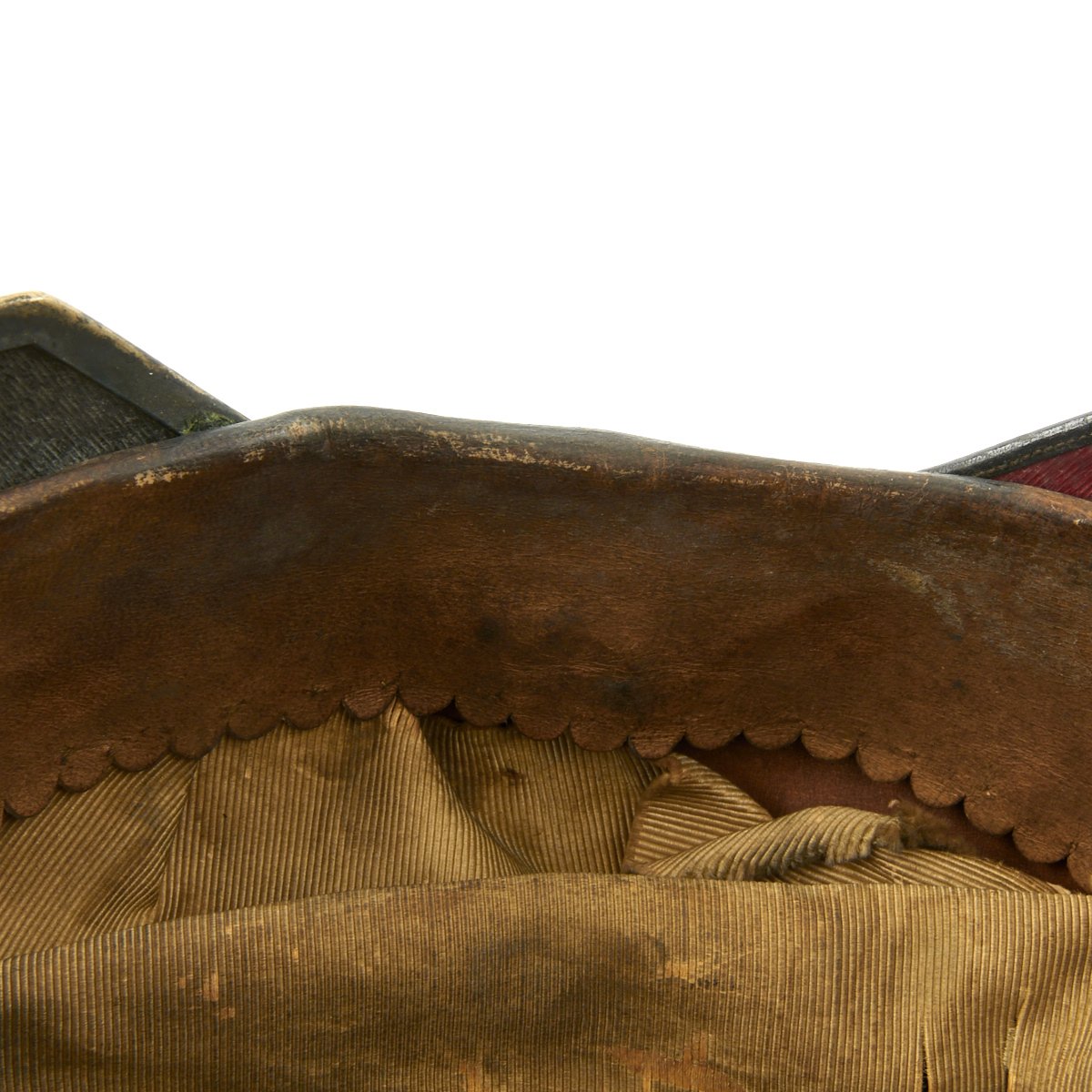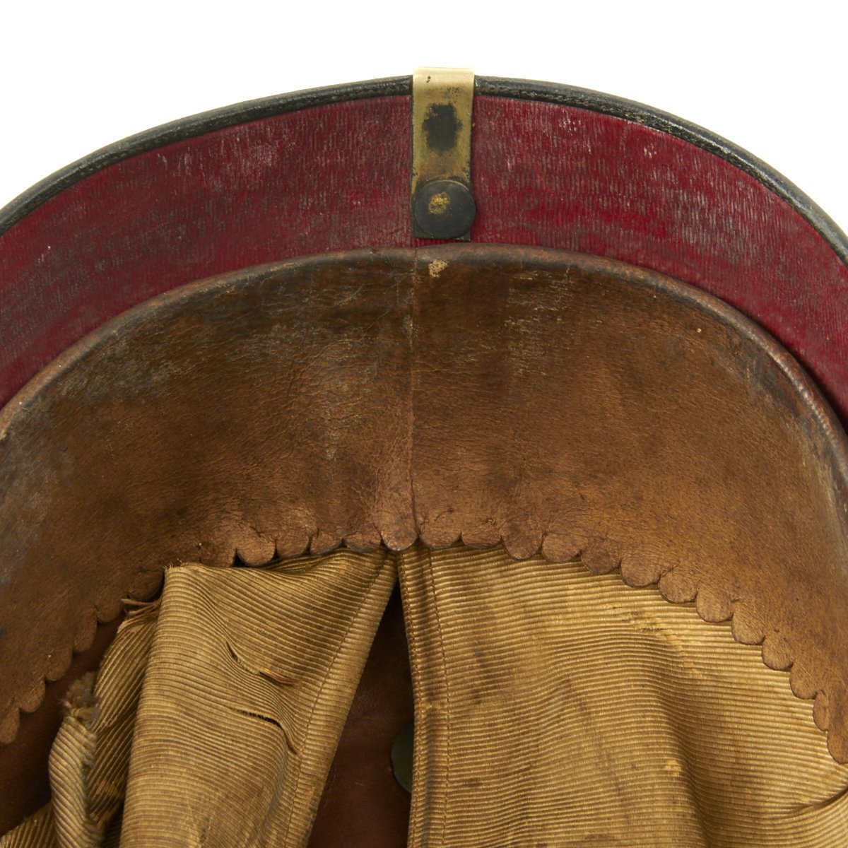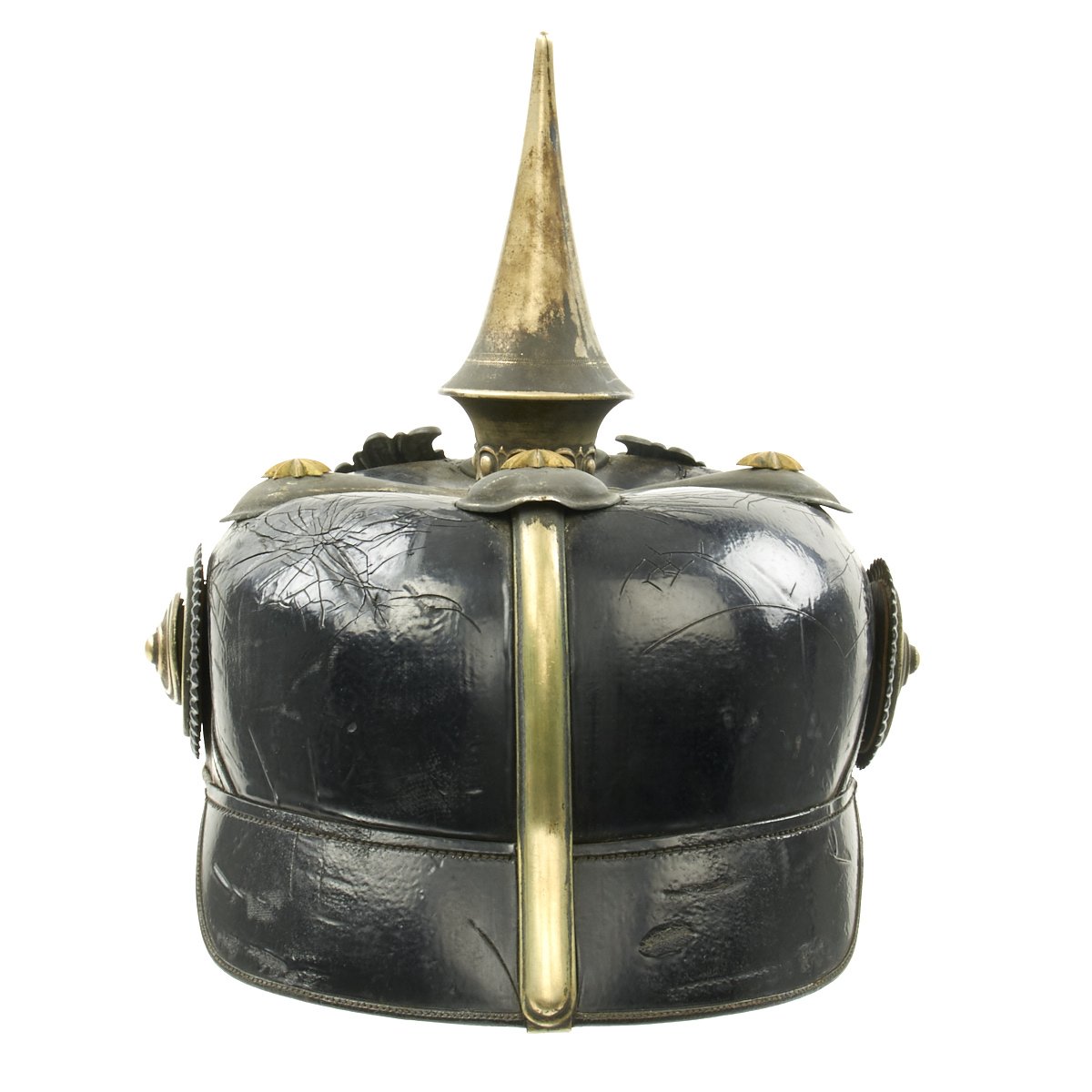 The helmet's interior reveals no depot marks on the back visor. It is approximately a size 7 1/8 US (57cm). The lacquer finished leather is in great condition having no serious issues, just the usual light cracking in areas. The shape of this pickelhaube is unfortunately a bit squashed, probably due to long term weight on the spike, something that we see quite often. There is also definitely some level of leather shrinkage due to age, which is why the some fittings are somewhat loose.