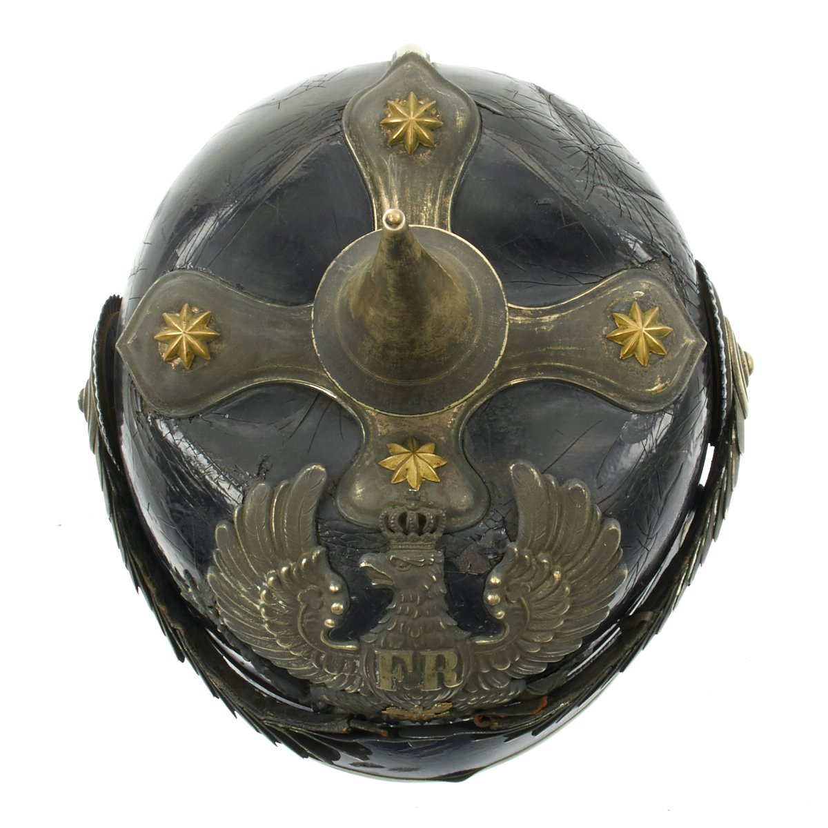 The German Silver officer spike atop the helmet is intricately decorated at the base with the usual "egg and dart" motif. The top of the spike screws off, revealing the fitting for a parade plume. Additionally, this pickelhaube has the old-style cruciform spike base, which after 1860 was still used ONLY by the Prussian Dragoon regiments. All other Prussian groups moved to a round base. This base still retains all 4 of the brass stars.
