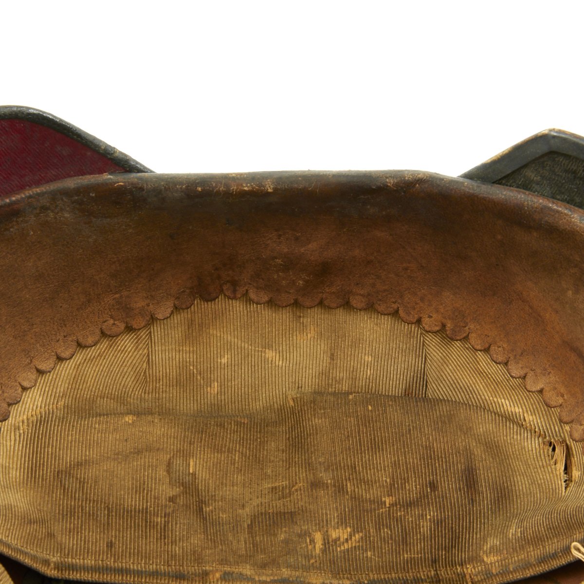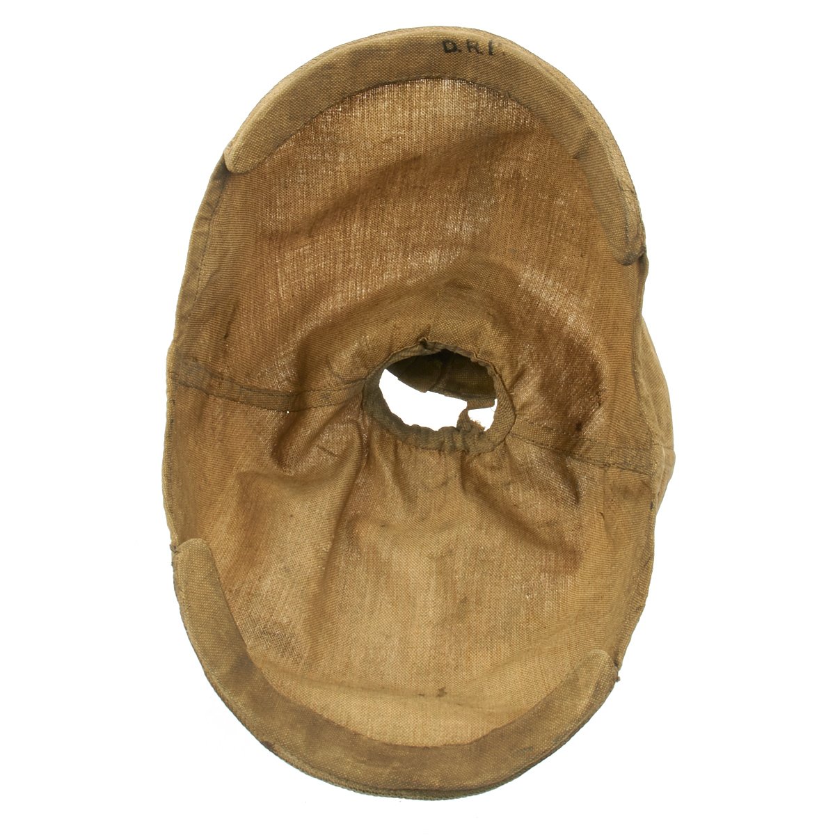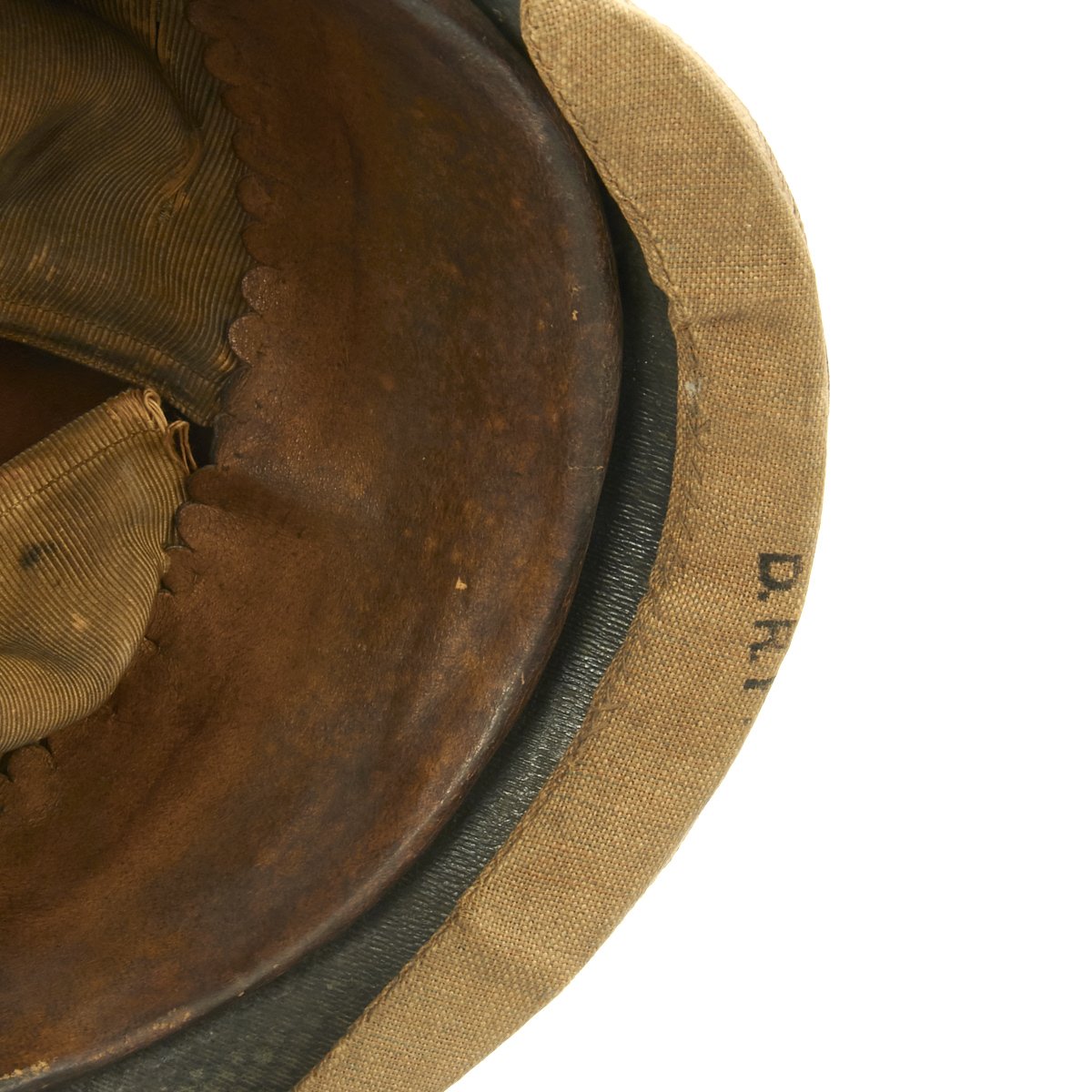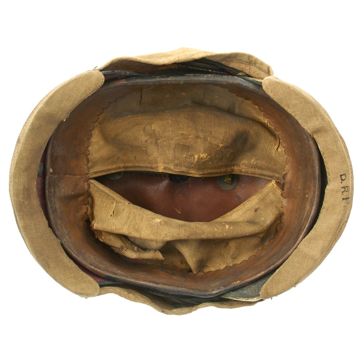 The inside liner is still present, complete with the original cream colored silk skull cap, which is in nice condition, though it does have some splits and definitely shows wear. The leather portion of the liner is nice and supple, with some staining. The helmet cover apparently was on this helmet for some time, and has accumulated quite a bit of dirt. It is in fair condition, but these are exceedingly rare in any condition.