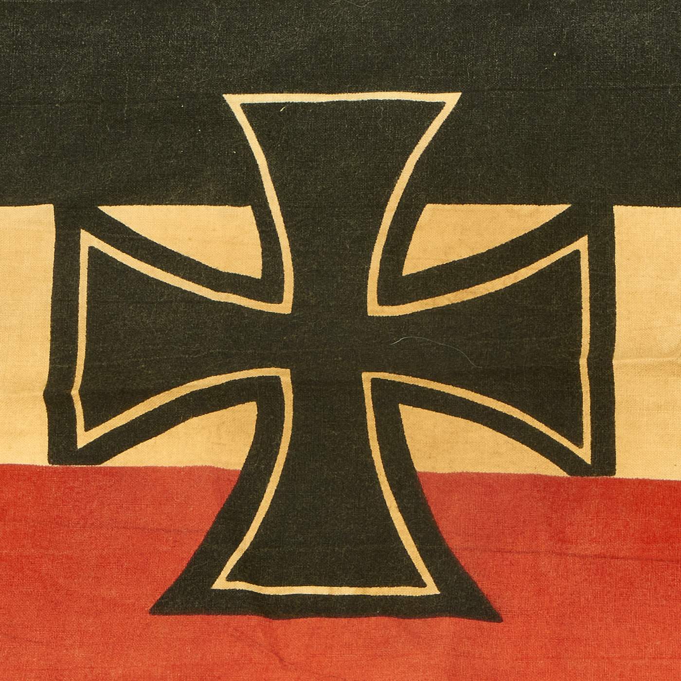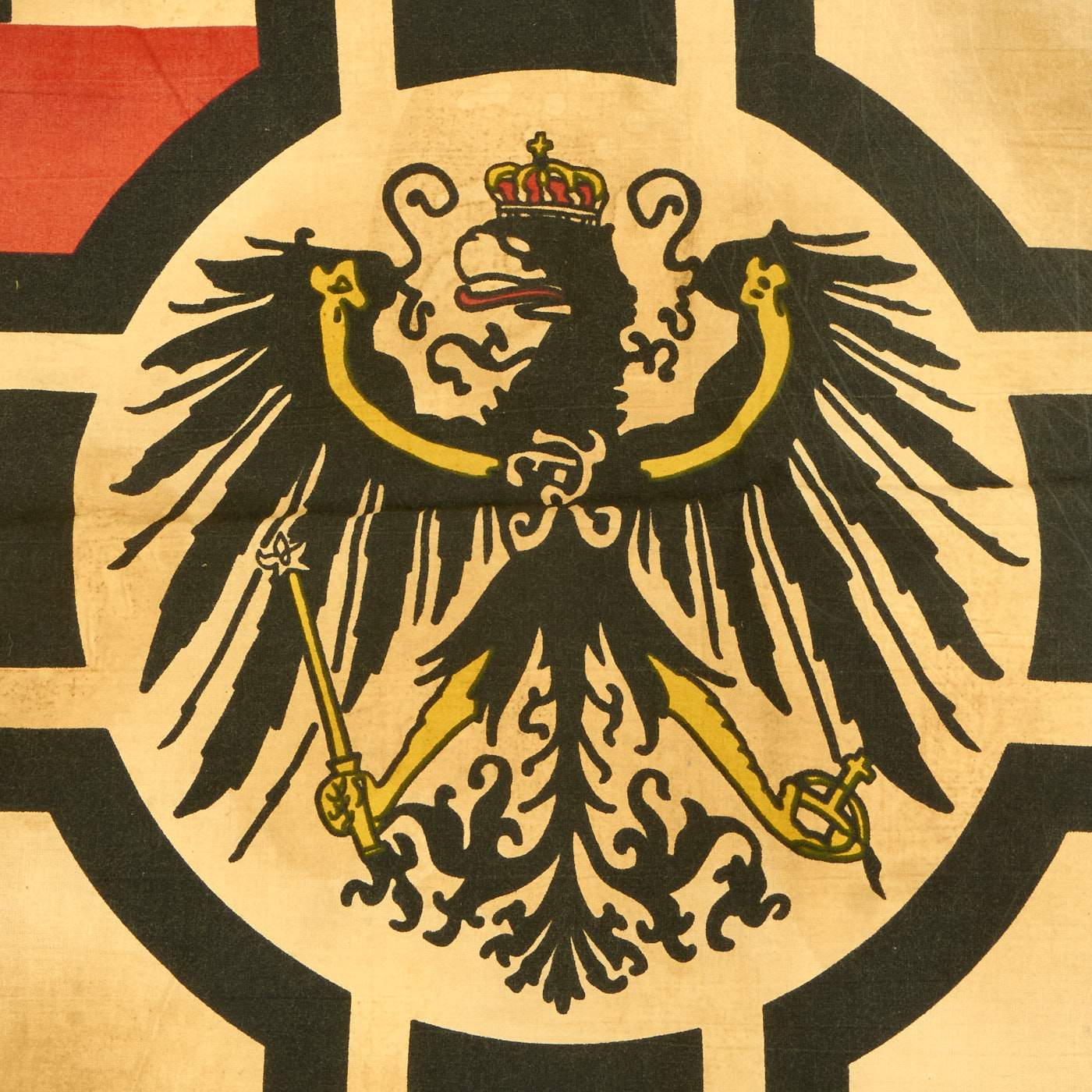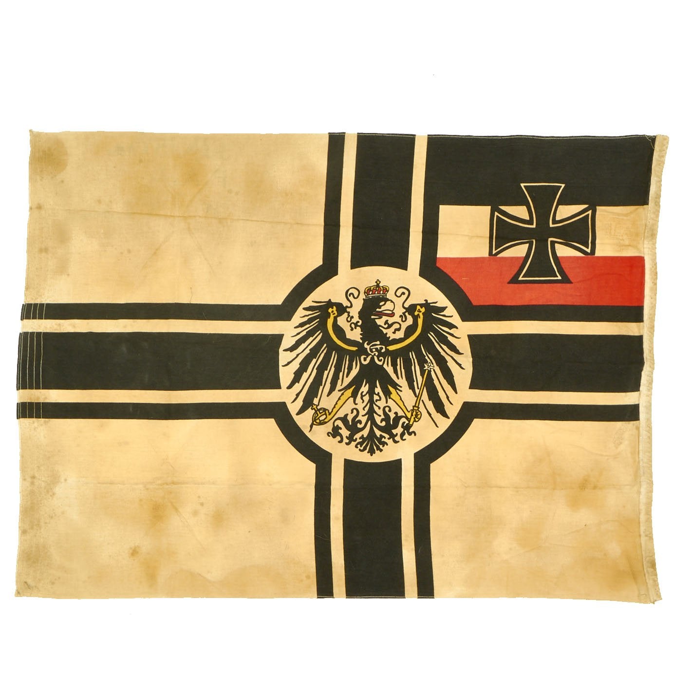 Original Item: Only One Available. This is a totally original authentic Imperial German WWI War Ensign Battle Flag (Reichskriegsflagge), with a large Balkenkreuz (Beam Cross) in the field, with a circle around the Imperial German Eagle at the intersection of the cross. The canton of the flag contains the imperial state colors and the Prussian Eisernes Kreuz (Iron Cross). The flag is made of cotton or linen, the standard material for flags of the period.