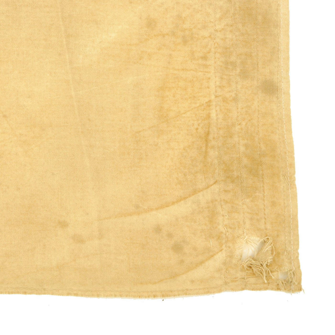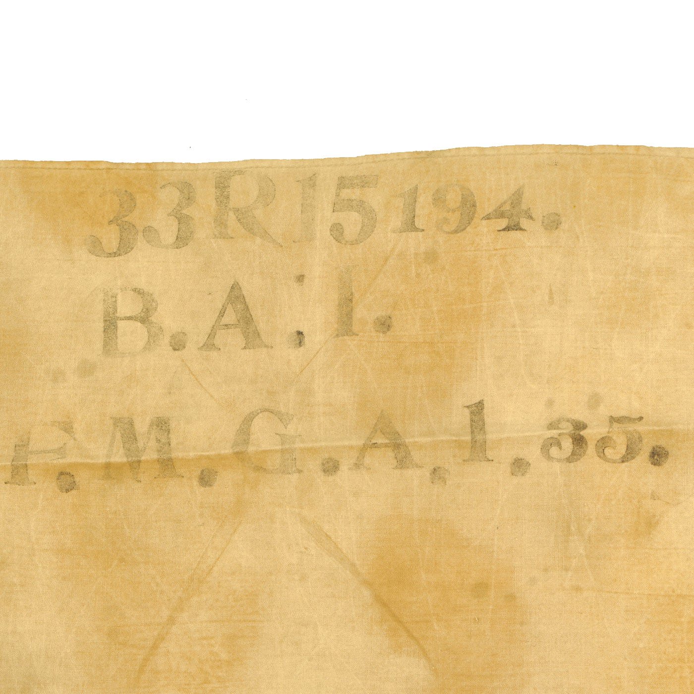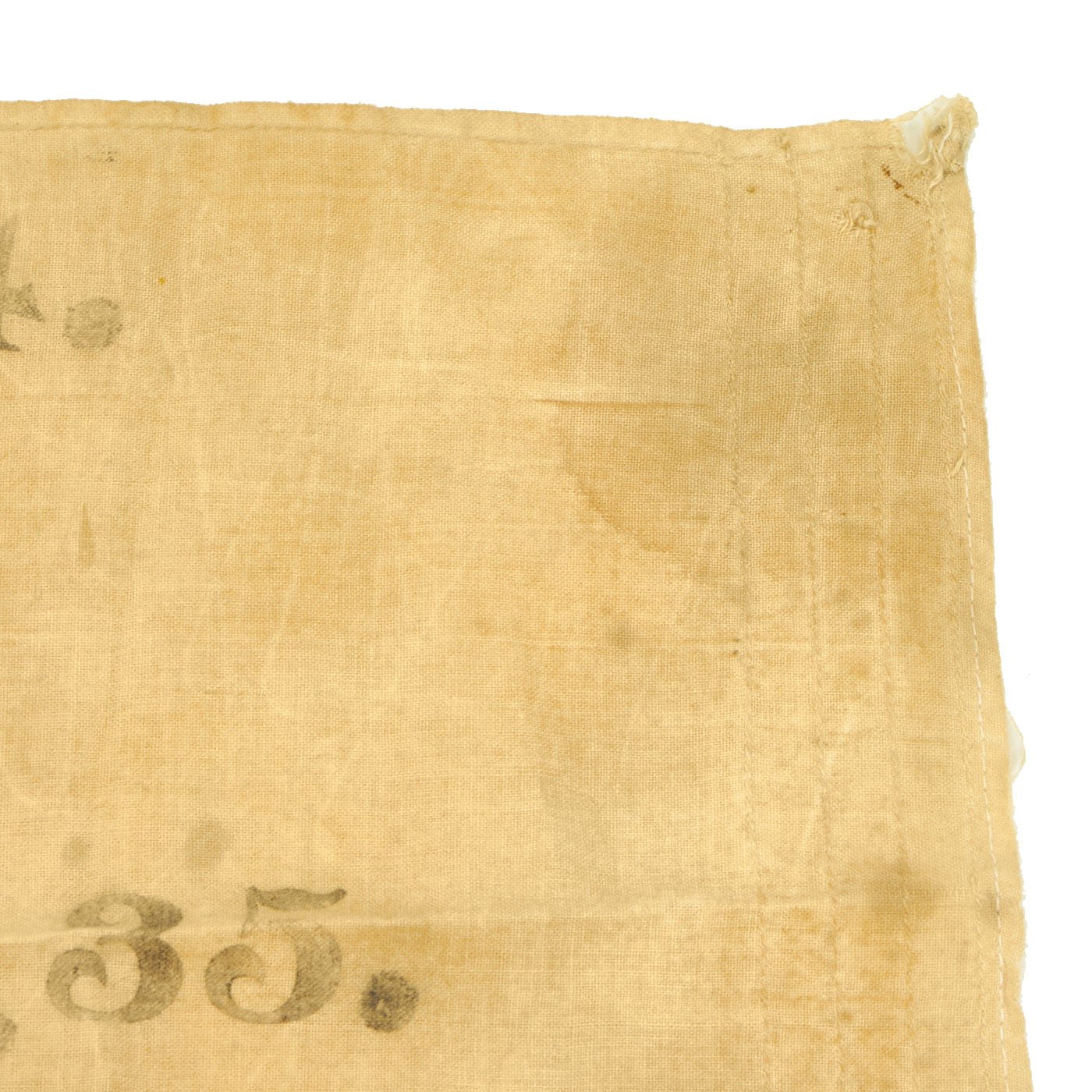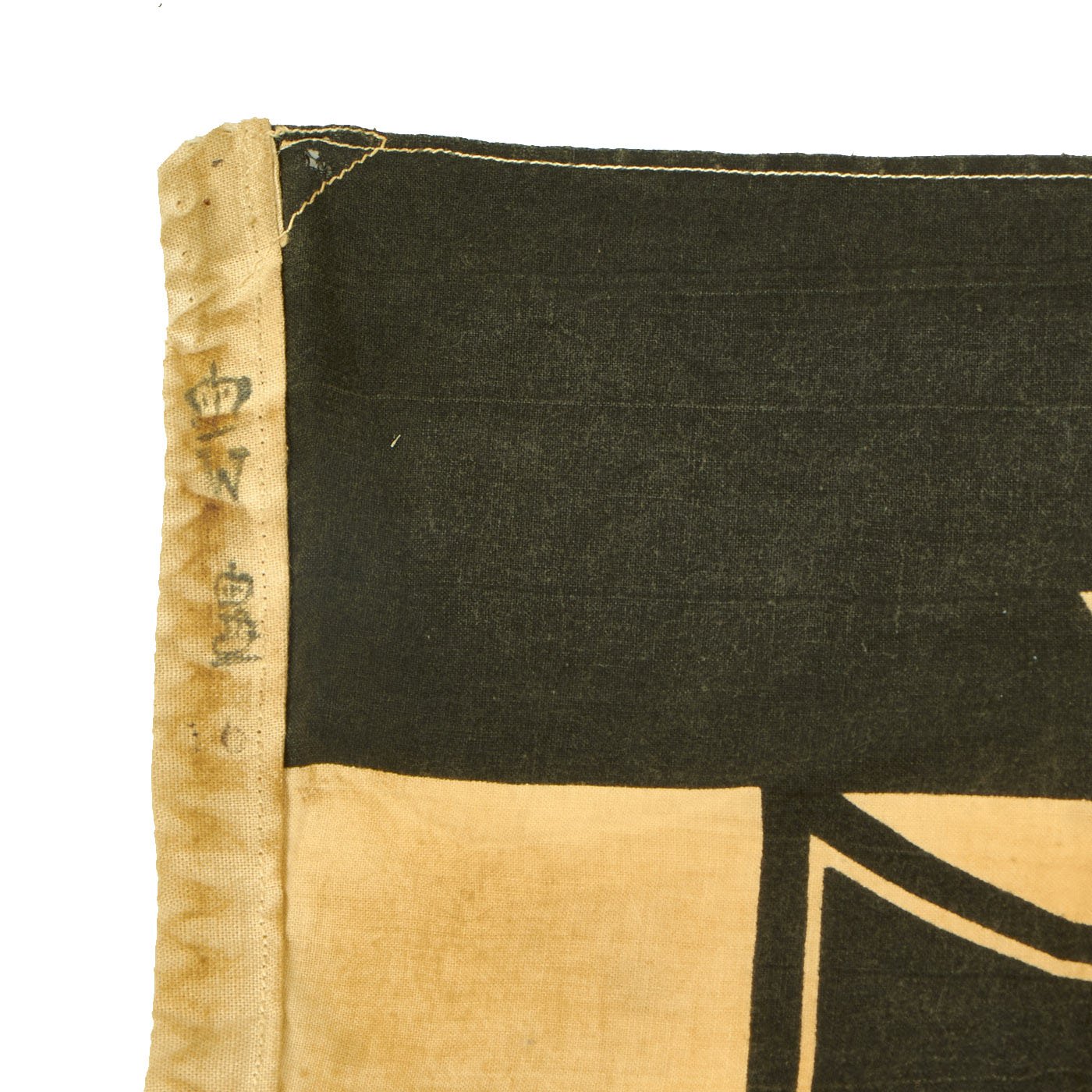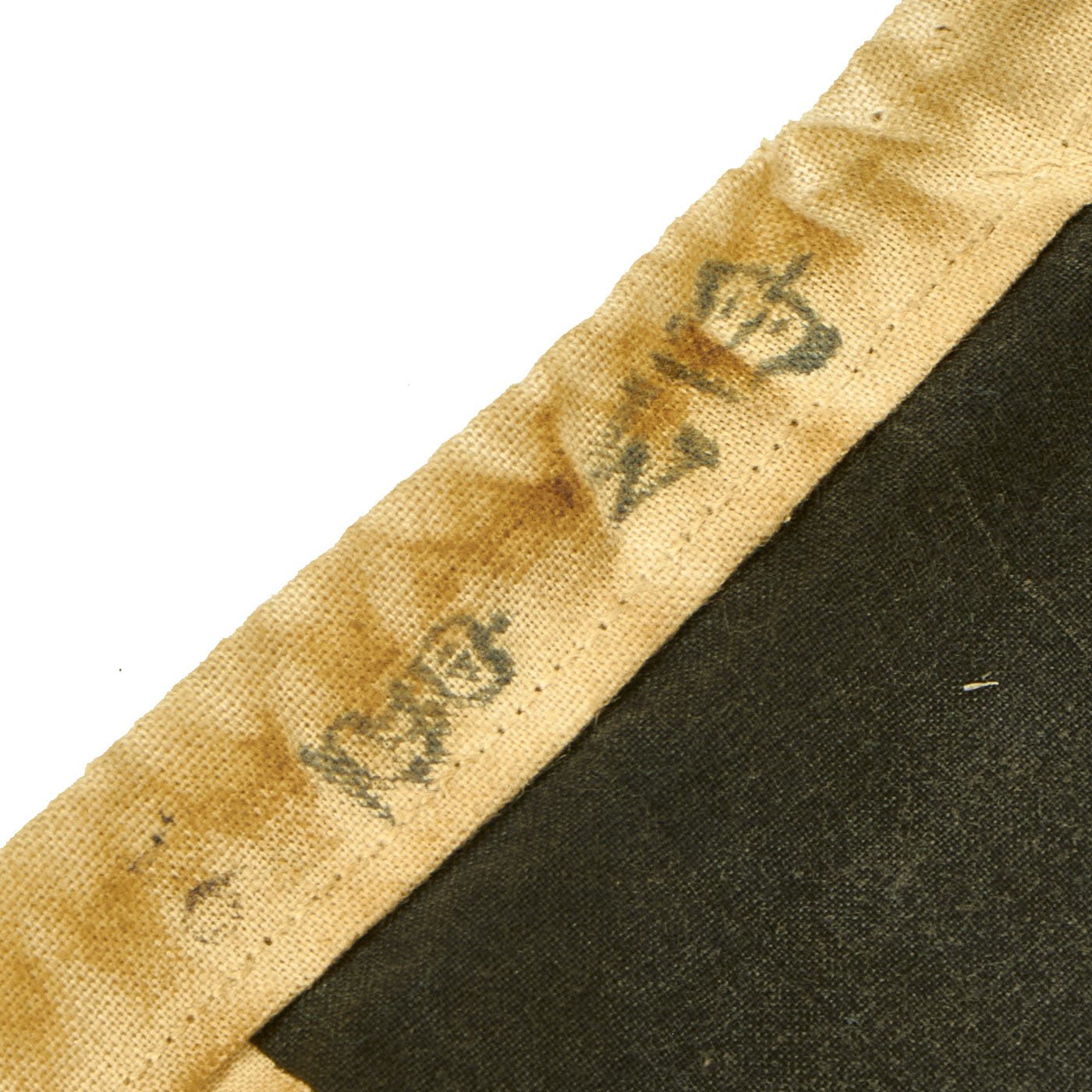 The flag measures 28" tall and 38" across, which is one of the smaller sizes used. The flag header is canvas, and is marked with the CROWN / W proof for Kaiser Wilhlem II, as well as another proof and the number 16, for issue in 1916. There look to have originally been hanger loops or tabs on the ends of the header, but they have been removed. These flags were usually used as "War Ensign" flags by Naval Vessels, however this example is relatively small, and looks to have been used by land forces. It has some faintly stamped regimental markings on the upper right portion: