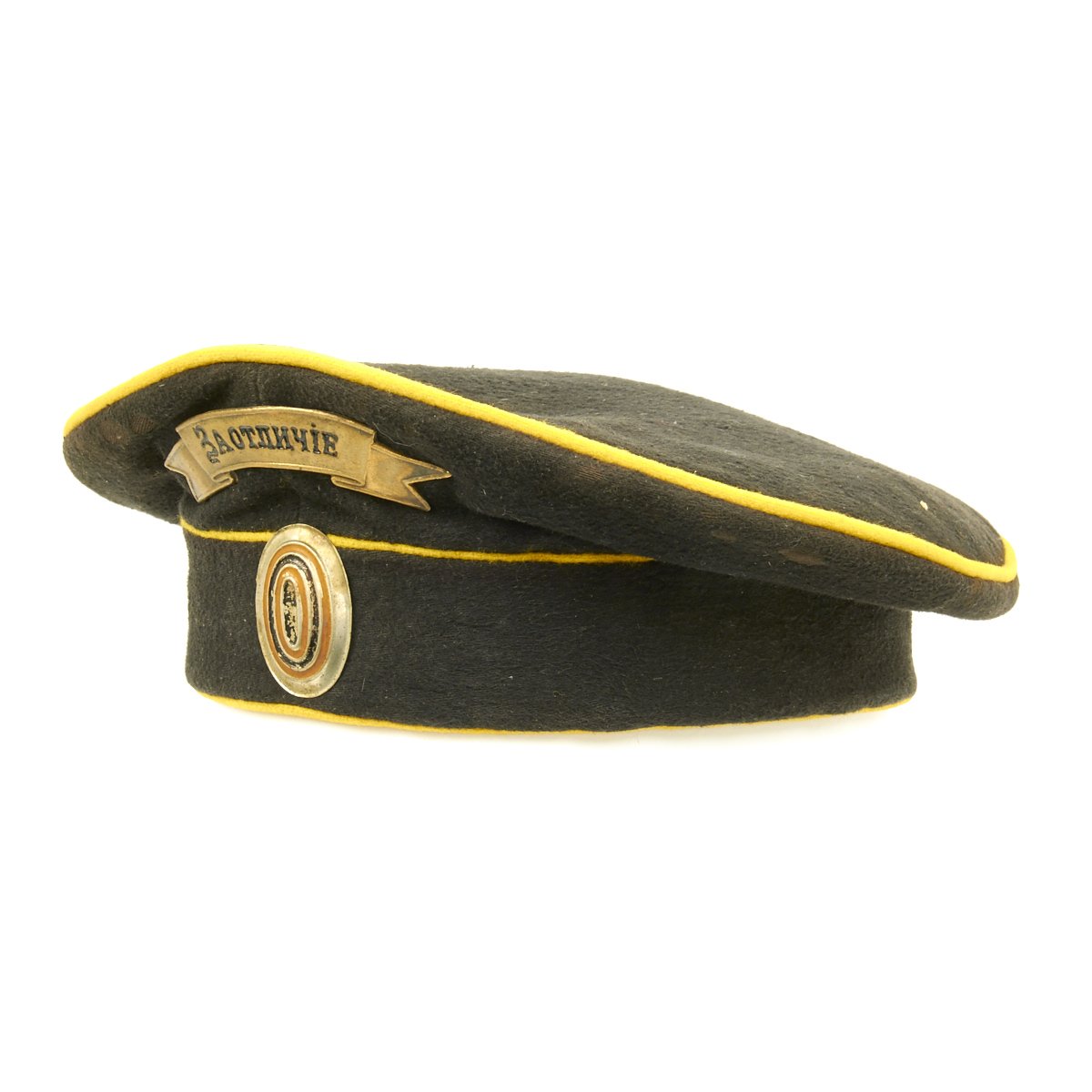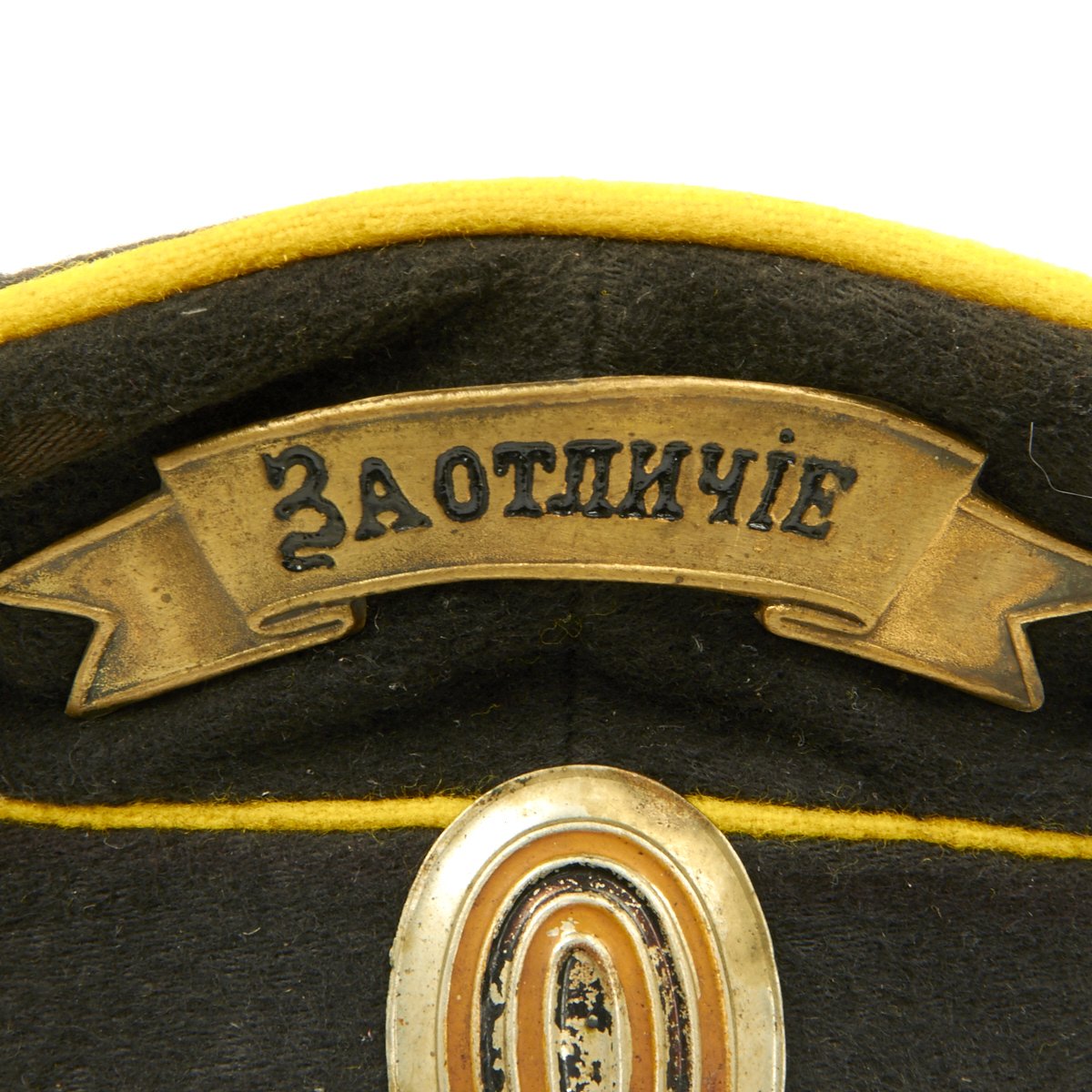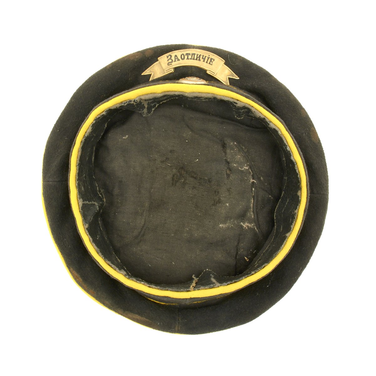 Original Item: Only One Available. A rare Imperial Russian Dragoon NCO Cap of deep blue wool construction with yellow piping. The front bears a brass badge with Cyrillic writing that roughly translates to “For Zeal” and a metal rank cockade. Interior is black cotton lining and a dark leather sweat band. Offered in very good condition, this is the only example we've ever seen!