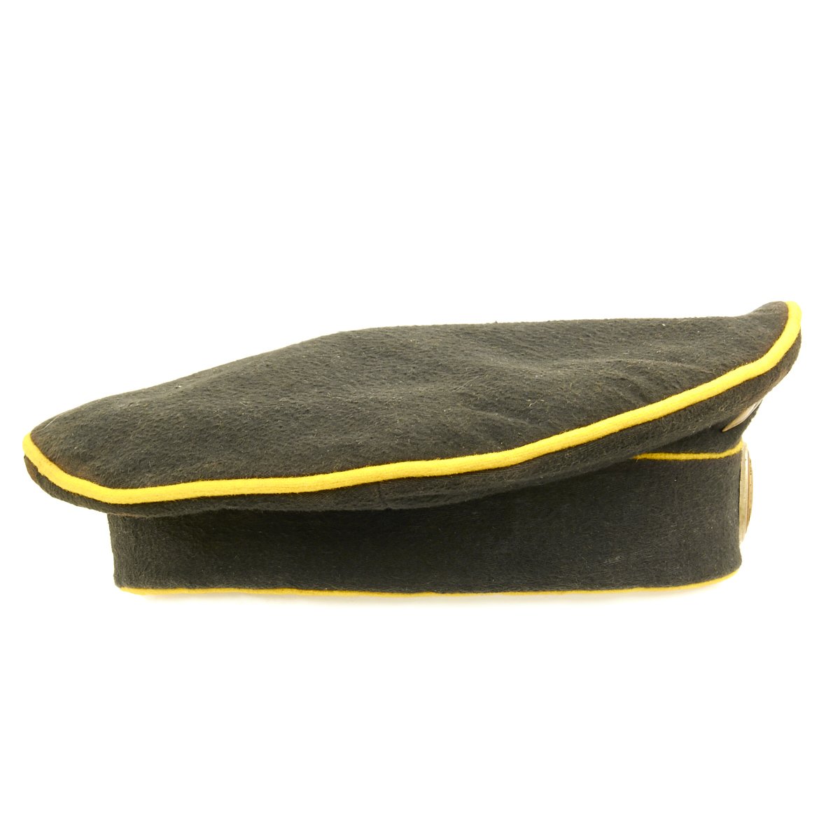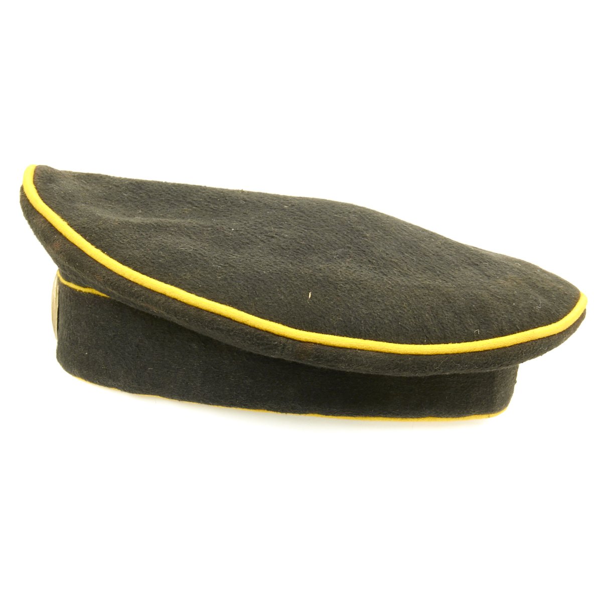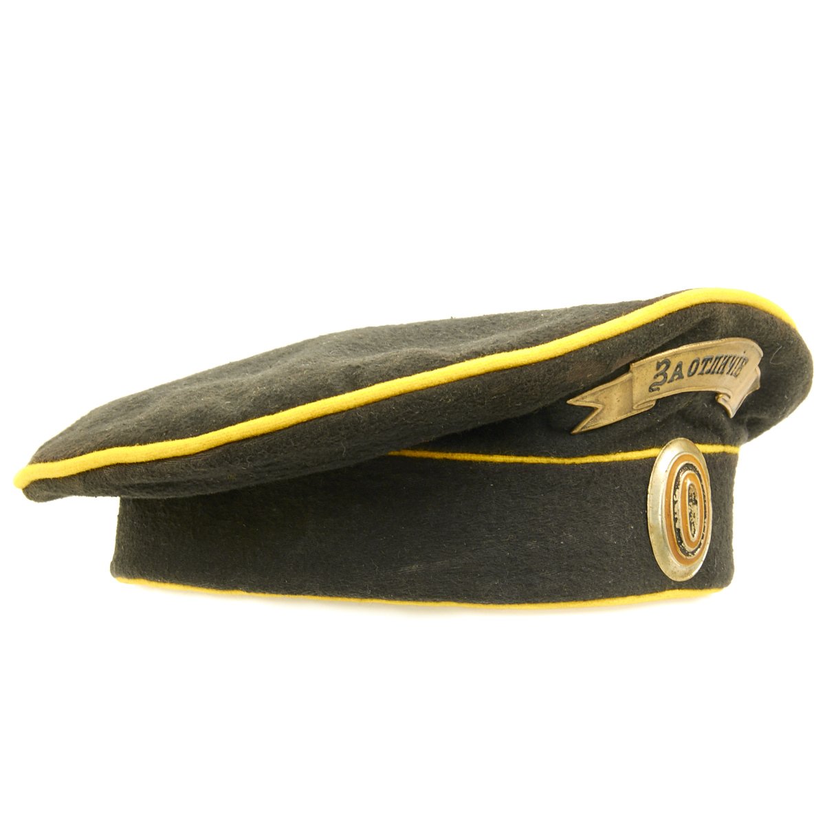 Original Item: Only One Available. A rare Imperial Russian Dragoon NCO Cap of deep blue wool construction with yellow piping. The front bears a brass badge with Cyrillic writing that roughly translates to “For Zeal” and a metal rank cockade. Interior is black cotton lining and a dark leather sweat band. Offered in very good condition, this is the only example we've ever seen!