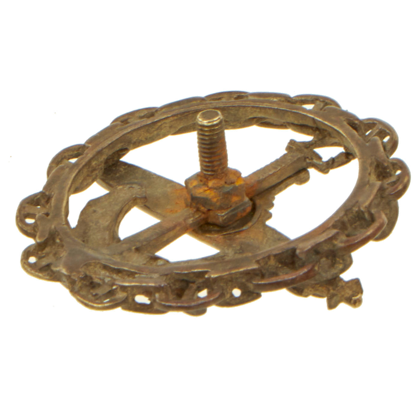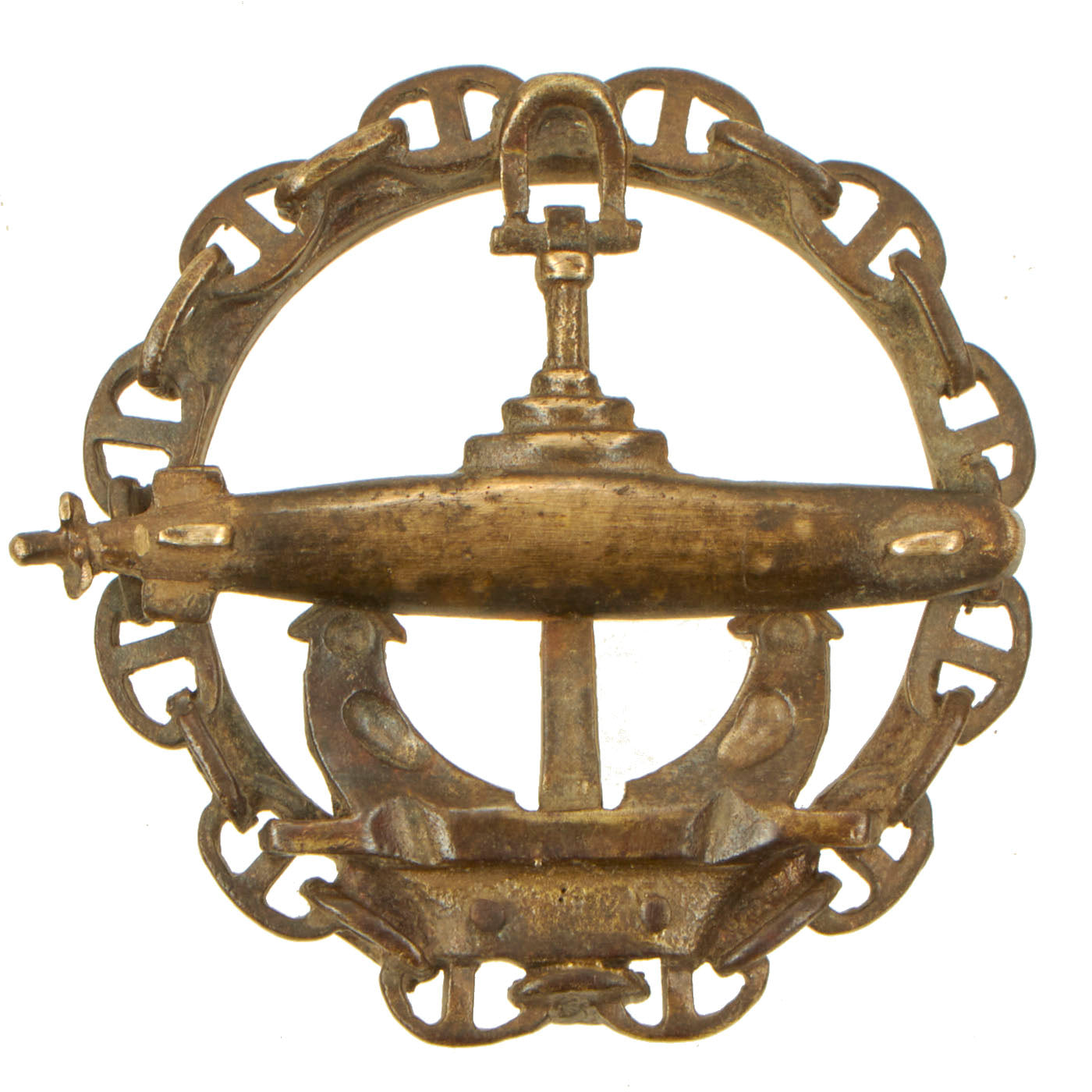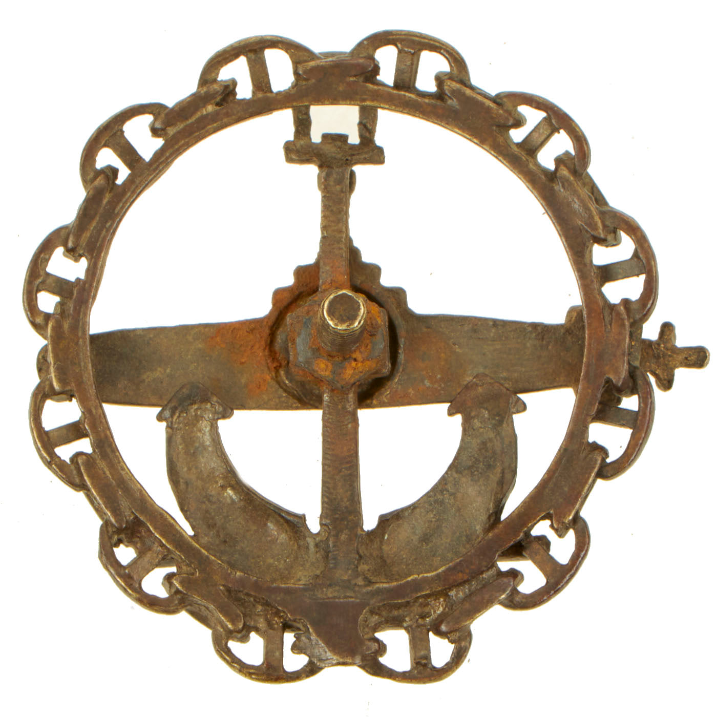 This particular badge was issued to Russian officers within the Imperial Russian Navy. It features a submarine in the middle, with an anchor in it bordered by a chain. The badge is in good condition but unfortunately no longer has the screw back present with it.