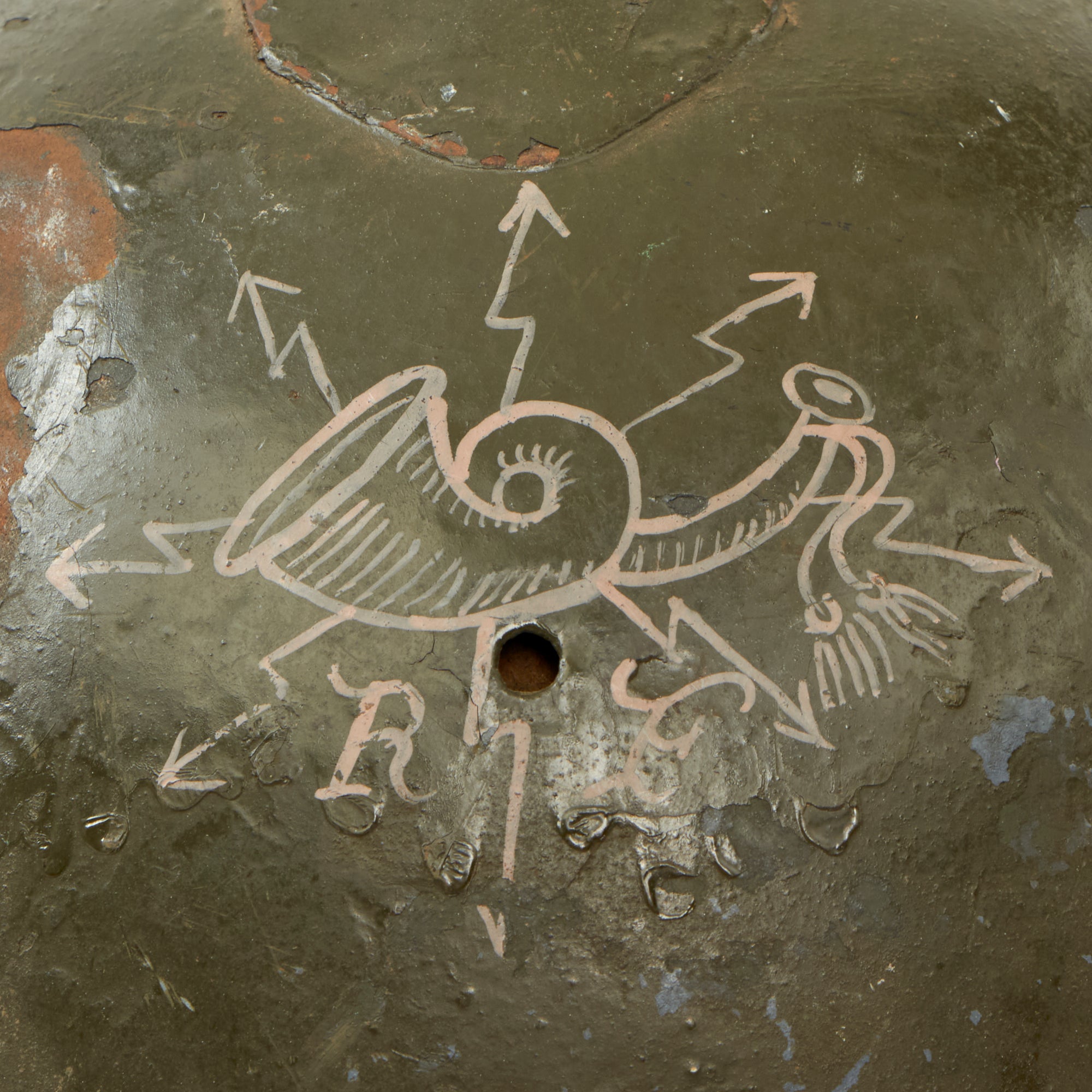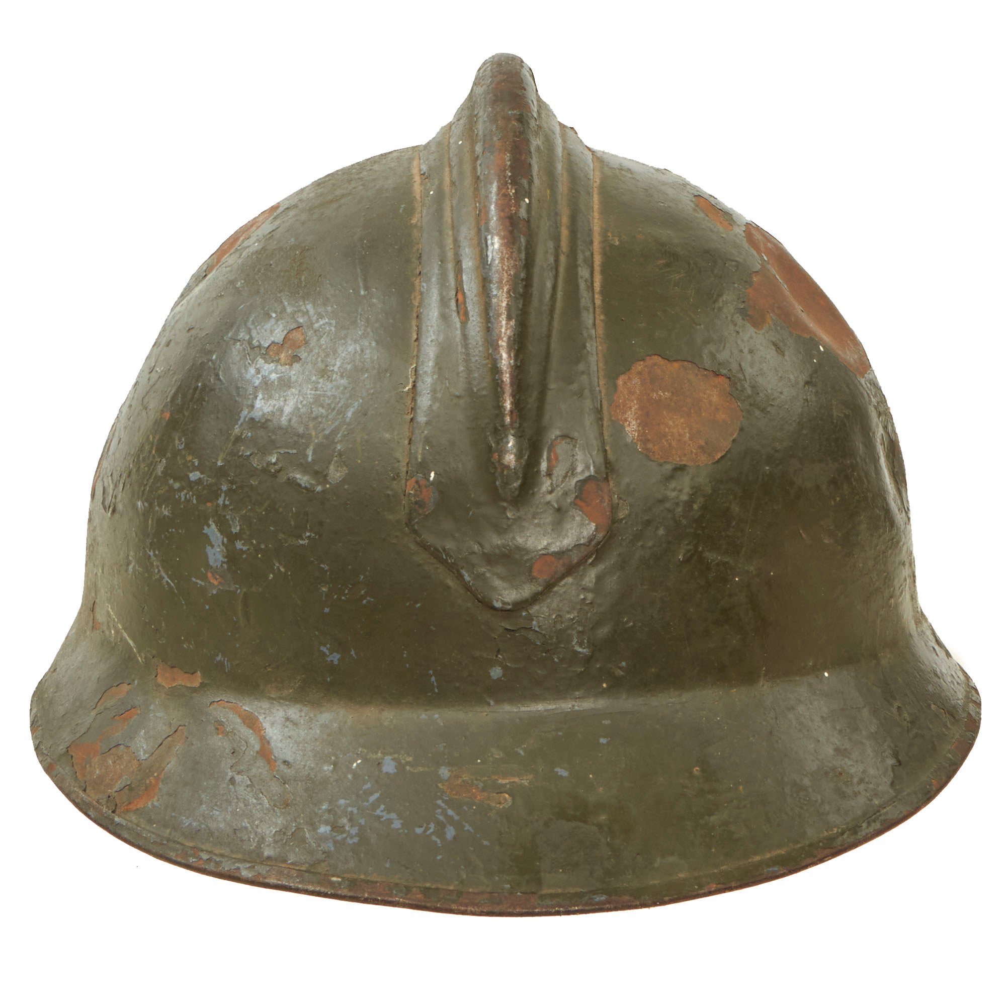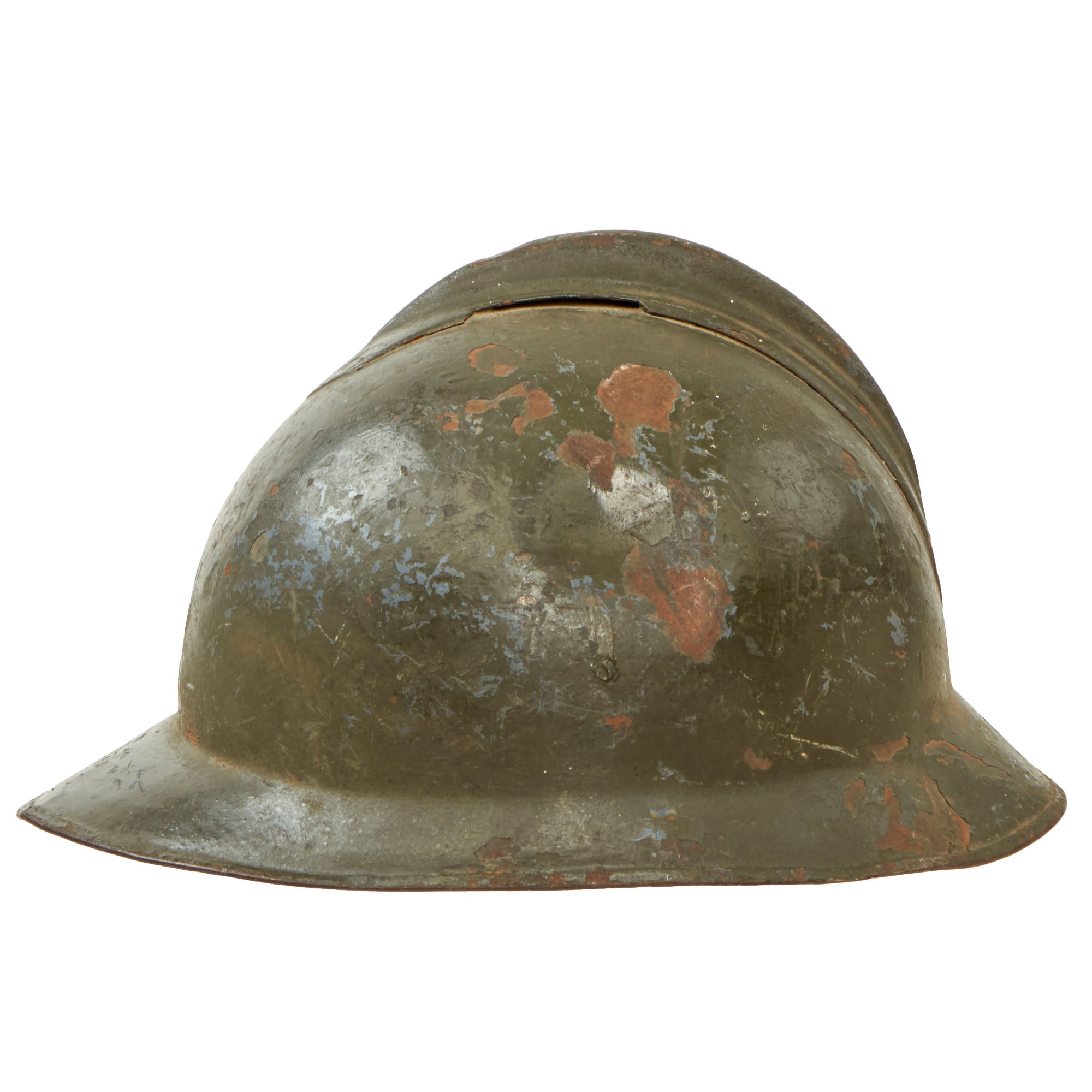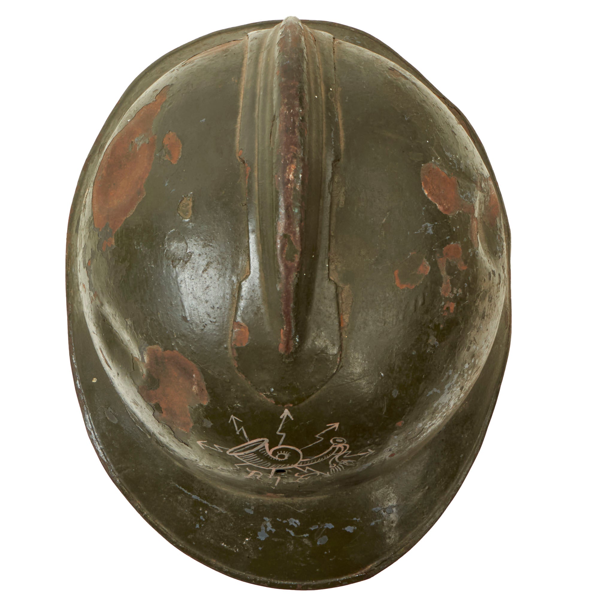 Original Item: Only One Available. This is a good example of a World War I Model 1916 Italian Army Lippmann model helmet. These helmets are near identical to the French M1915 model, with some key differences including the top comb being welded instead of riveted, and the exterior being painted green. This example has an insignia painted on the front featuring an RF below a horn.