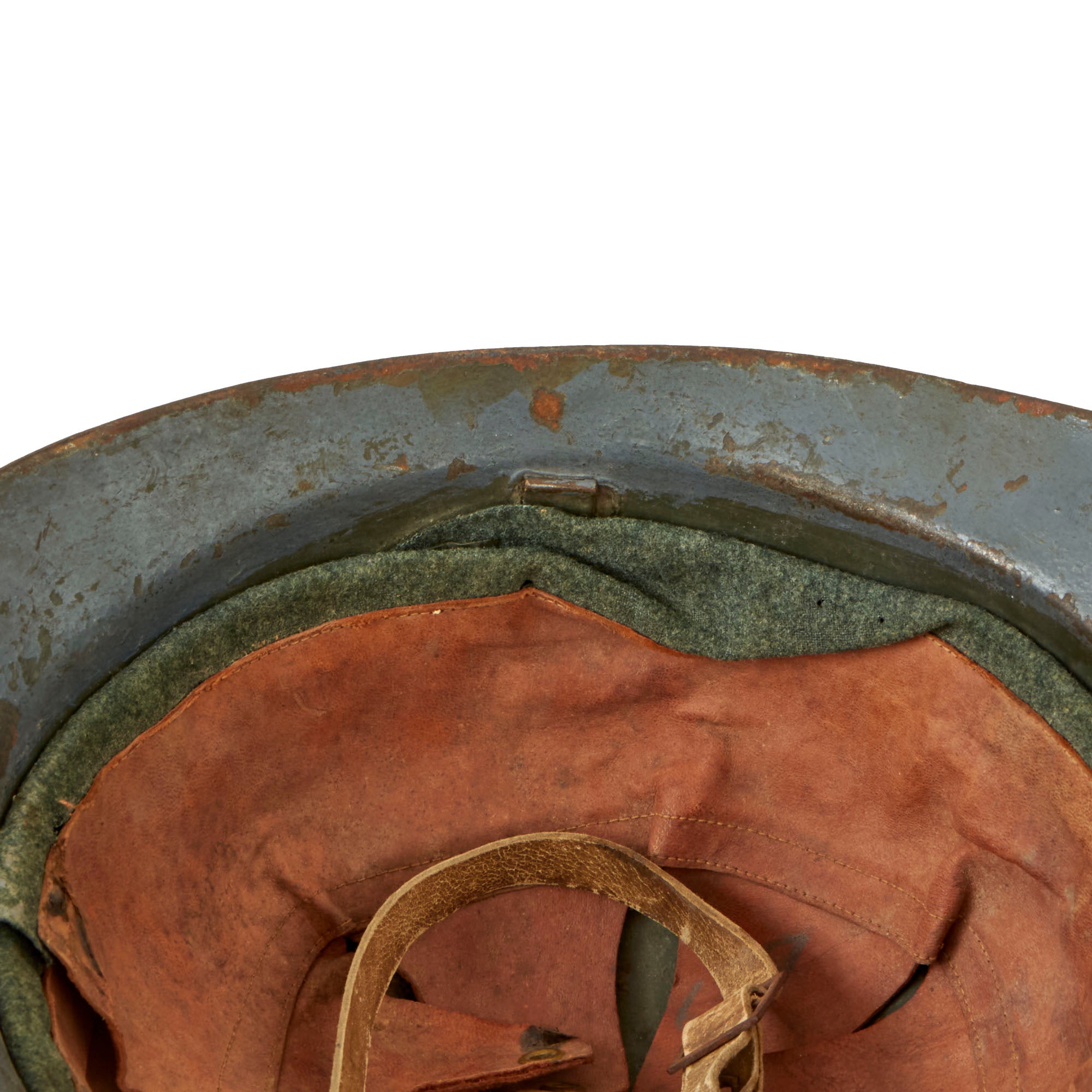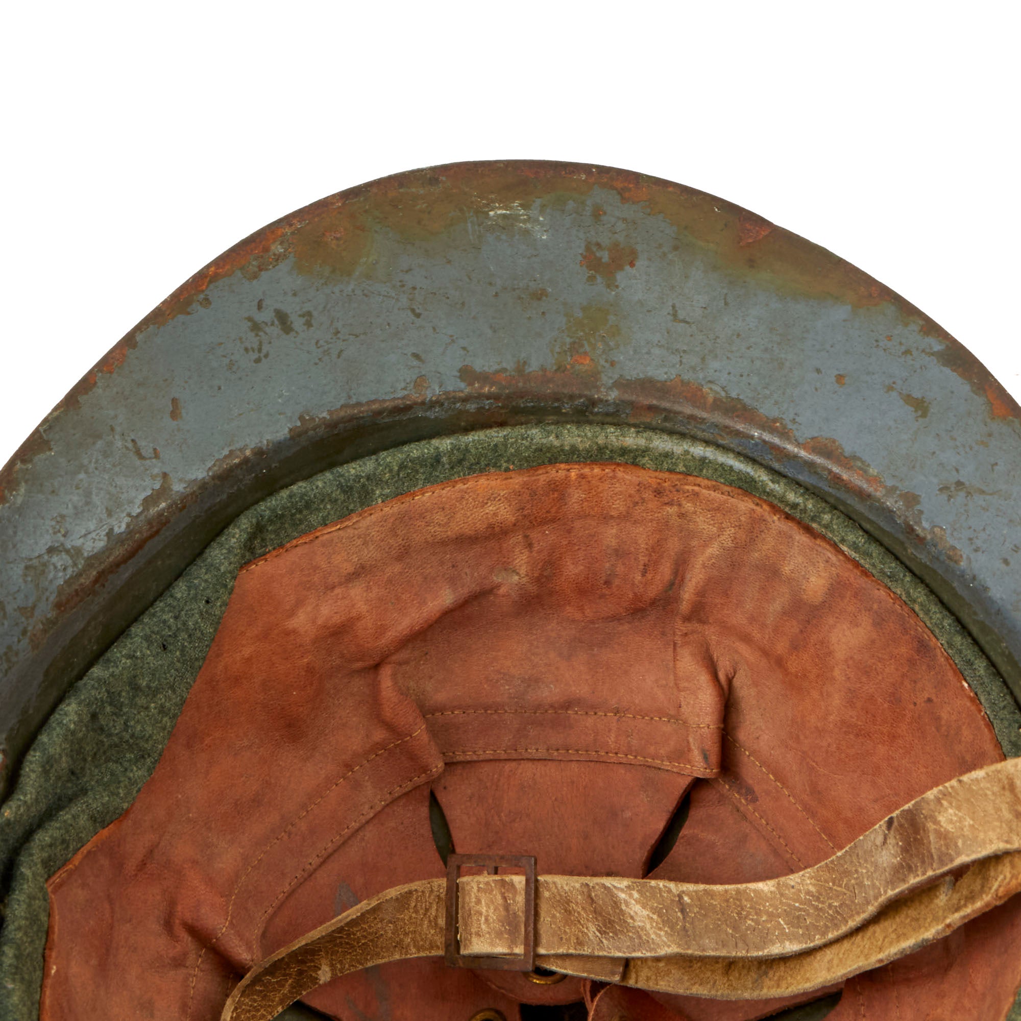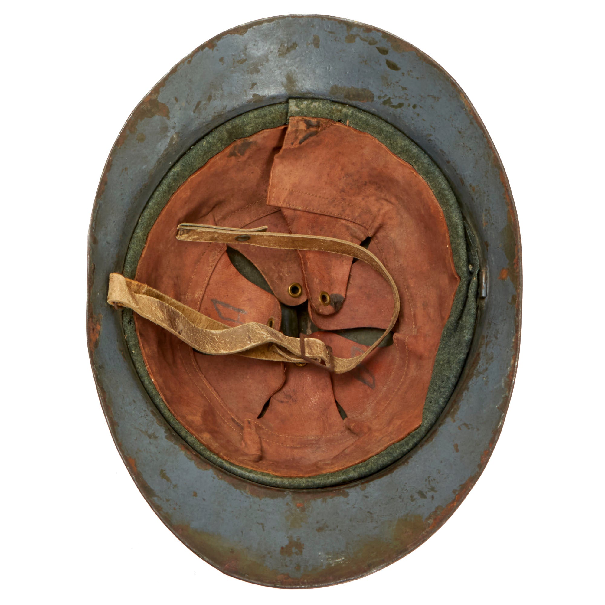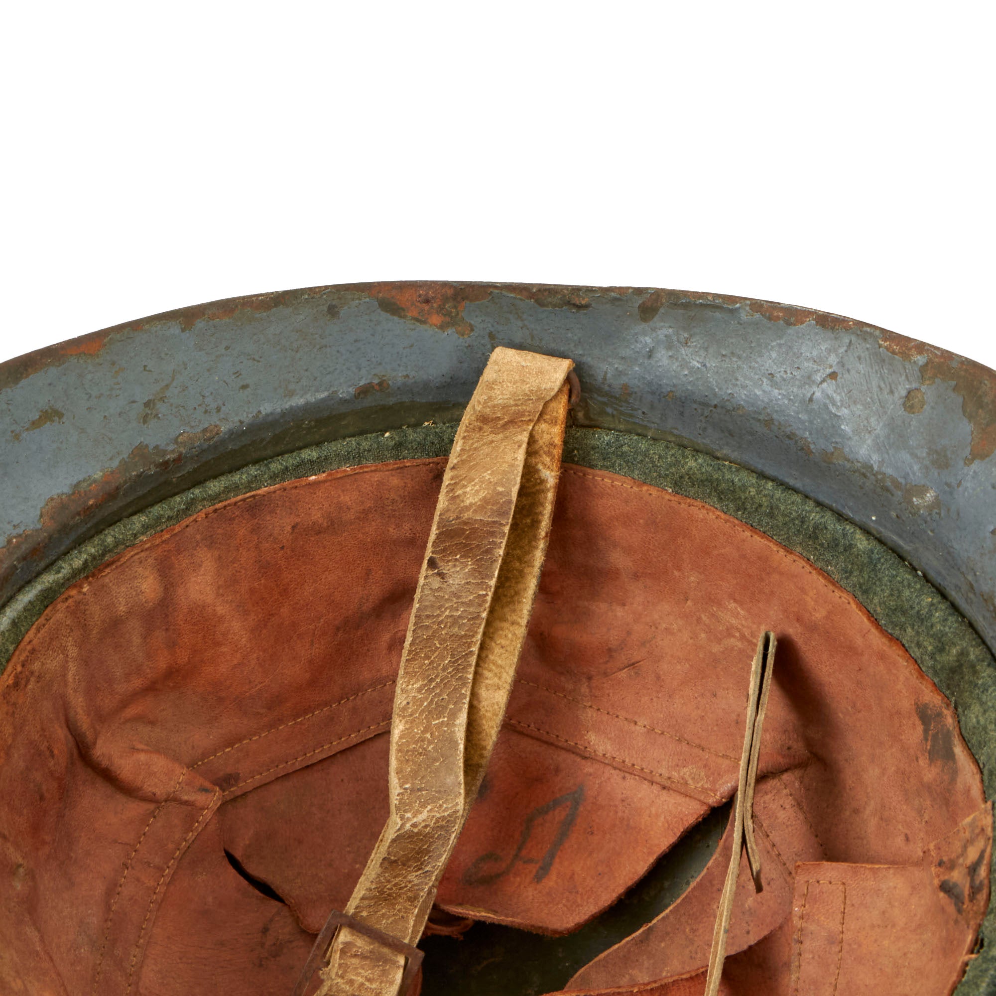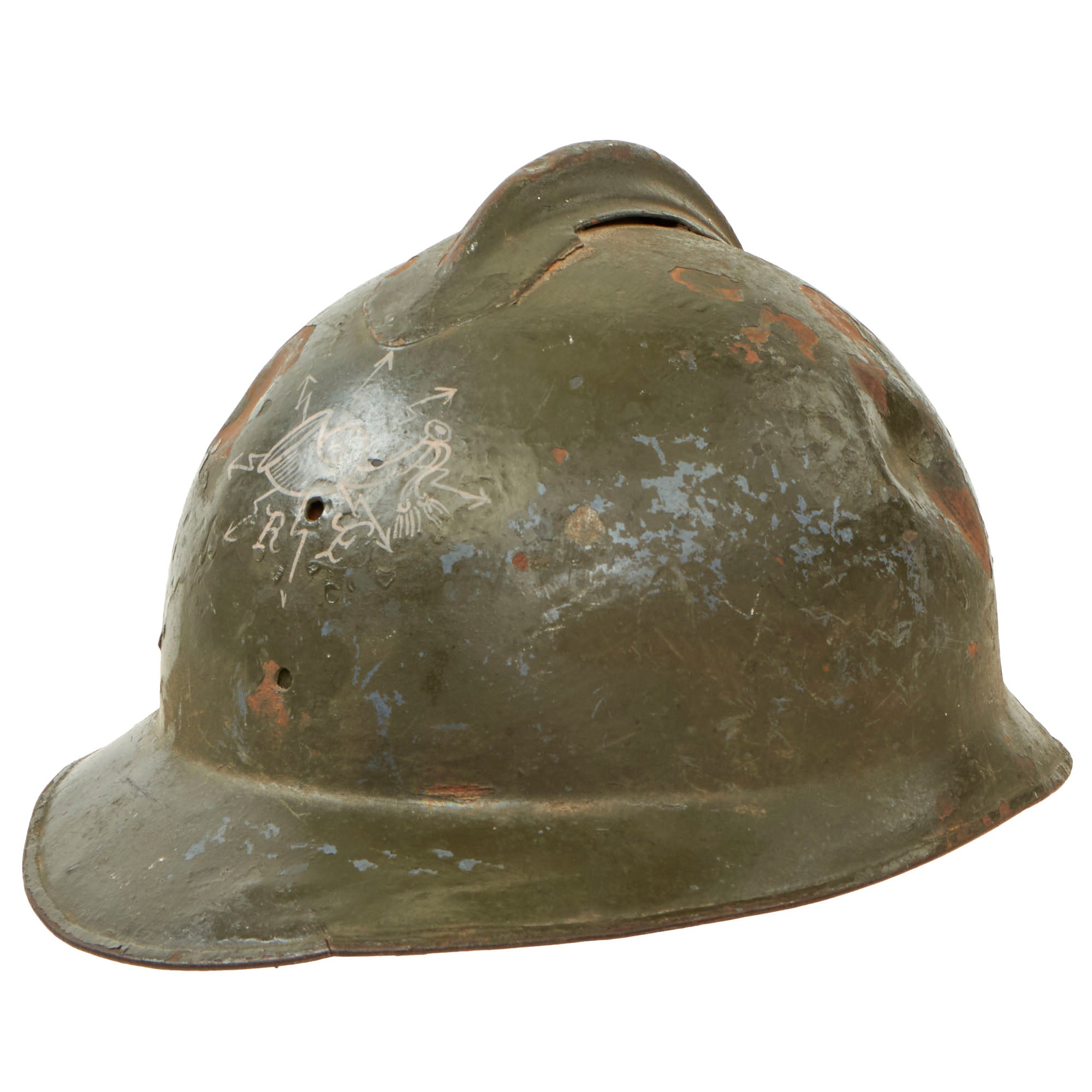 This helmet has a full liner with a good chinstrap, but one of the posts has been lost, so the chinstrap only connects to one side. The liner is initialed and named, although it is faint. The insignia painted on the front appears to be French, with the RF that appears on all French Adrian badges, and a horn akin to that of the French Light Infantry Adrian badge. There are remnants of blue paint which appear to be on top of the green paint. There are two holes punches for an insignia, but this is not seen with the M16 Lippmann helmets, so the holes may have been added later. The insignia is interesting and requires further research. There is a dent in the side of the helmet as shown. Overall fine and ready for display.