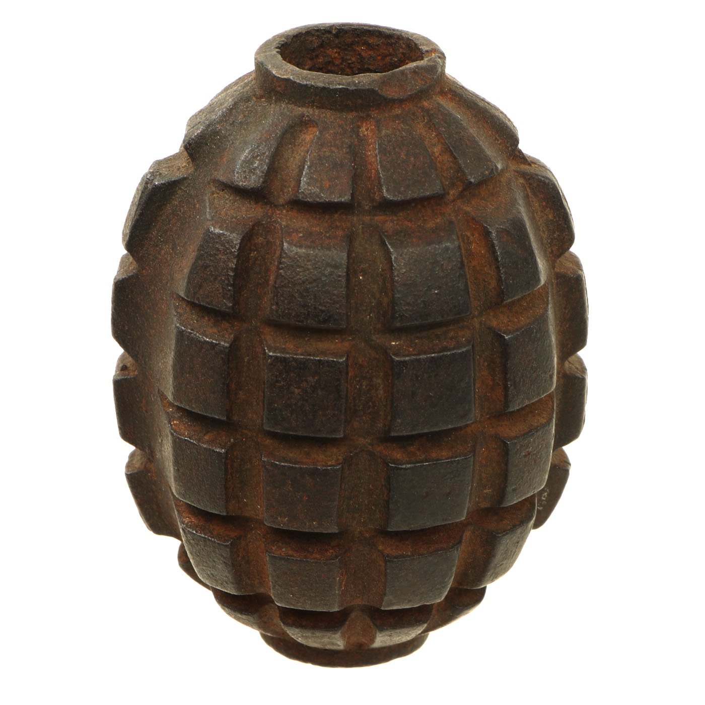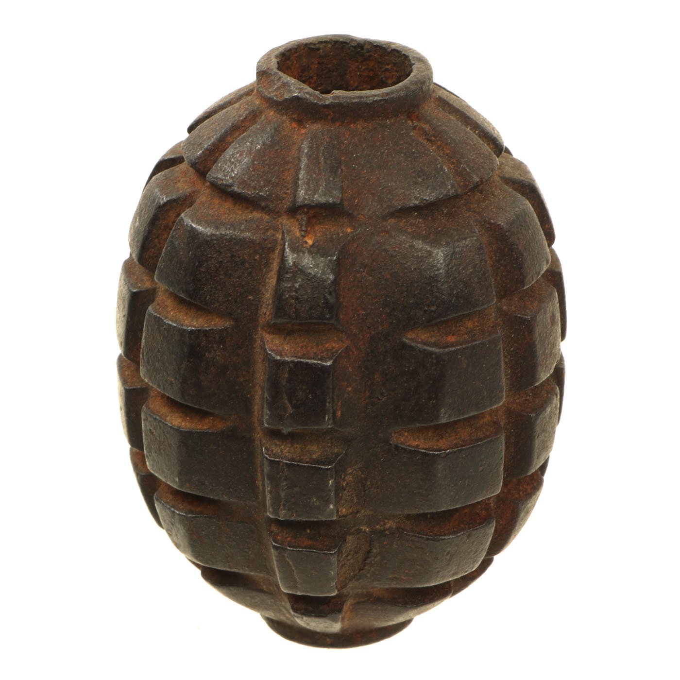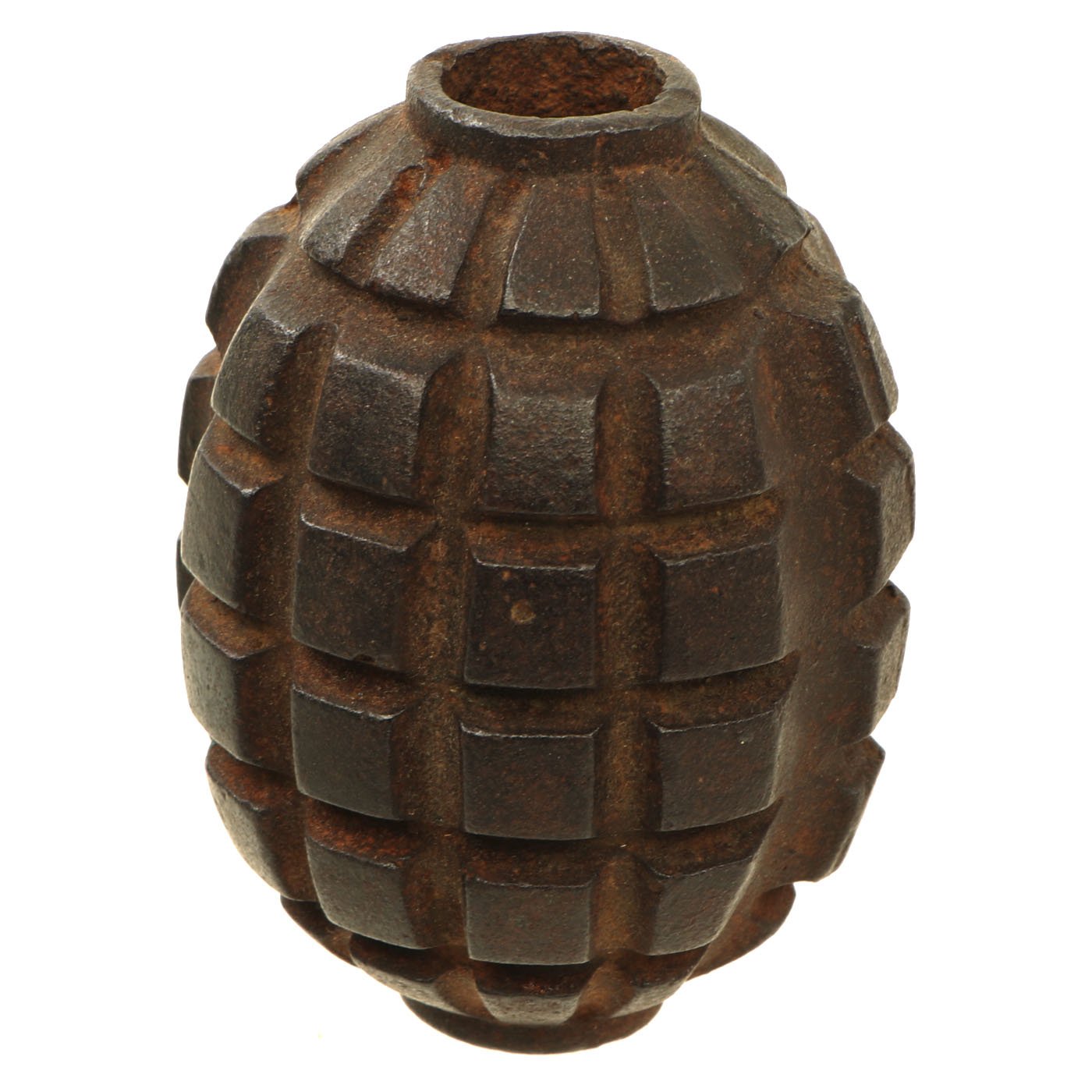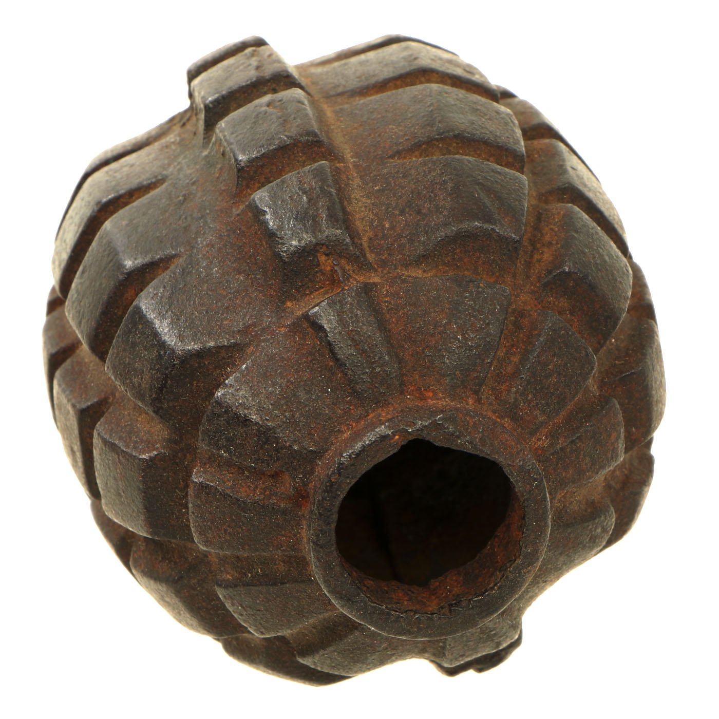Original Item: Only One Available. This is a very nice example of a WW1 era Italian S.I.P.E. style grenade body, which is a variant that we have not seen before. Unlike most, it is open at both ends. It is however definitely well made, and shows modern casting techniques. The grenade body itself looks fairly modern in design, looking similar to the French F1 and US Mk II grenades, but larger at about 3 3/8"long x 2 1/2"wide. S.I.P.E. is an acronym for Società Italiana Prodotti Esplondenti (Italian Society of Explosive Products), the company that designed the grenade and made explosives and other ordinance for the military. However, not much else is known about these grenades.