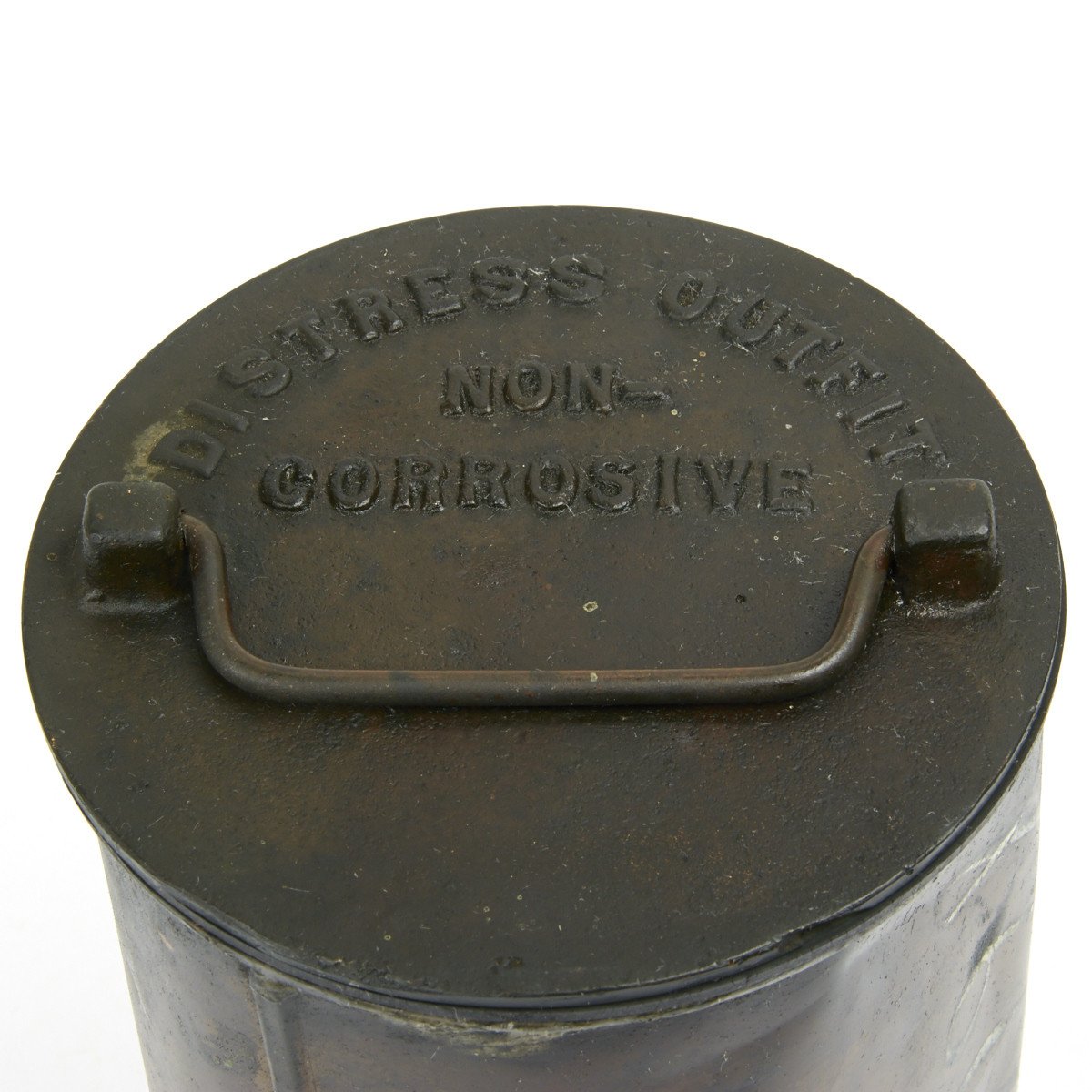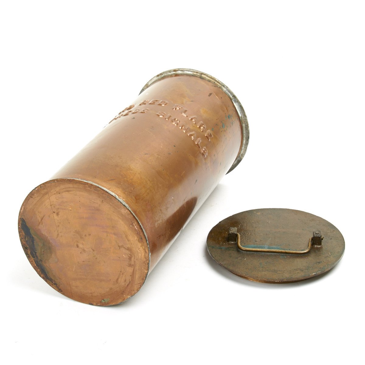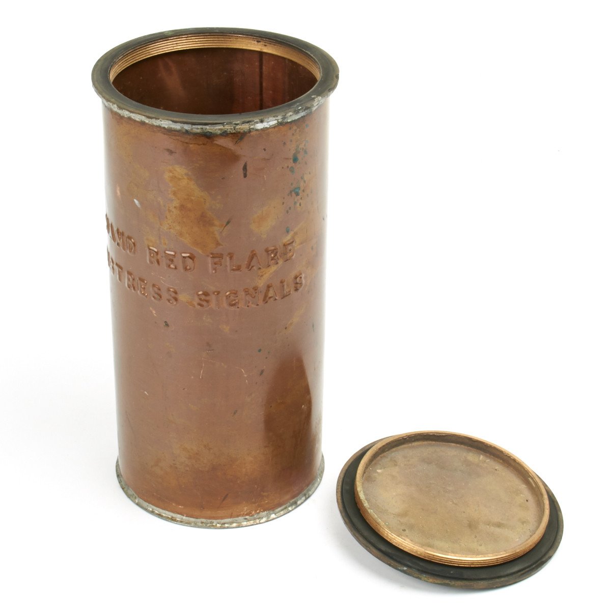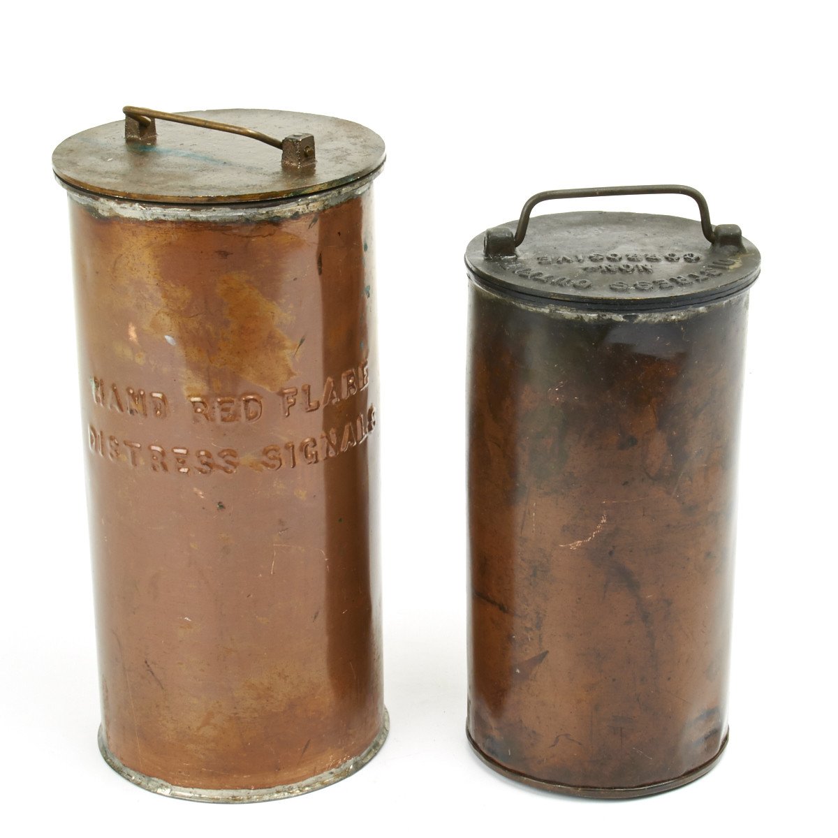 Original Items: Only One Set Available. These are a set of two copper canisters designed to be watertight in order to store distress flares. We believe they date from the early 20th century and each has a heavy screw top lid.