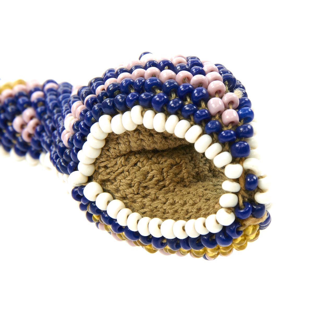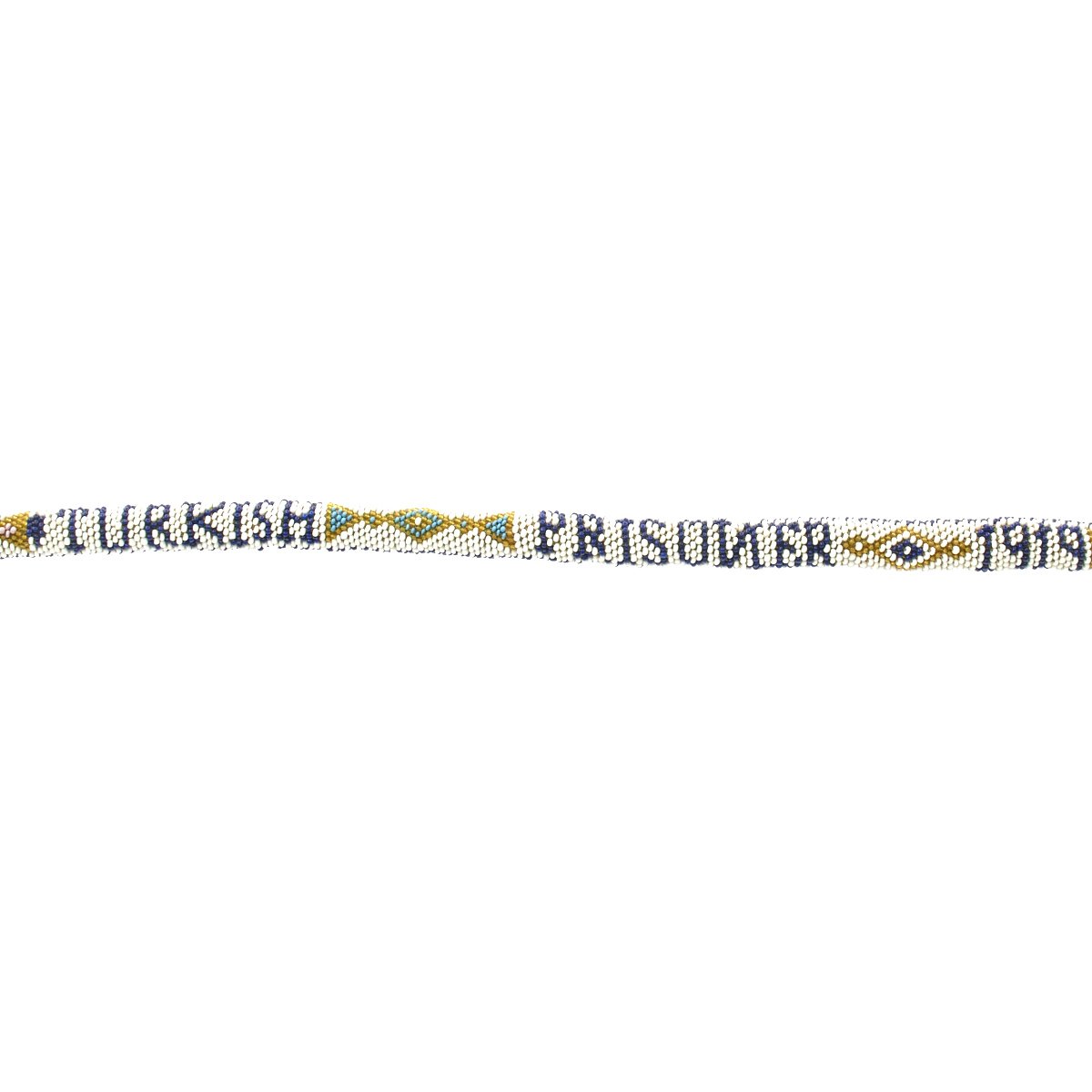 With blue beads spelling out: TURKISH PRISONER 1919, this piece was made by the beaded crochet method or weaving on small looms. Crochet beaded snakes were the most popular of the beaded souvenirs created in the prisoner of war camps at the time. This is probably for two reasons, firstly a snake is basically a tube, a very easy shape to make with bead crochet. Secondly, snakes were a symbol of good luck in parts of South East Europe, so the prisoner of war snakes could have had a symbolic importance for their makers.