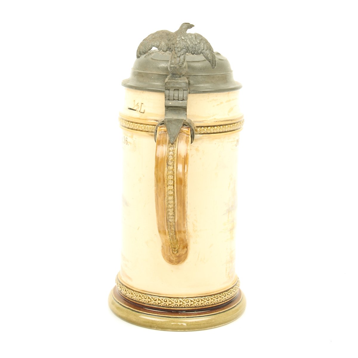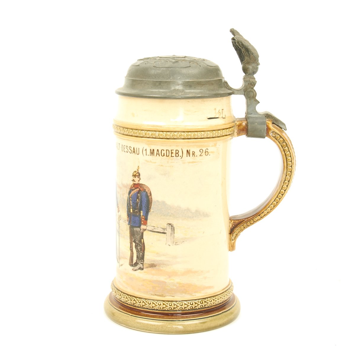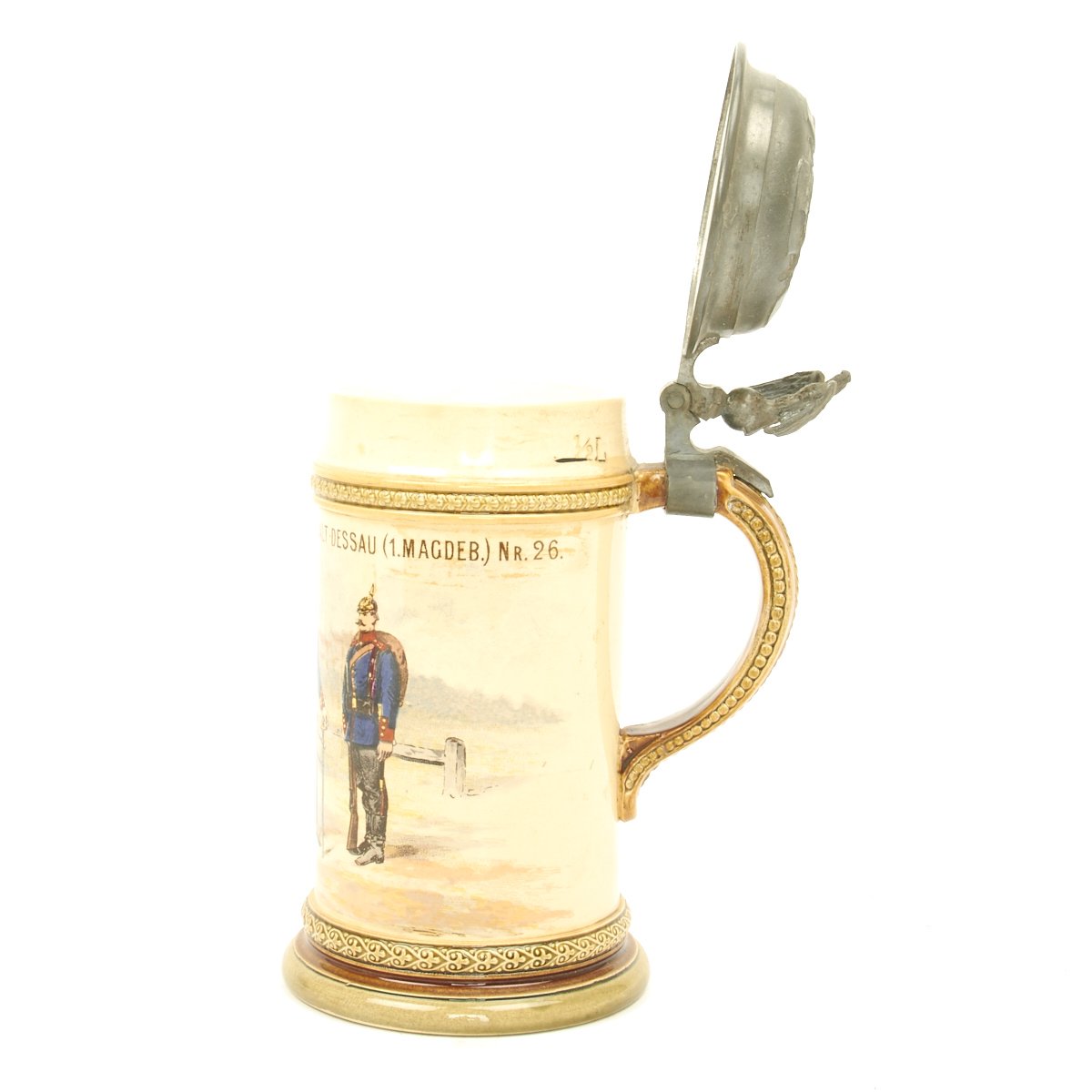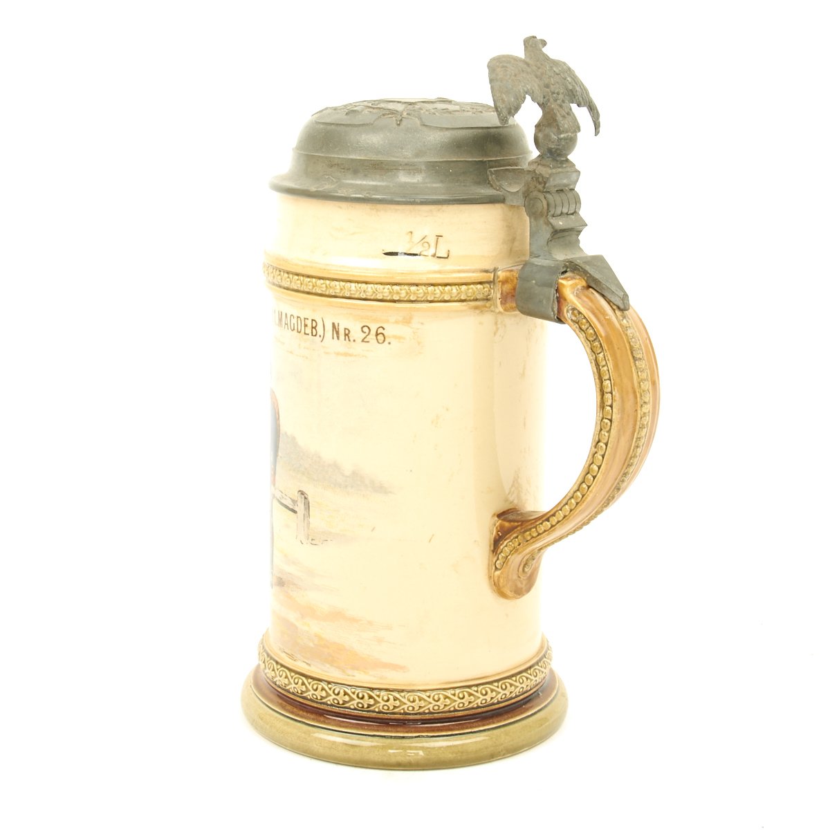 Authentic ca. 1890-1914 steins were available in pottery, porcelain, glass and metal. Regardless of what the stein was made of, almost all had pewter lids. The most common sizes are half-liter and one-liter. The beginning of WW I effectively ended the production of regimental steins as labor and materials were diverted to the war.