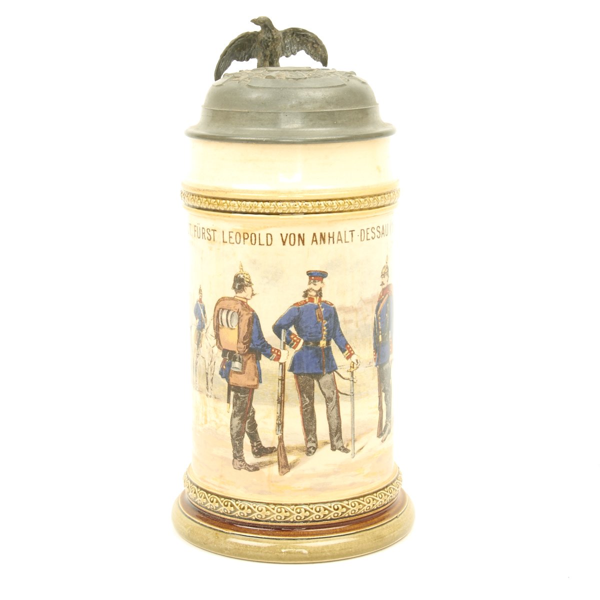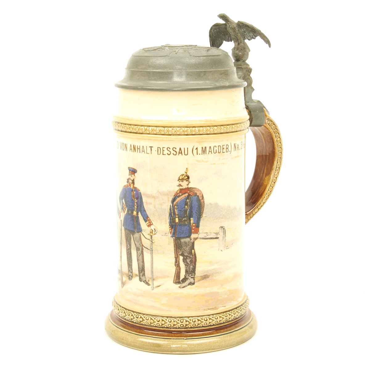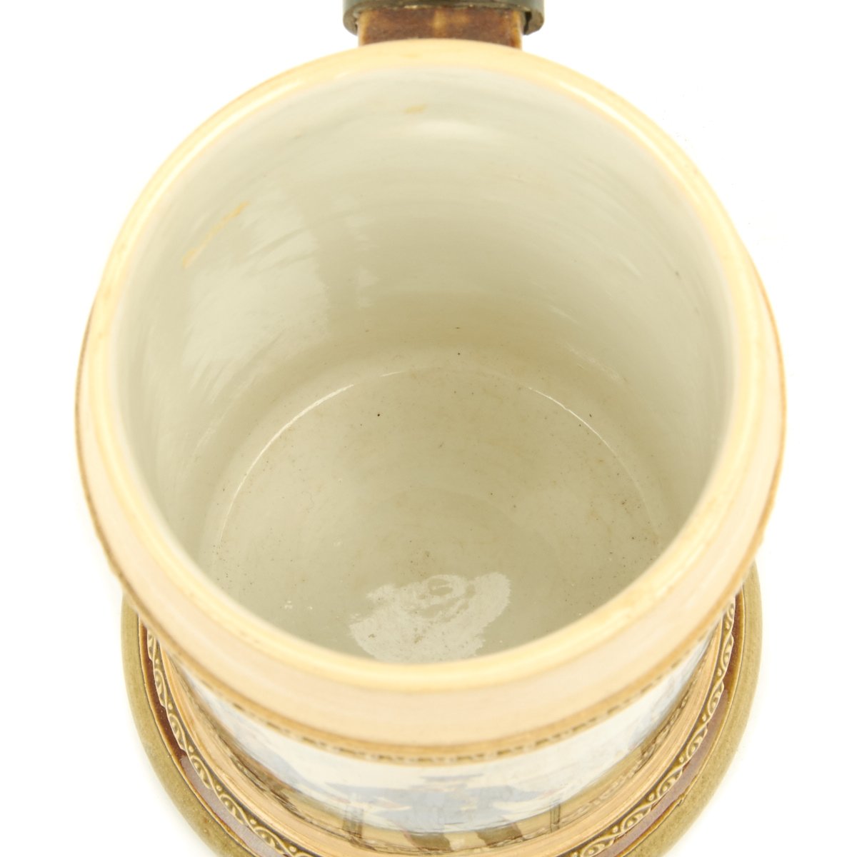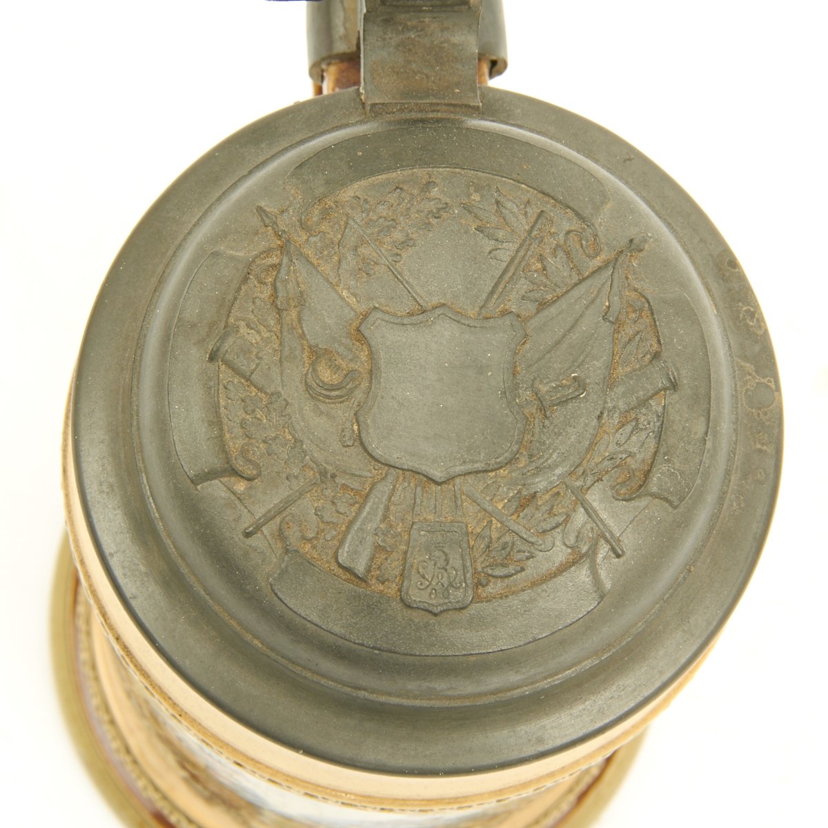 Authentic ca. 1890-1914 steins were available in pottery, porcelain, glass and metal. Regardless of what the stein was made of, almost all had pewter lids. The most common sizes are half-liter and one-liter. The beginning of WW I effectively ended the production of regimental steins as labor and materials were diverted to the war.