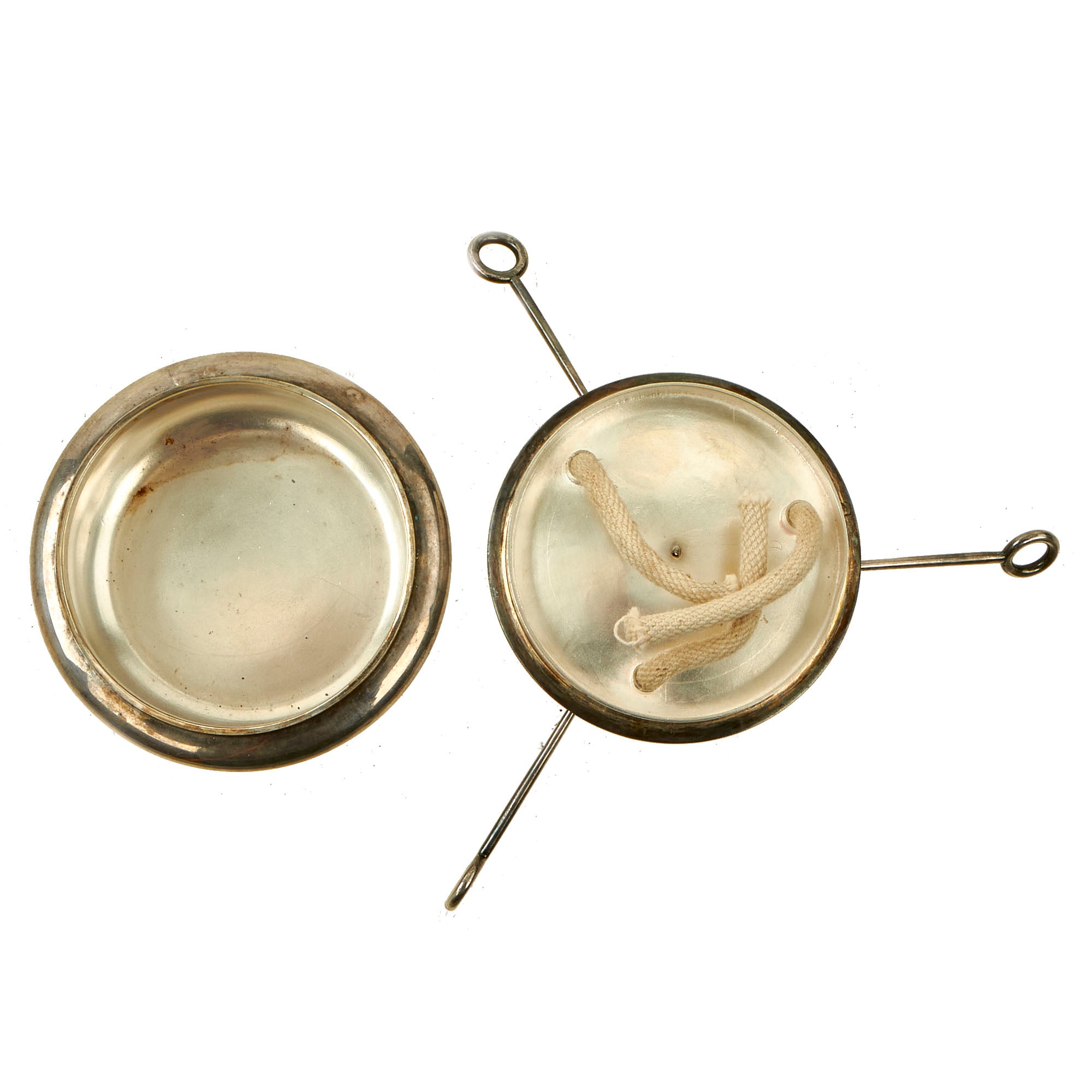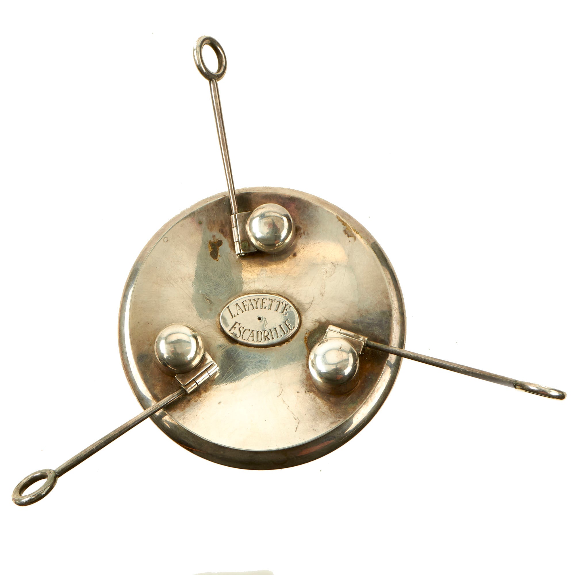 Here we have a lovely silver plated triple cigar lighter, consisting of a bowl bottom, with a triple wick top. The end of each wick has a handle that moves a rotating cover to snuff out the wick. It measures about 4 inches across, not counting the cover handles. The center of the top dish has a plaque reading LAFAYETTE / ESCADRILLE, and the lighter is overall in great condition. It looks to have had fresh wicks installed, but it is also possible that they are original, an that the lighter was seldom used.