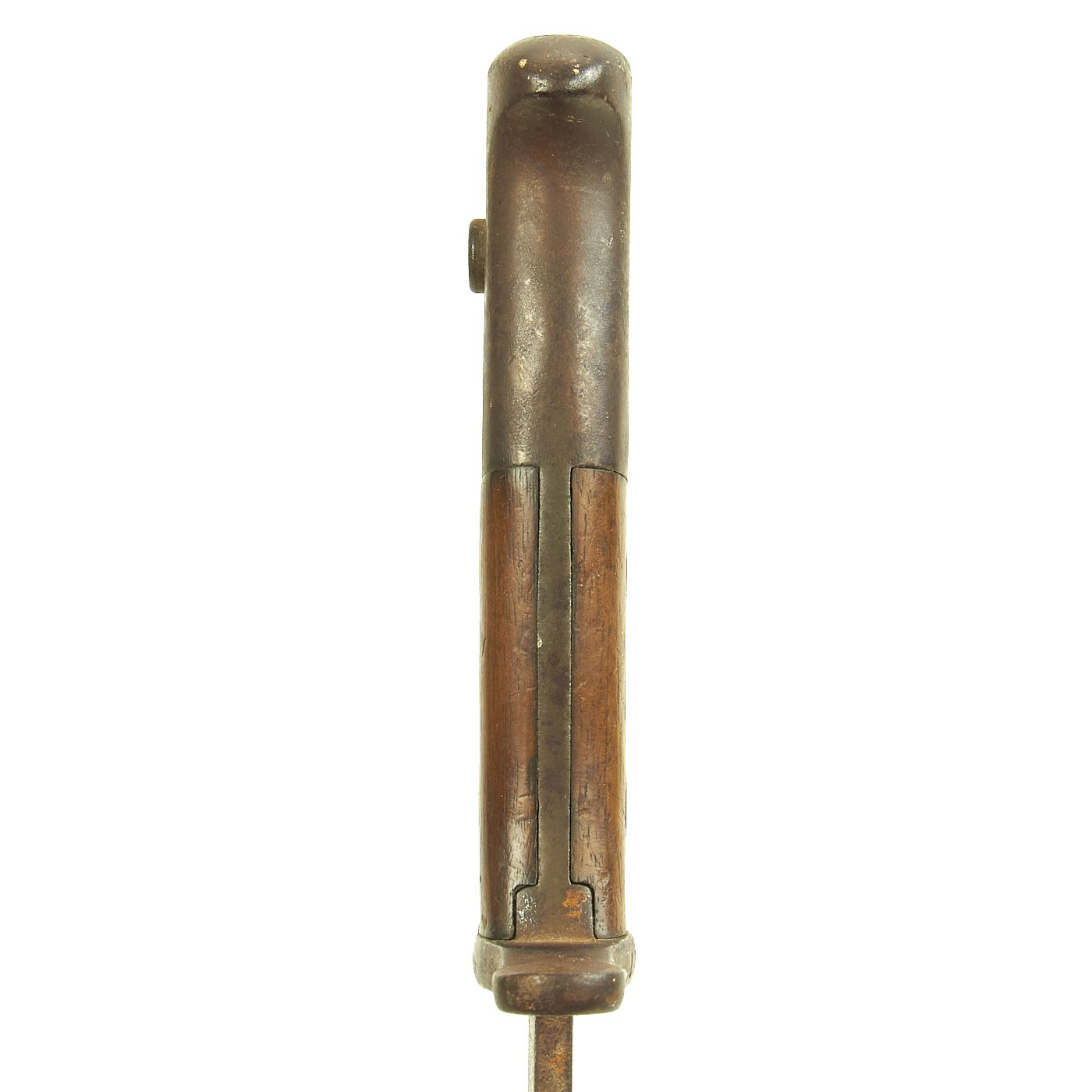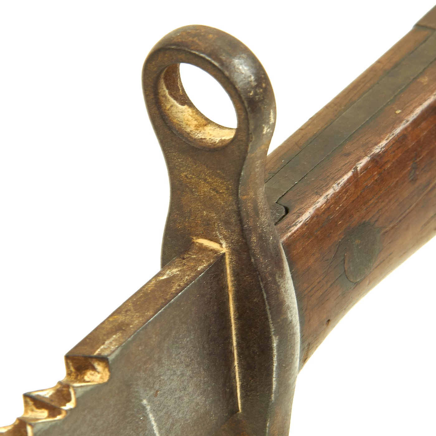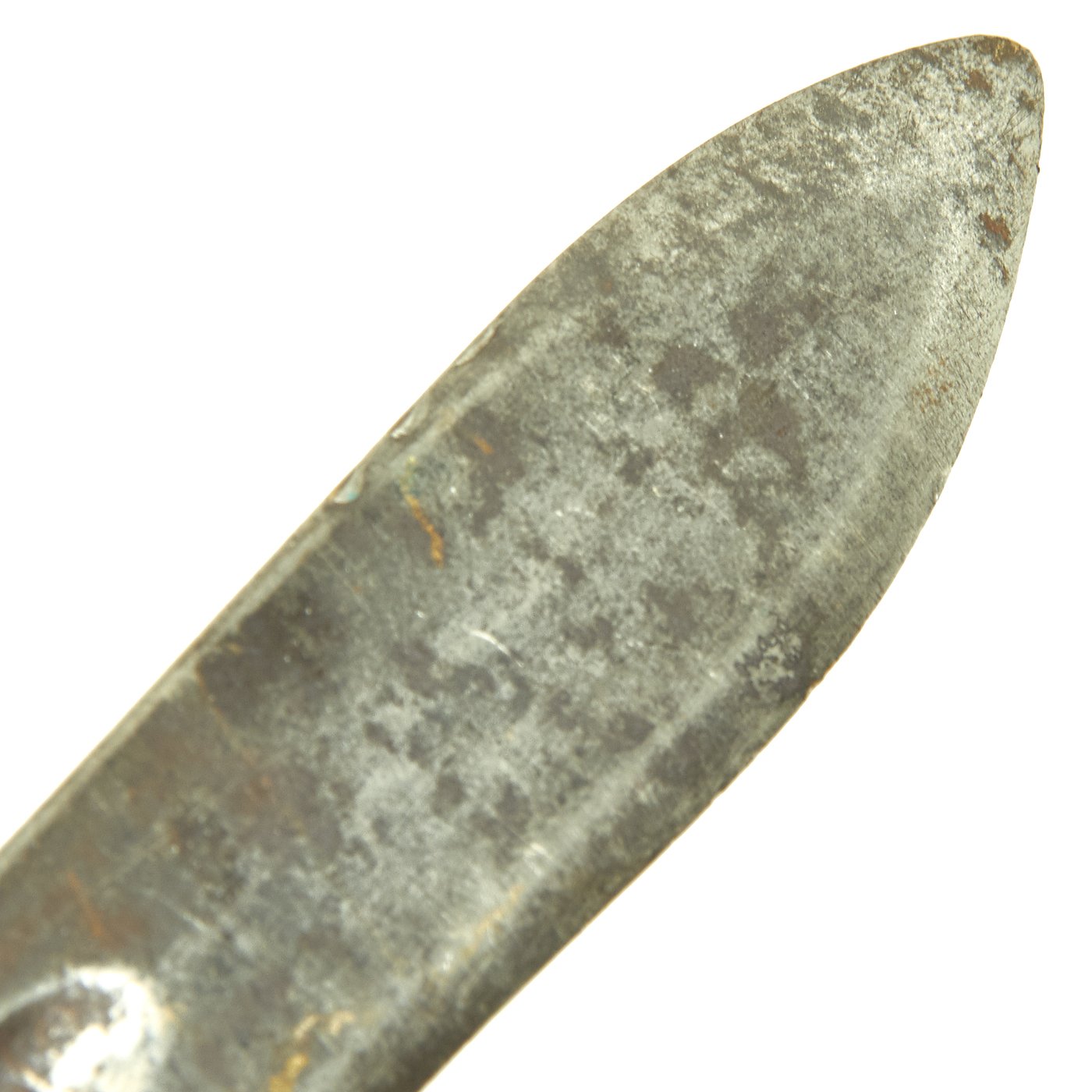 This example is in good condition condition, with a lovely worn patina from age and use in the field. As it does not have a scabbard, there was little to prevent light overall oxidation from being many years old. There is still a clear maker mark on the ricasso: