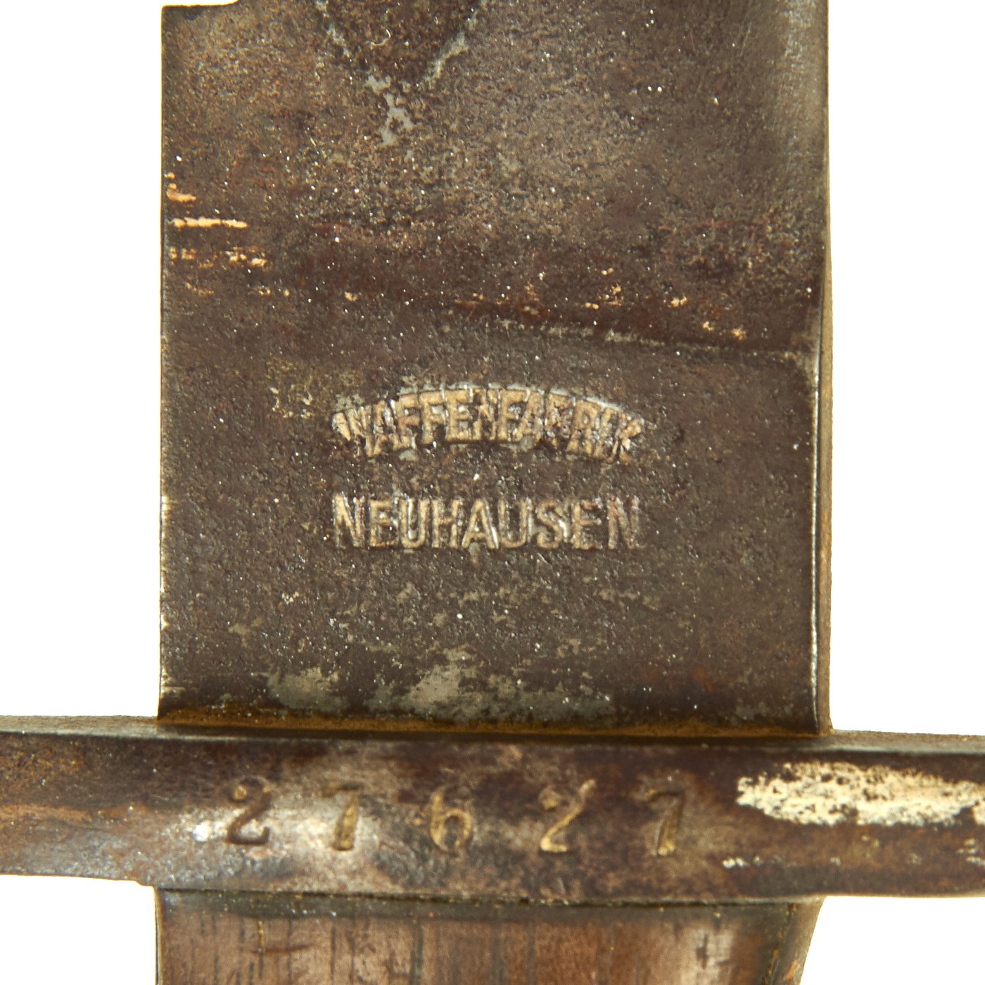The name simply translates to "Weapons Factory Neuhausen," which was one of the primary edged weapon suppliers in the first half of the 20th century. The blade edge does show some sharpening, with some wear to the tip, but is still nice, with a sharp sawback. A beautiful example of the unique "swell-point" shape. There is a Swiss Cross proof mark on the top of the cross guard, with serial number 27627 marked on the side.