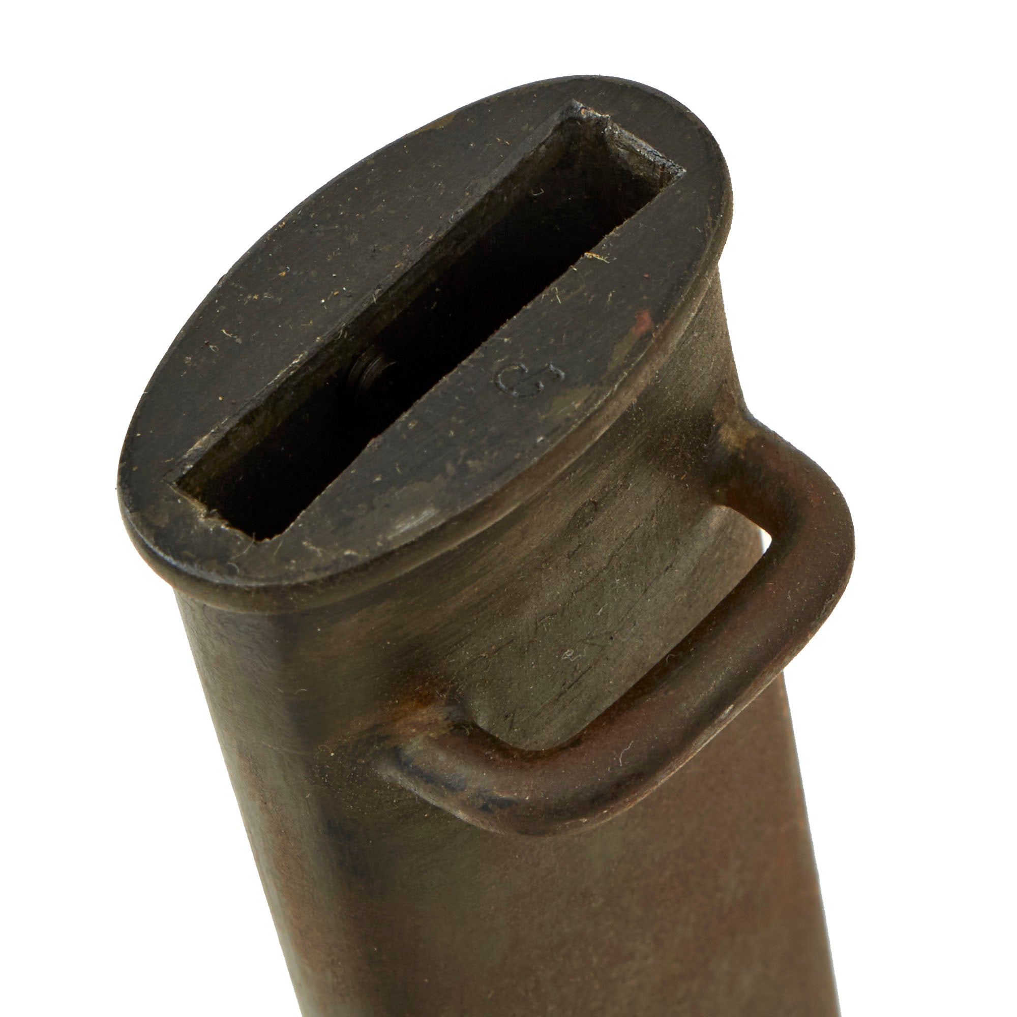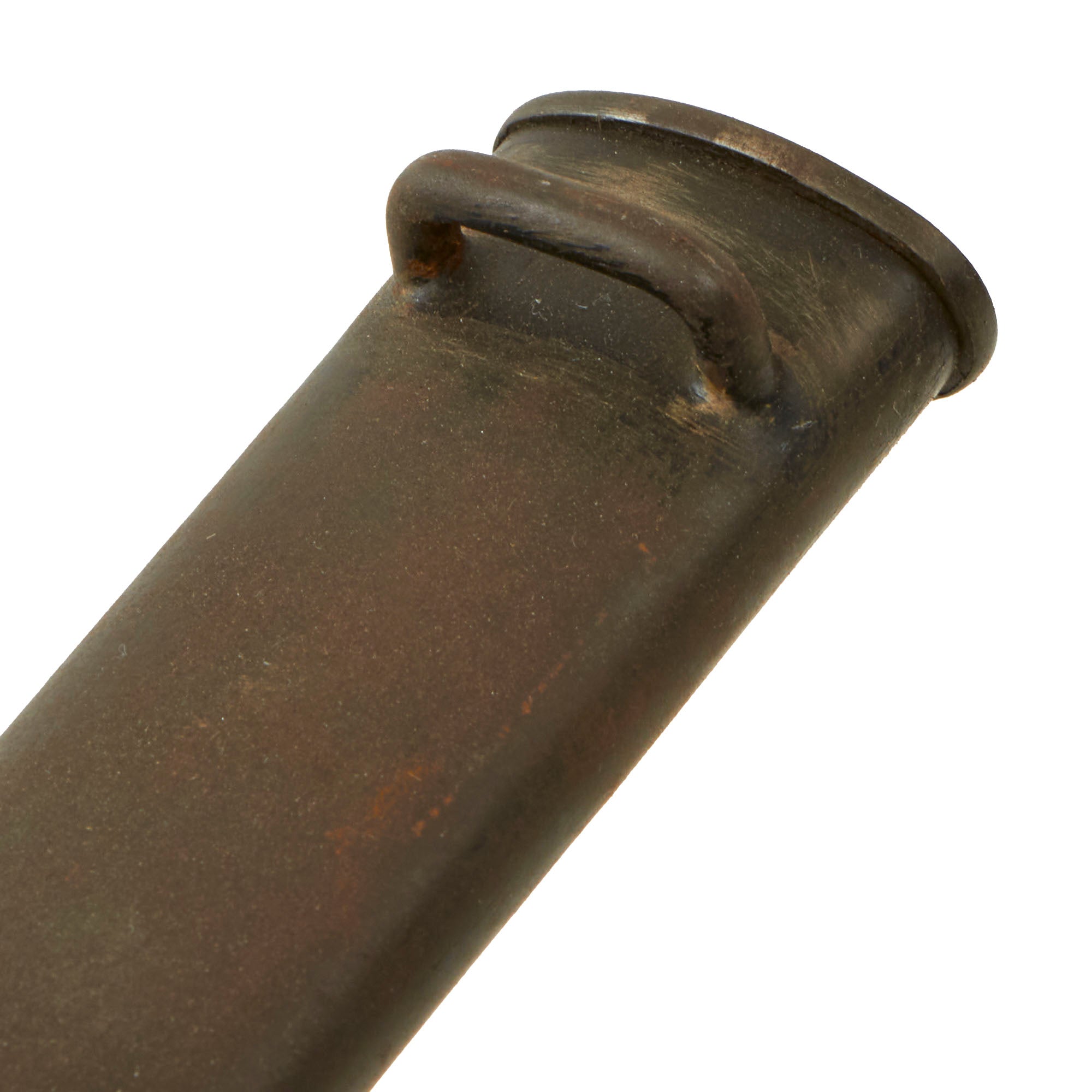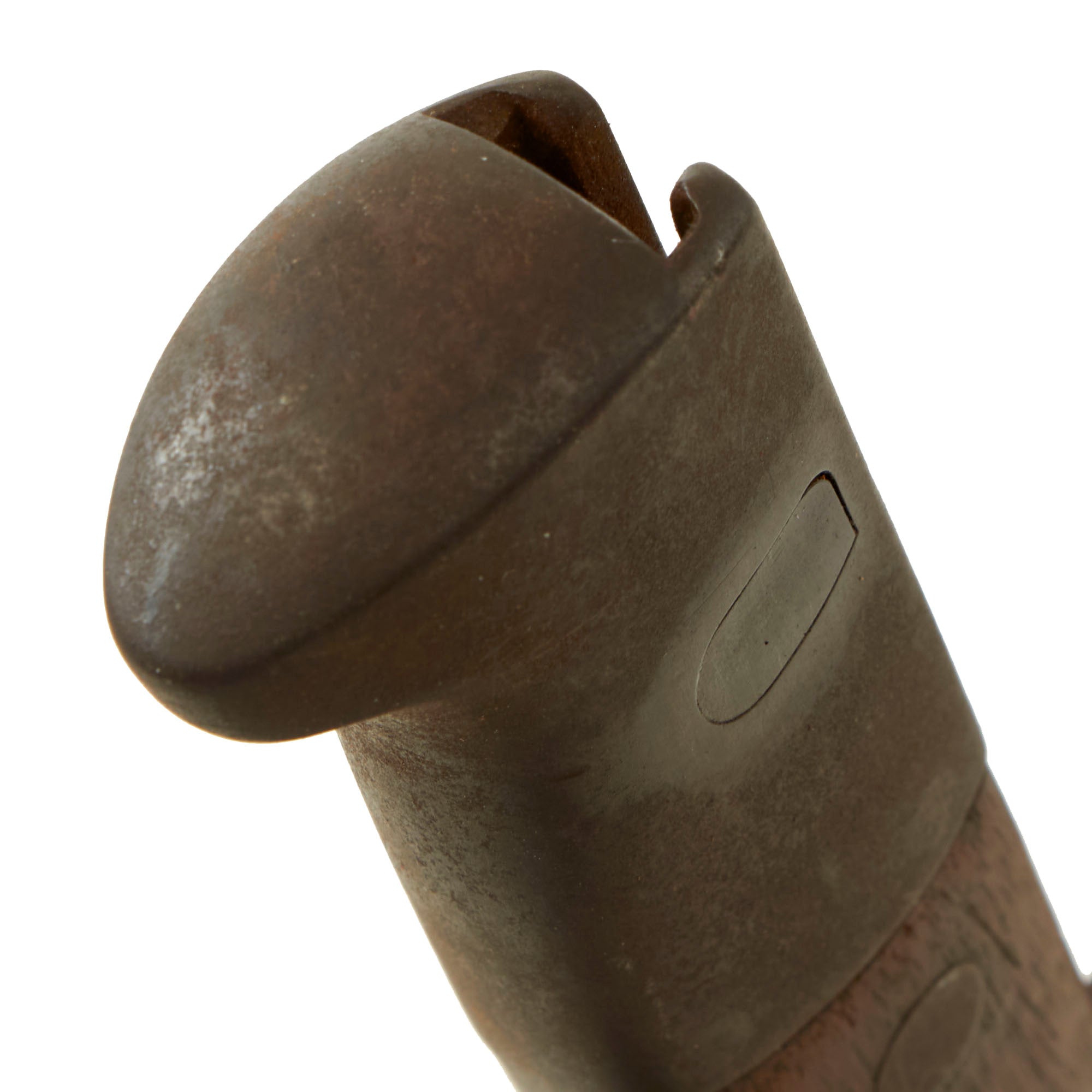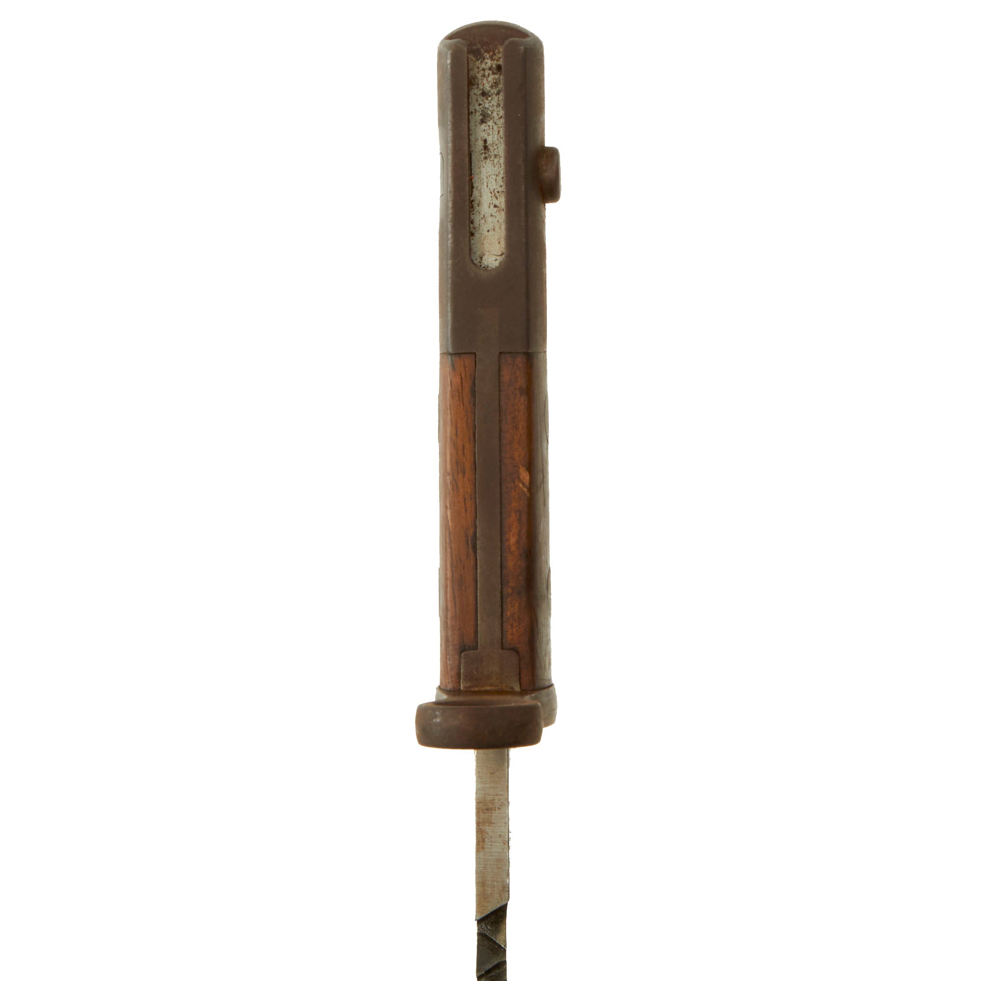 Based on the Vetterli Saw Back bayonet of 1878, used by both the Swiss and Italians, the steel mounted leather scabbard of the early 1914 production was soon replaced with an all steel scabbard. The bayonet is quite long, being 24 inches in overall length, with a 19 inch long sawback blade. These were intended for use on the 7.5 mm Schmidt-Rubin M1911 carbine and M1931 Short Rifle (K31).