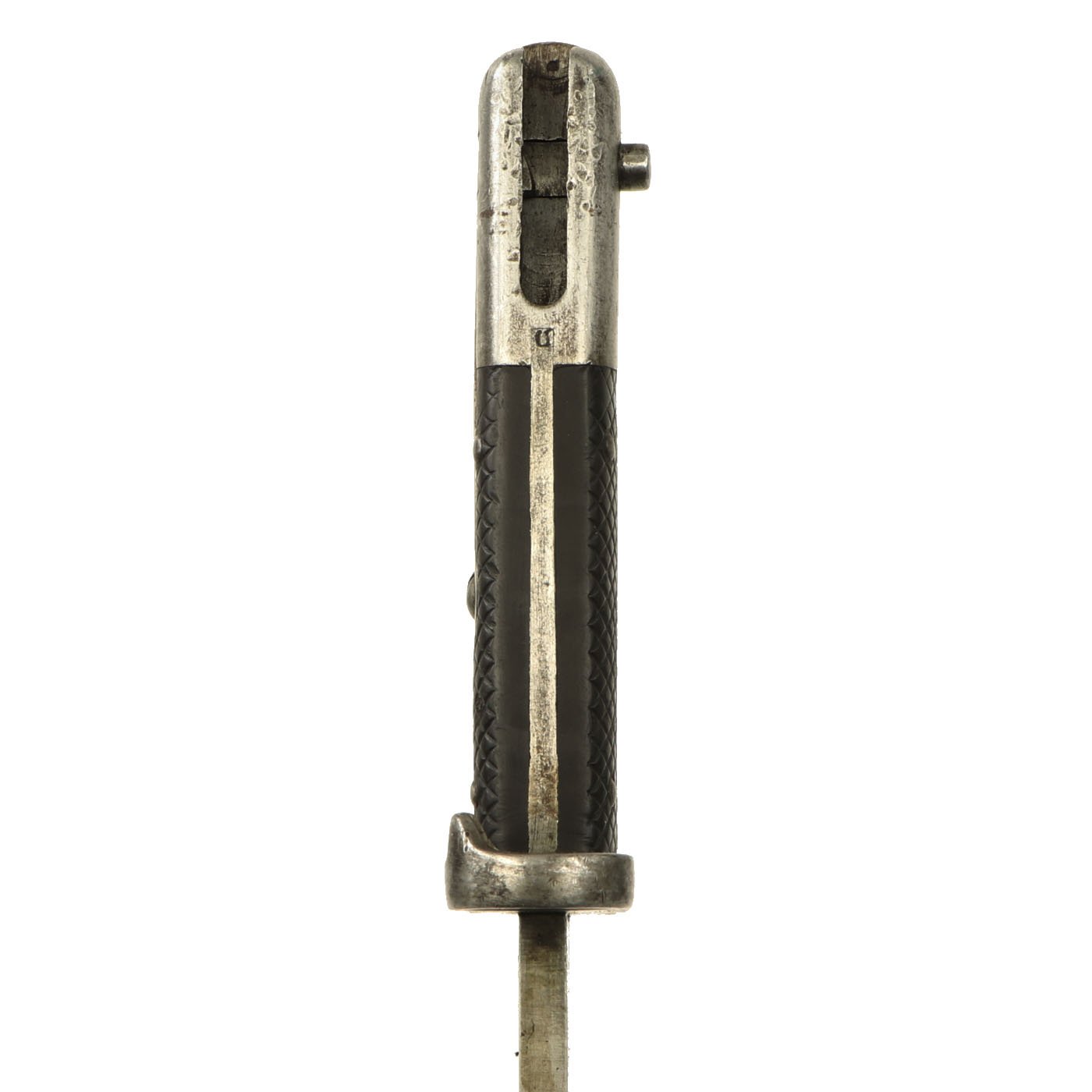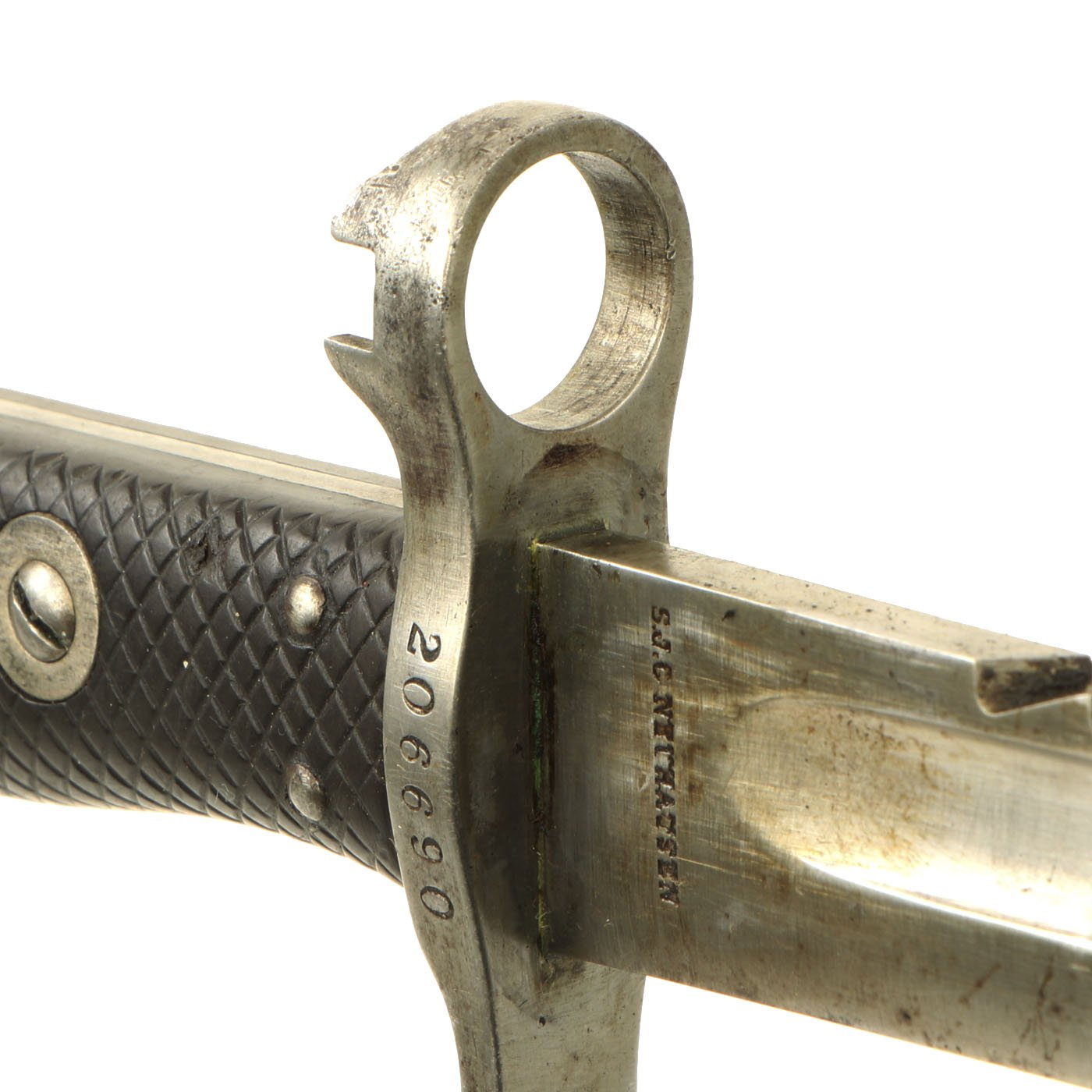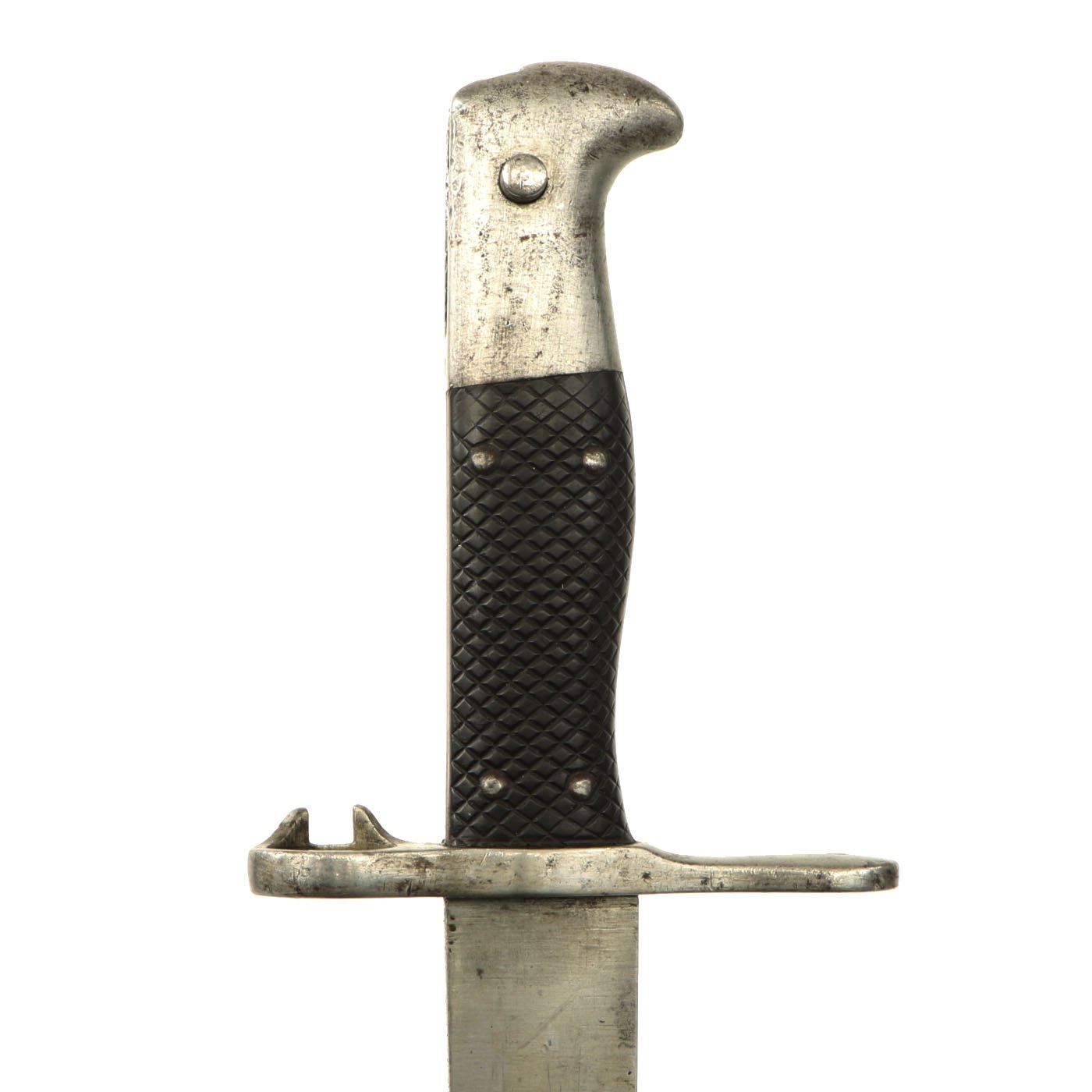 Original Item: Only One Available. In lovely condition, this rare type of bayonet for the Swiss Vetterli rifle is featured in THE BAYONET BOOK by Watts & White on page Page 269, item 600, in the SWISS SECTION. Pictured is the 3 Rivet Grip M1881 version, but the text mentions this, the early 4 rivet M1878 version. The bayonet features a straight spearpoint sawback blade of 19", with a steel cross guard marked with serial number 206690. Overall length is 23 3/4 inches, and the blade has an interesting main edge that is only ground from one side of the blade, leaving the other side flat, except on the false edge. The blade is maker marked S.J.G. NEUHAUSEN on the ricasso and is in very good condition, with just a bit of staining. It shows very little sign of ever having been used.