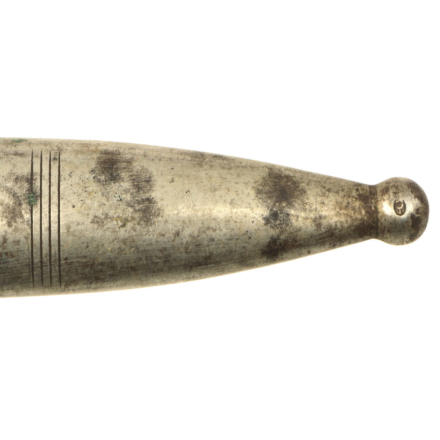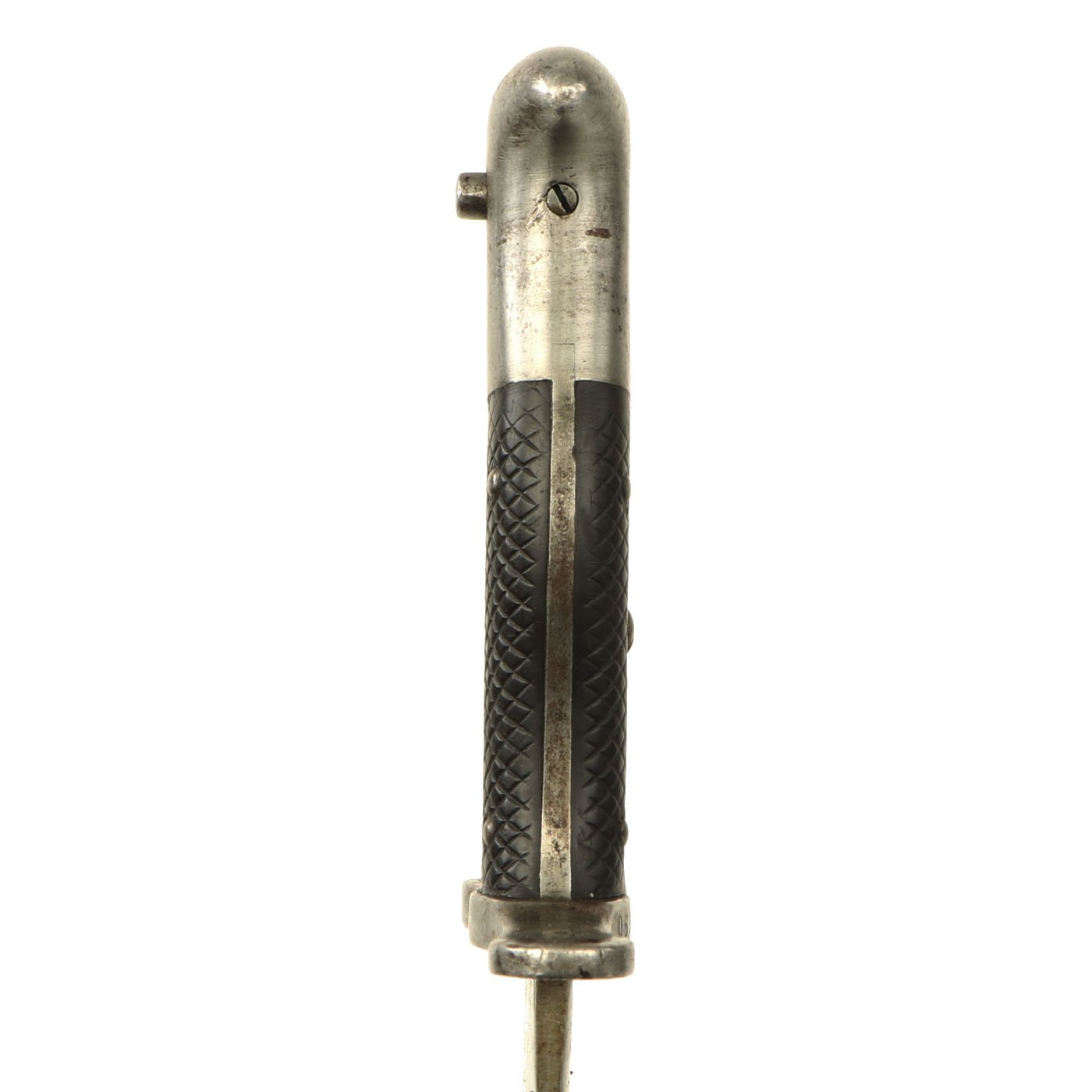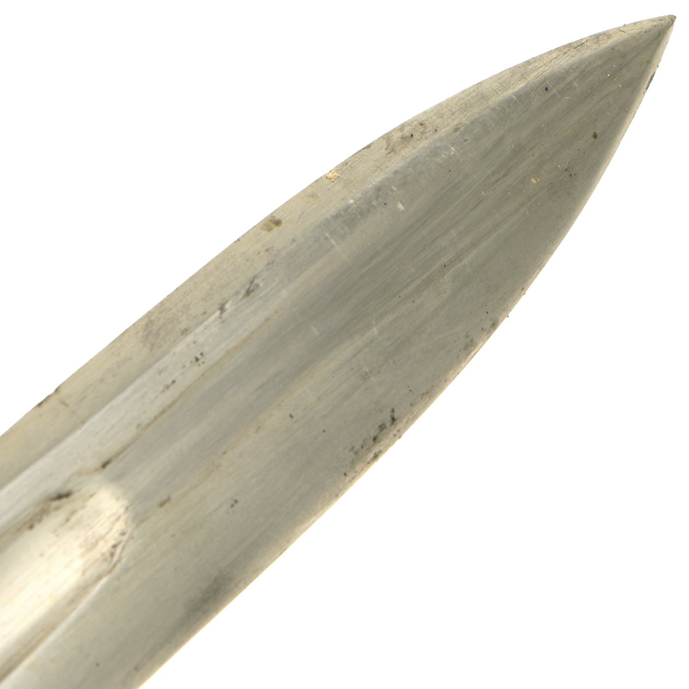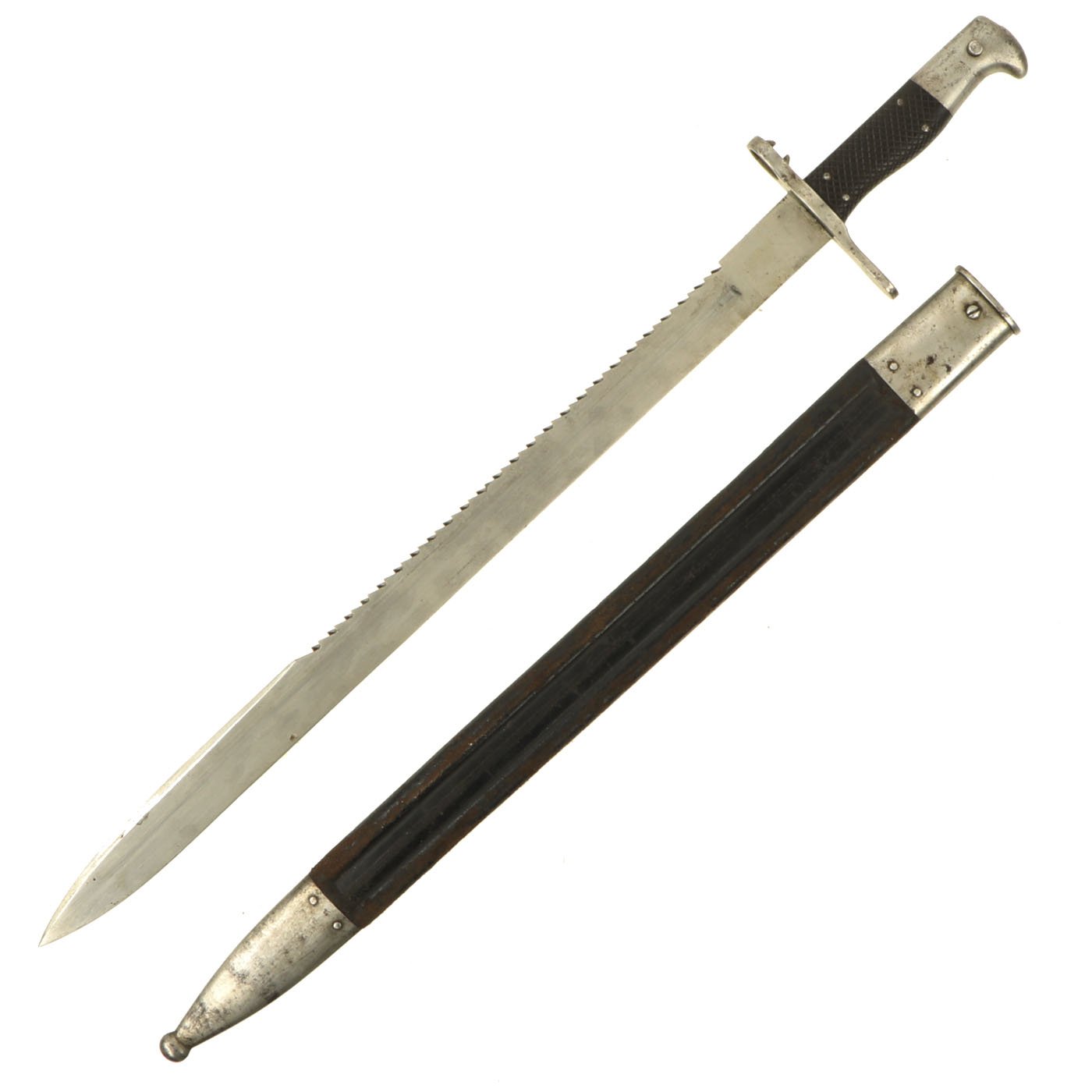 Original Item: Only One Available. In lovely condition, this rare type of bayonet for the Swiss Vetterli rifle is featured in THE BAYONET BOOK by Watts & White on page Page 269, item 600, in the SWISS SECTION. Pictured is the 3 Rivet Grip M1881 version, but the text mentions this, the early 4 rivet M1878 version. The bayonet features a straight spearpoint sawback blade of 19", with a steel cross guard marked with serial number 206690. Overall length is 23 3/4 inches, and the blade has an interesting main edge that is only ground from one side of the blade, leaving the other side flat, except on the false edge. The blade is maker marked S.J.G. NEUHAUSEN on the ricasso and is in very good condition, with just a bit of staining. It shows very little sign of ever having been used.
