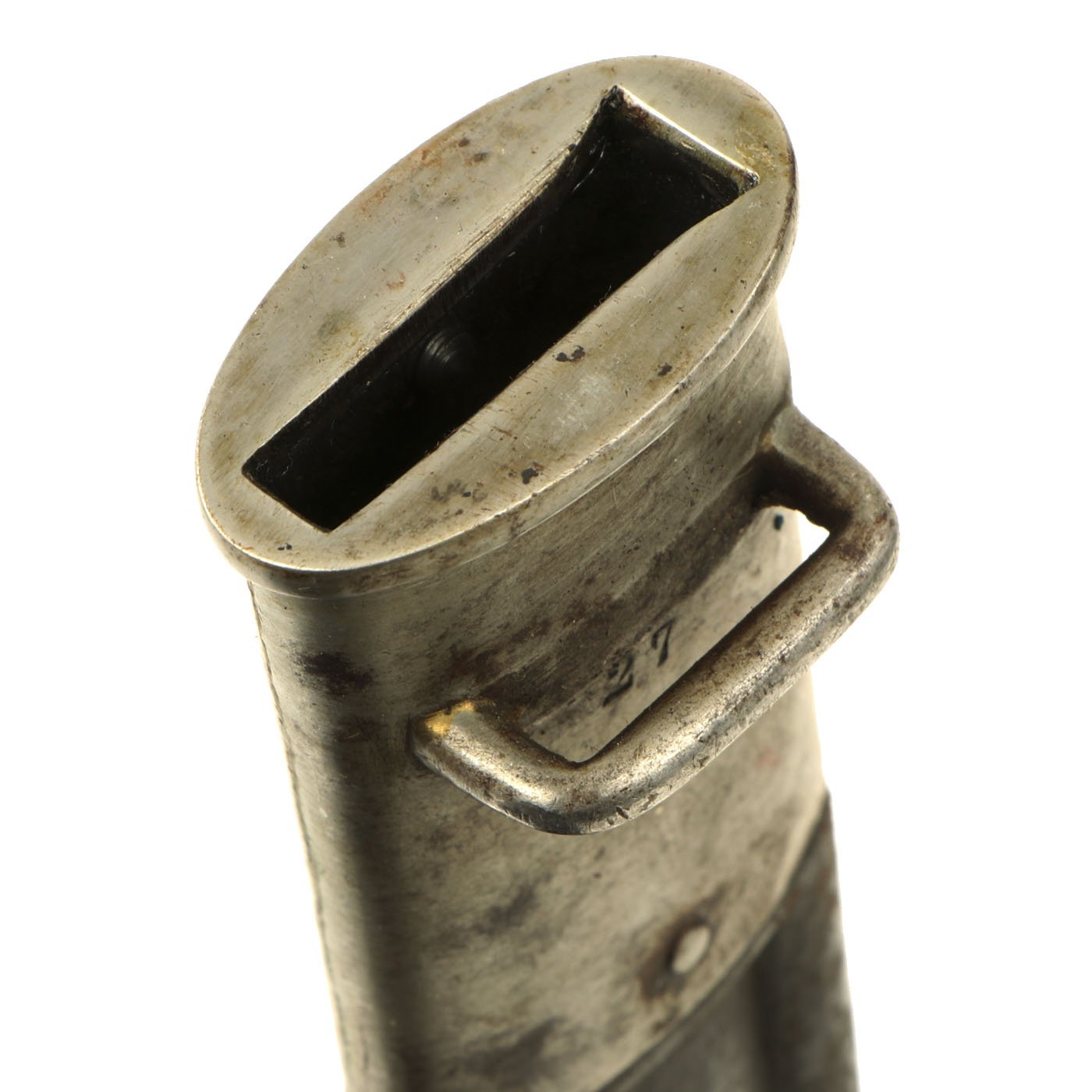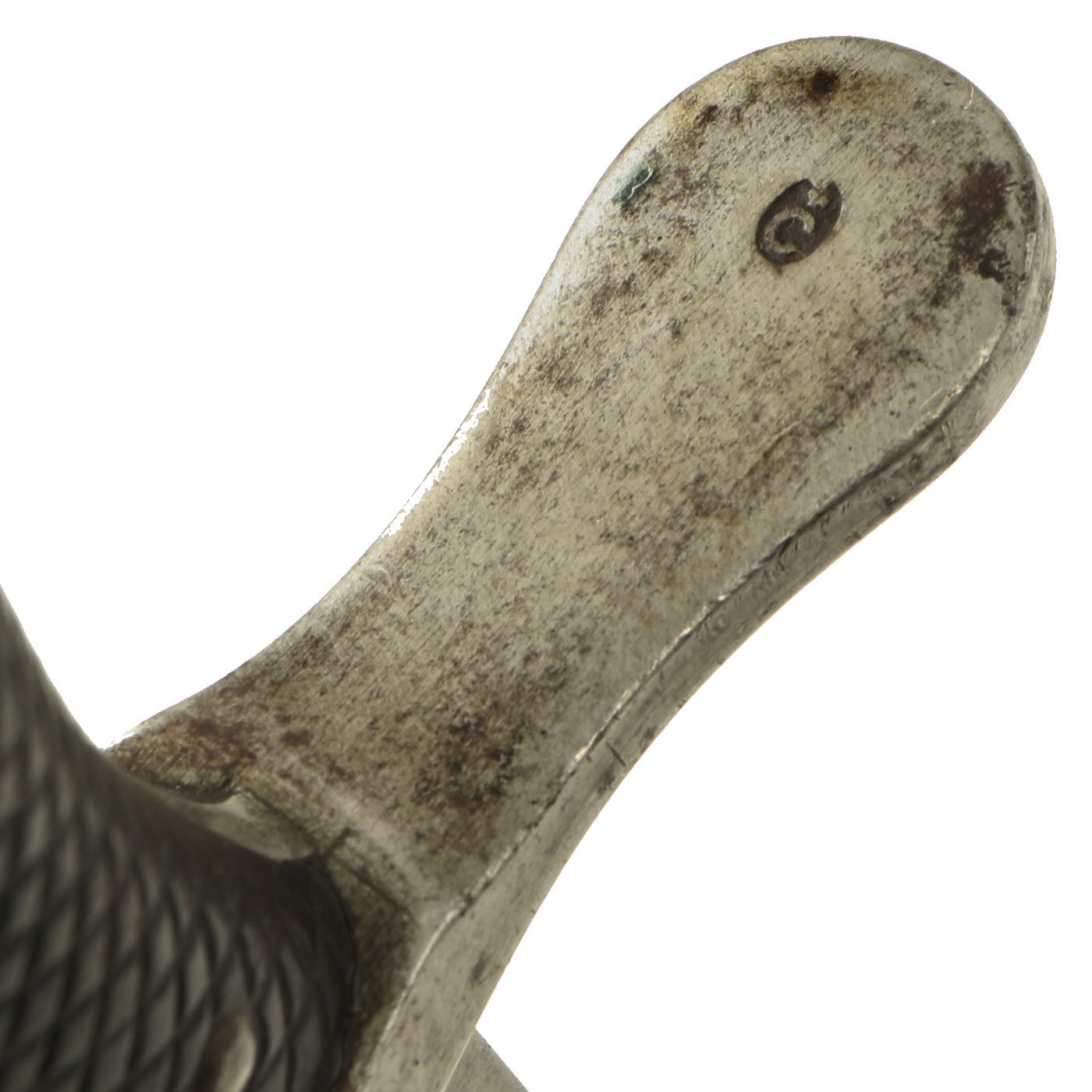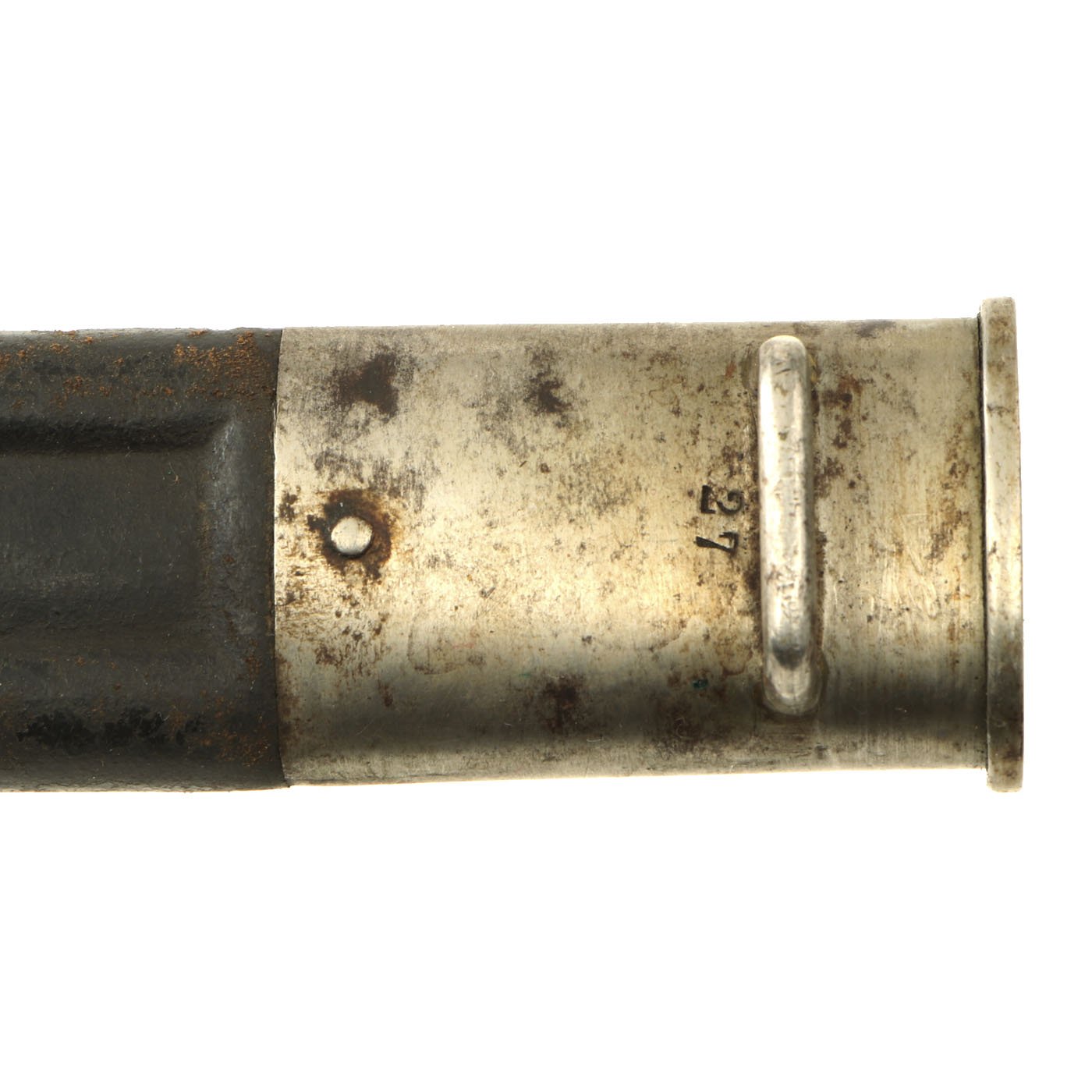 The grip has lovely dark brown gutta percha checkered composite grips retained by 4 rivets, with an old style long leaf spring bayonet catch. There is a bit of wear and oxidation on the metal parts of the hilt, but nothing major. The bayonet is in its original steel mounted leather scabbard, which is in very good condition, and still has most of the original black finish.