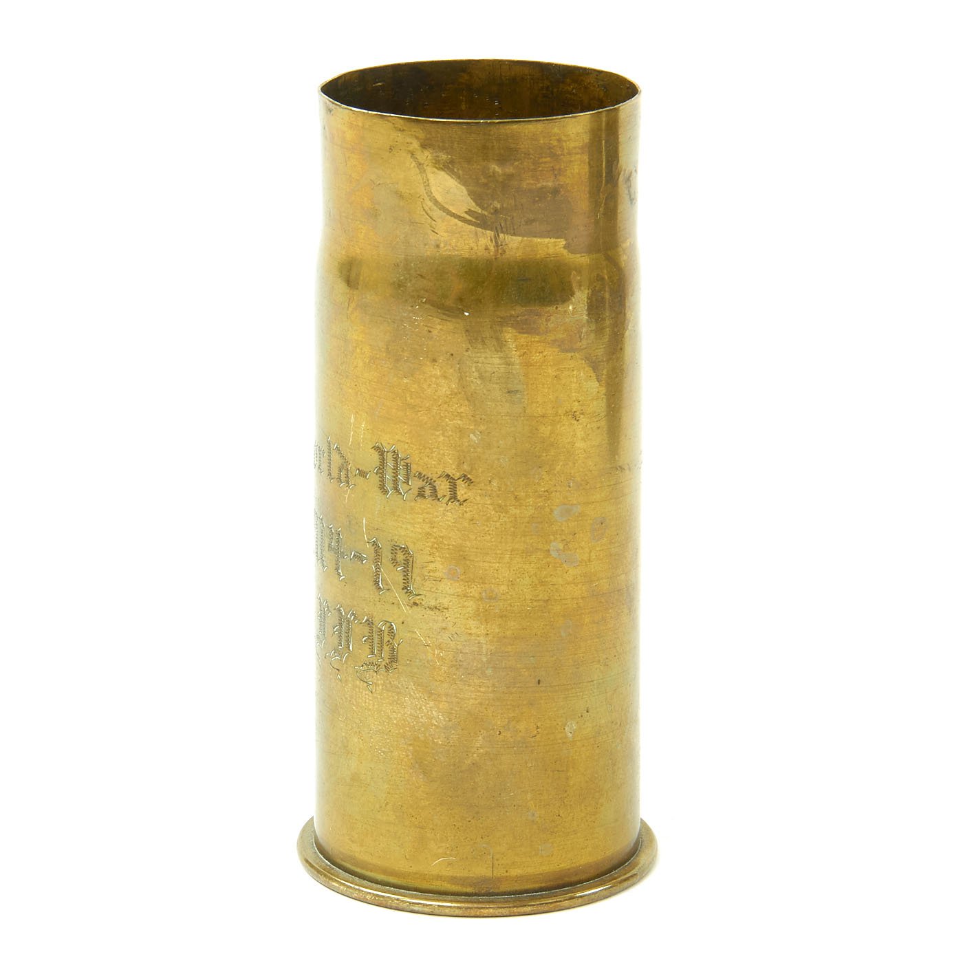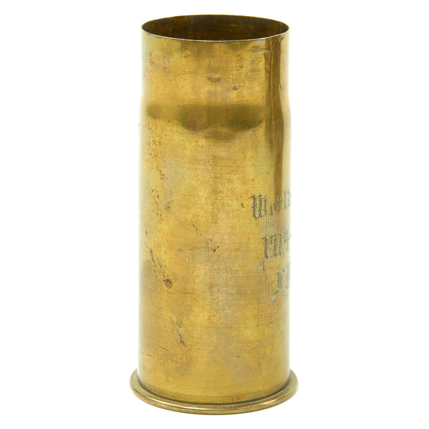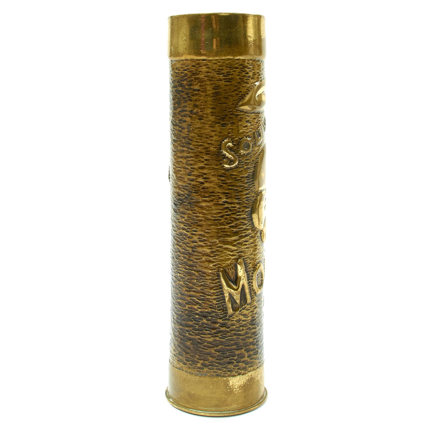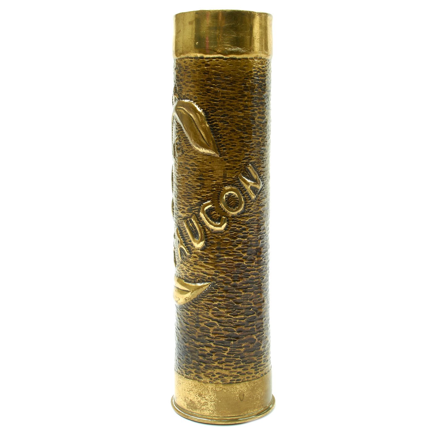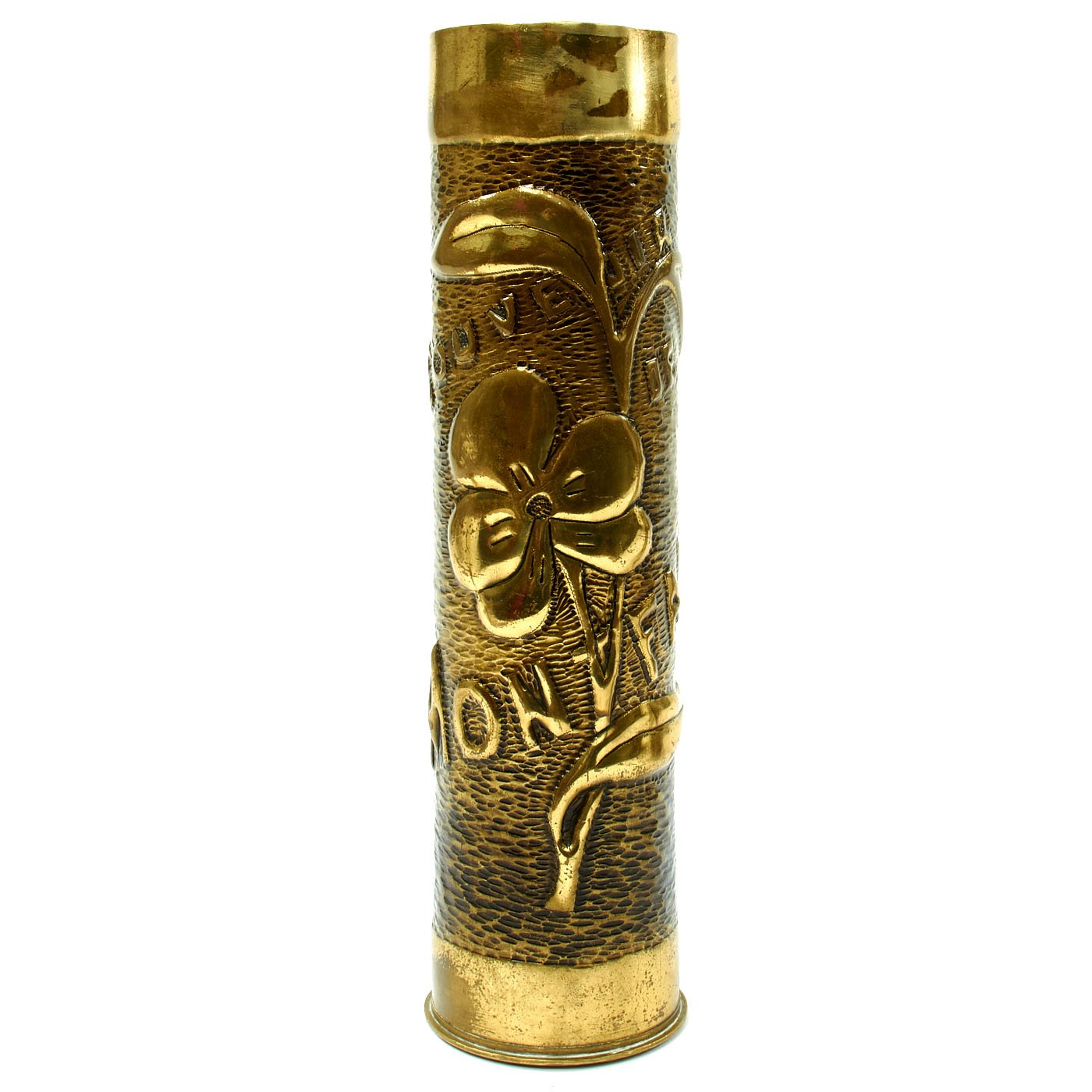 - French 75mm Artillery Shell Casing that measures approximately 12 1/2" tall and 3 1/2" wide this is the classic French WW1 artillery casing in brass of the classic French 75 mm artillery piece. The outer surface has been fully decorated and features a flower and SOUVENUIR DE MONTFAUCON. The shell case is dated with its manufacture date of December 1918. Montfaucon-d'Argonne is a commune in the Meuse department in Grand Est in north-eastern France. It was the focus of a bloody battle during the Meuse–Argonne offensive and is now home to the Meuse-Argonne American Memorial.