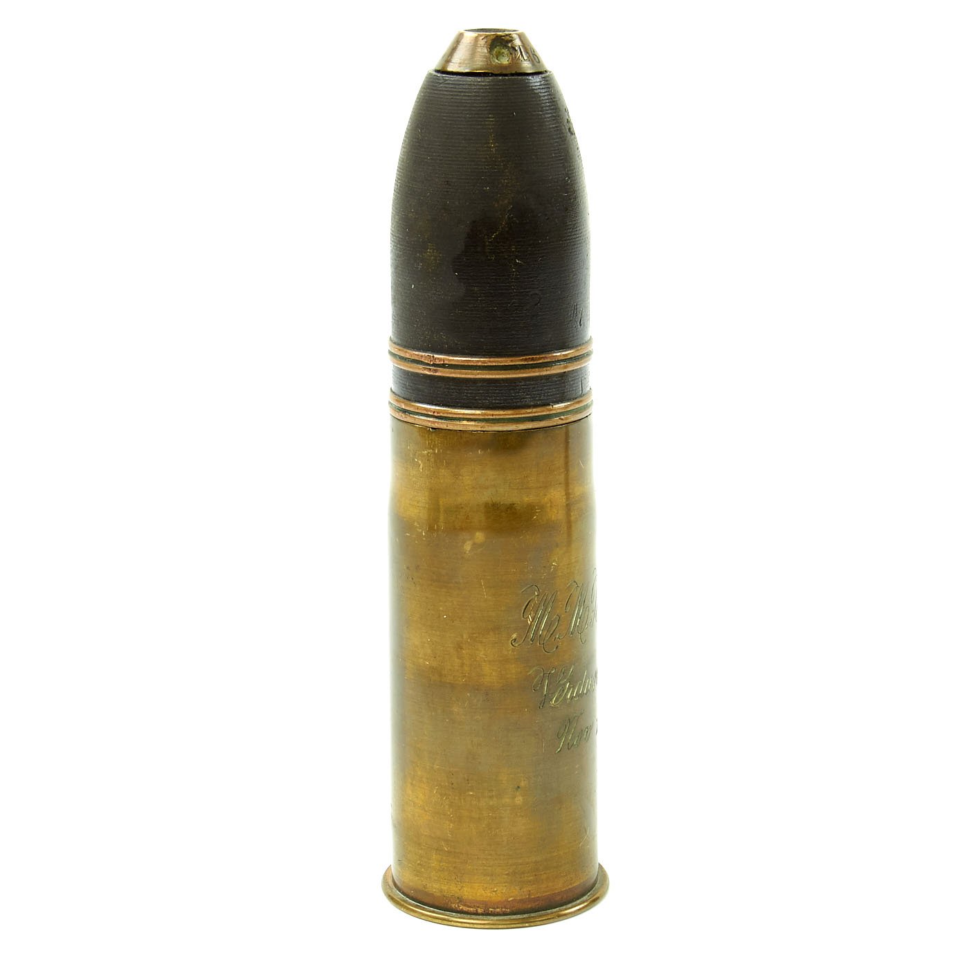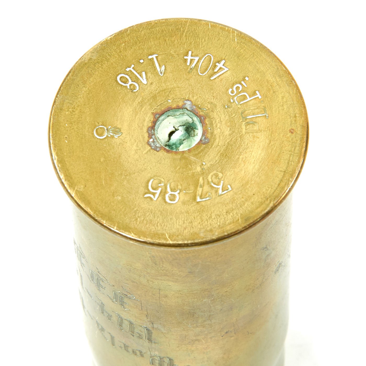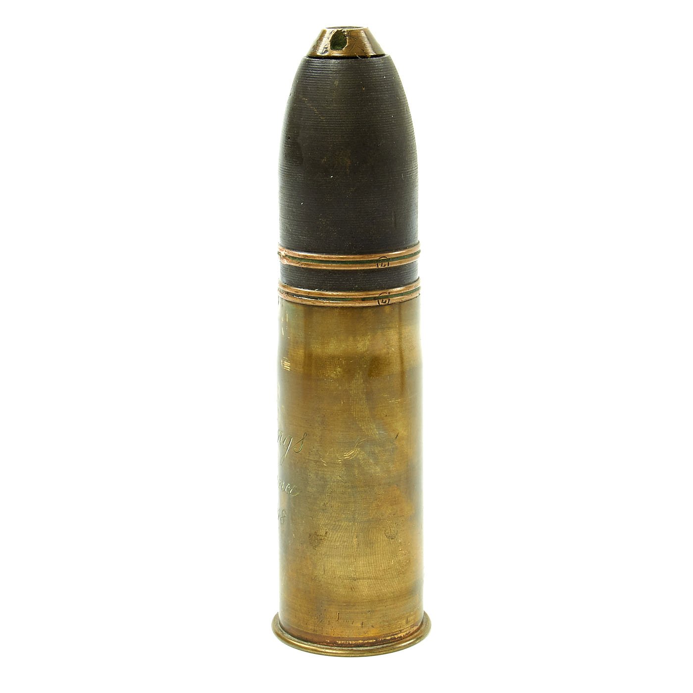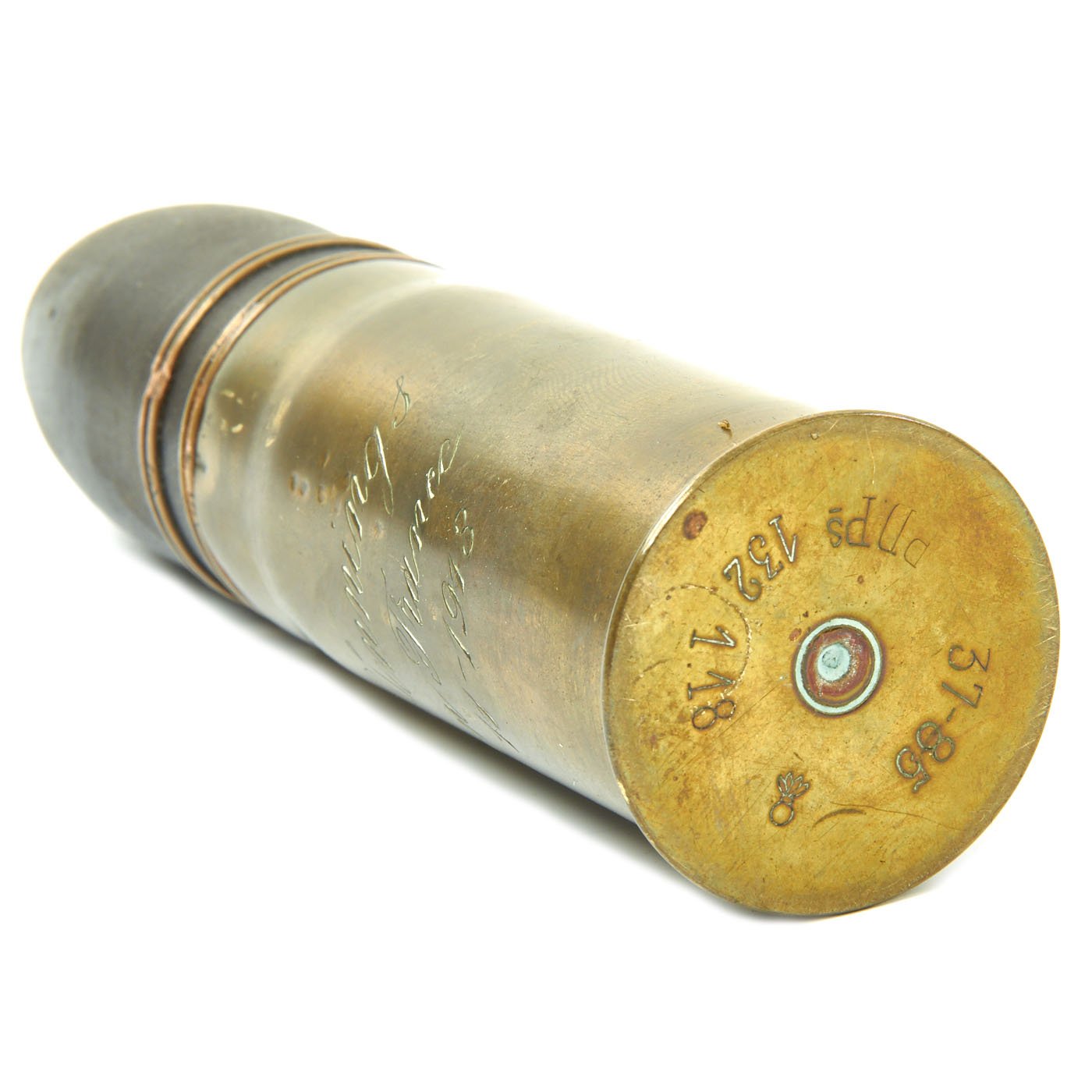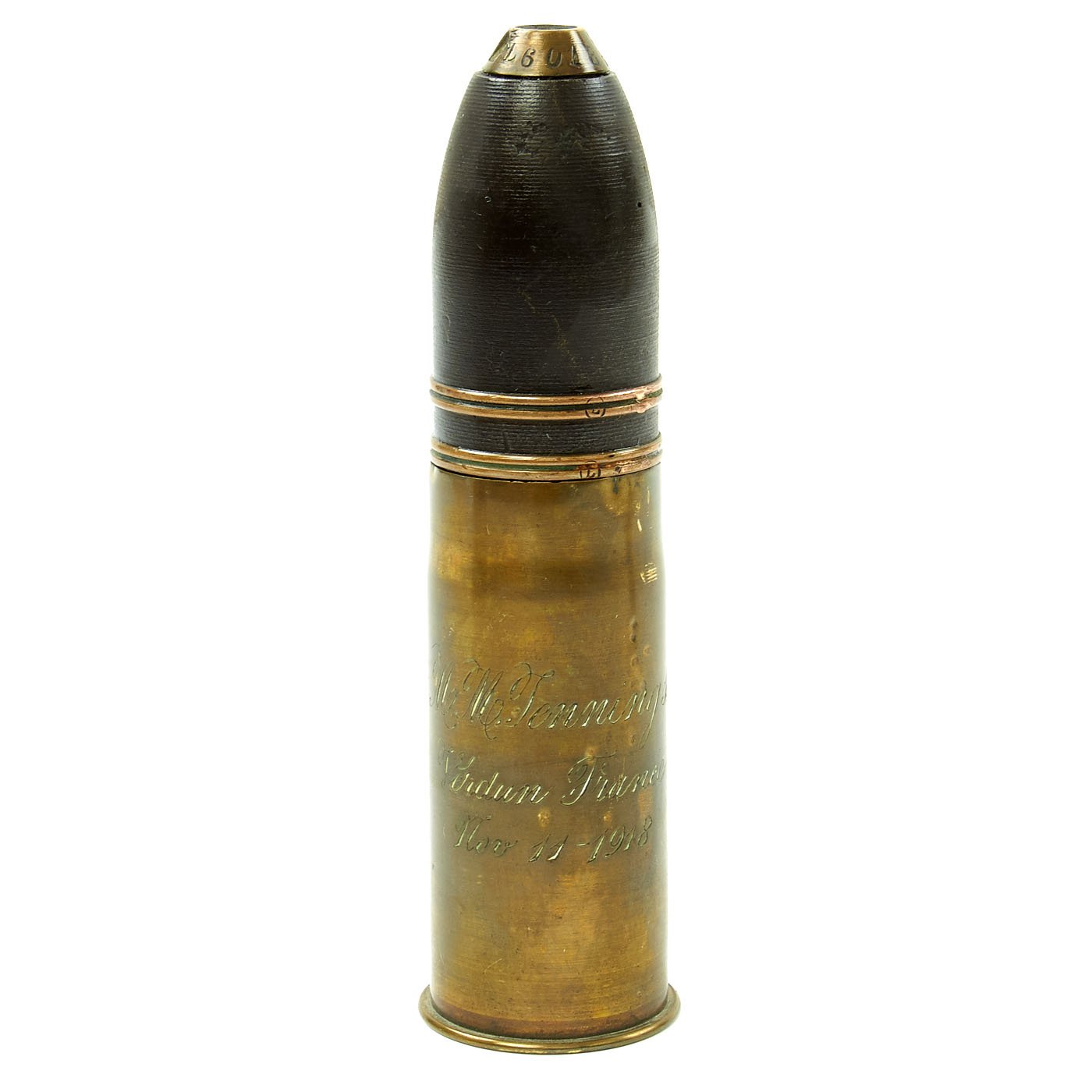 - French M1916 37mm artillery shell with projectile and inert fuze. The casing is engraved with a name and Verdun France Nov. 11 - 1918. The base is is marked PPDs for the factory, “Pouderies de Paris”, and 37-85 which means 37mm model of 1885 as well a 1.18 which is the manufacture date, January 1918.